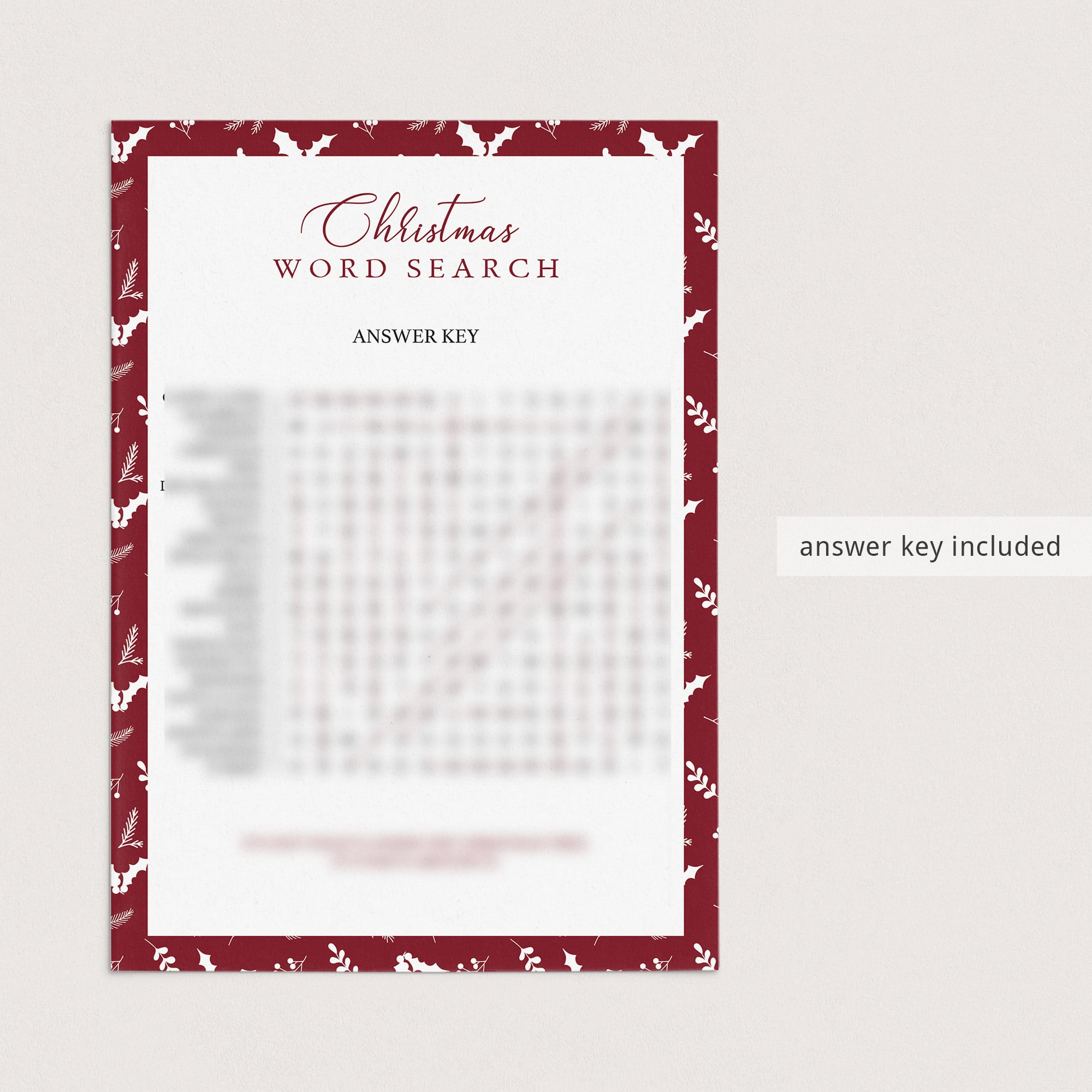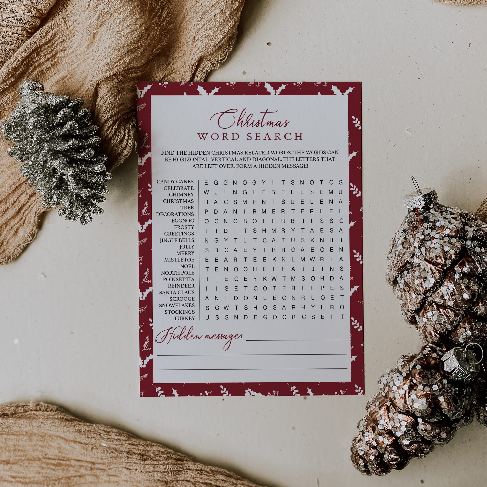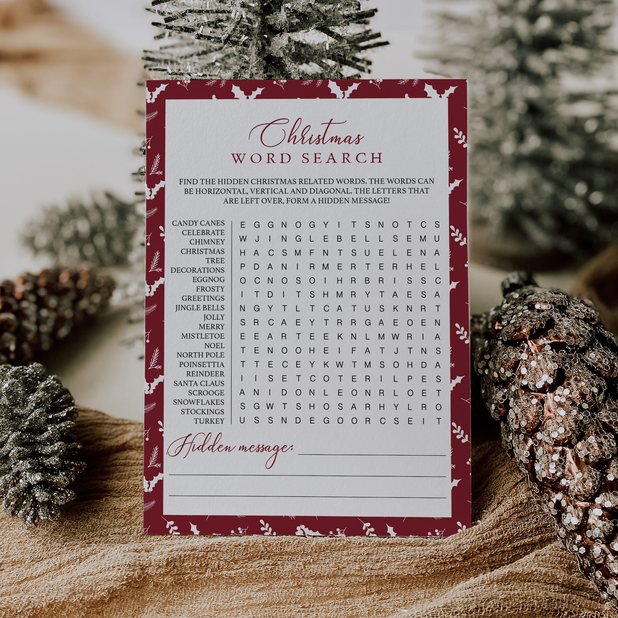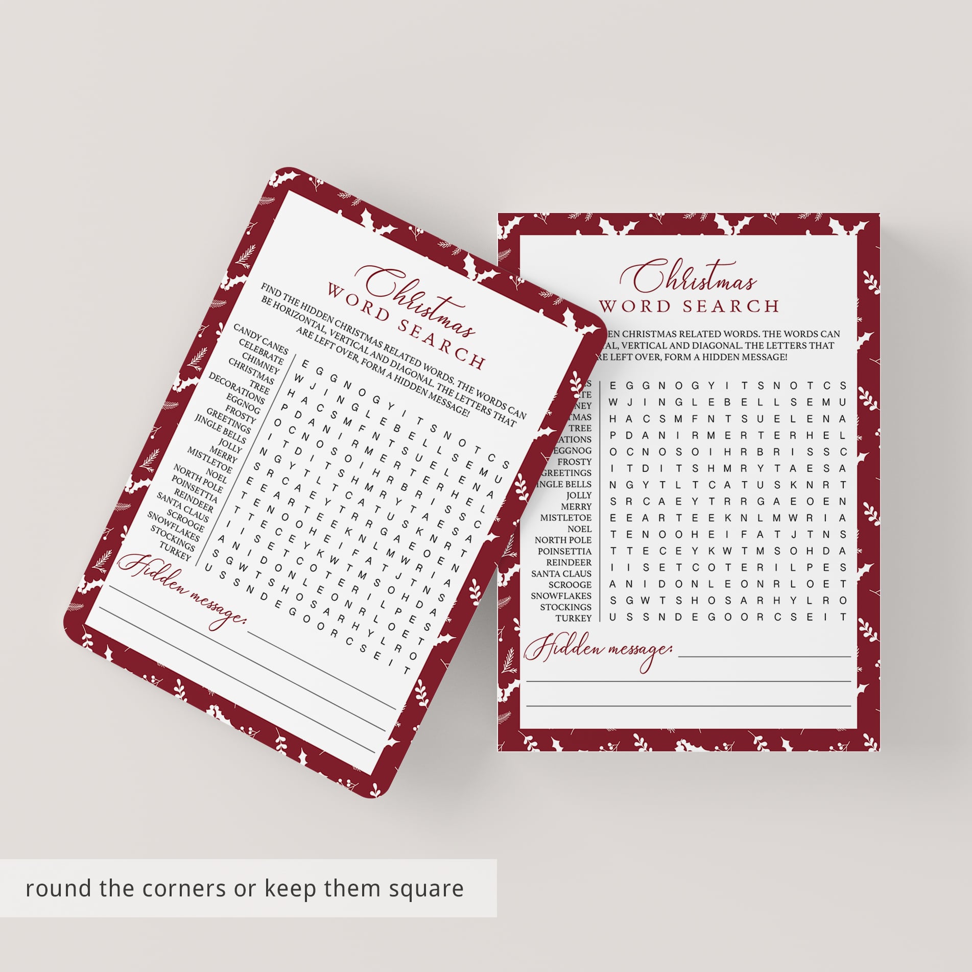 Are you looking for a fun game to play at your holiday party? Play Christmas Word Search with these beautiful red and white game cards.