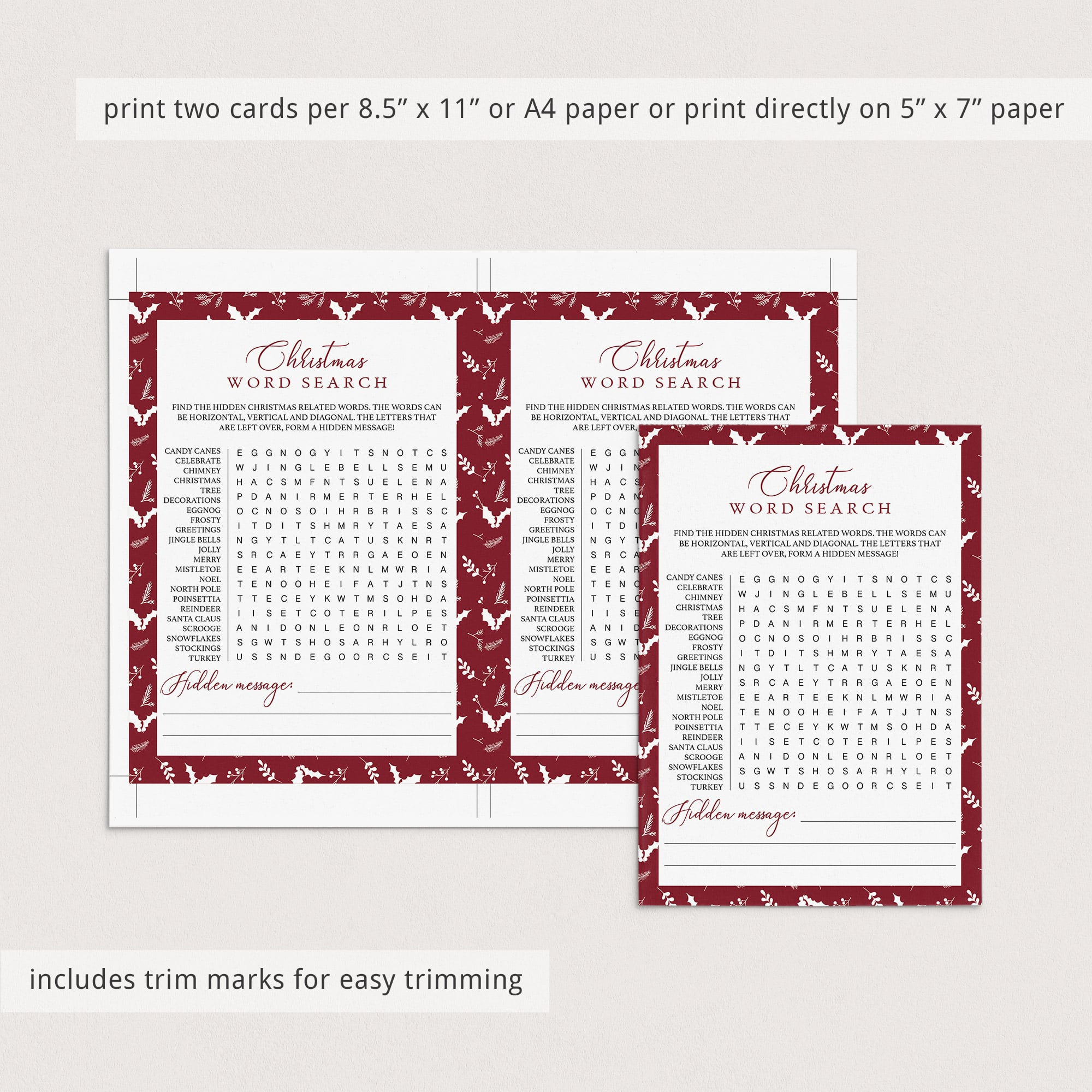 This Christmas Word Search game is an instant download, so simply download and print the cards as many times as you need. Print at the comfort of your home or order the game cards from a local or online print shop.