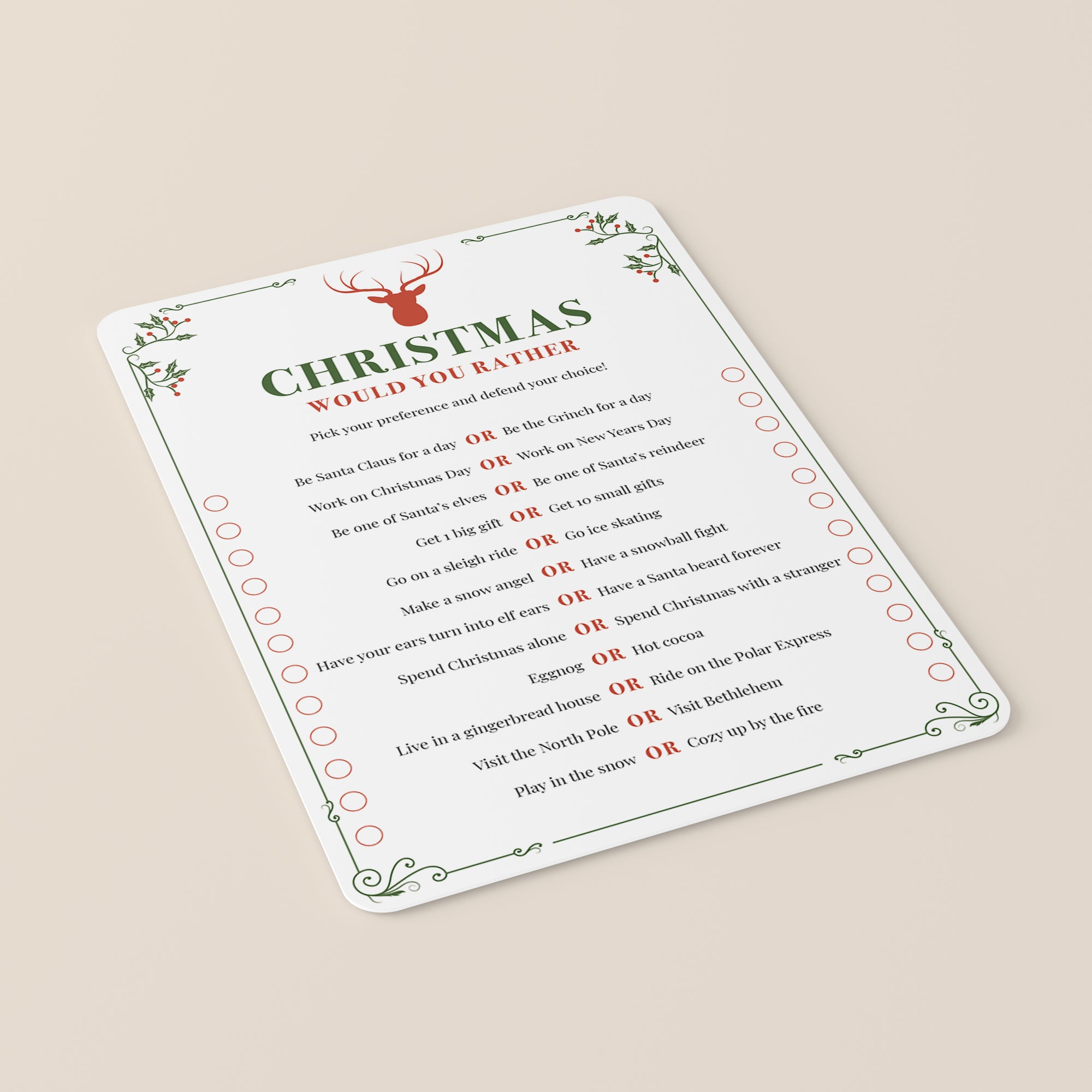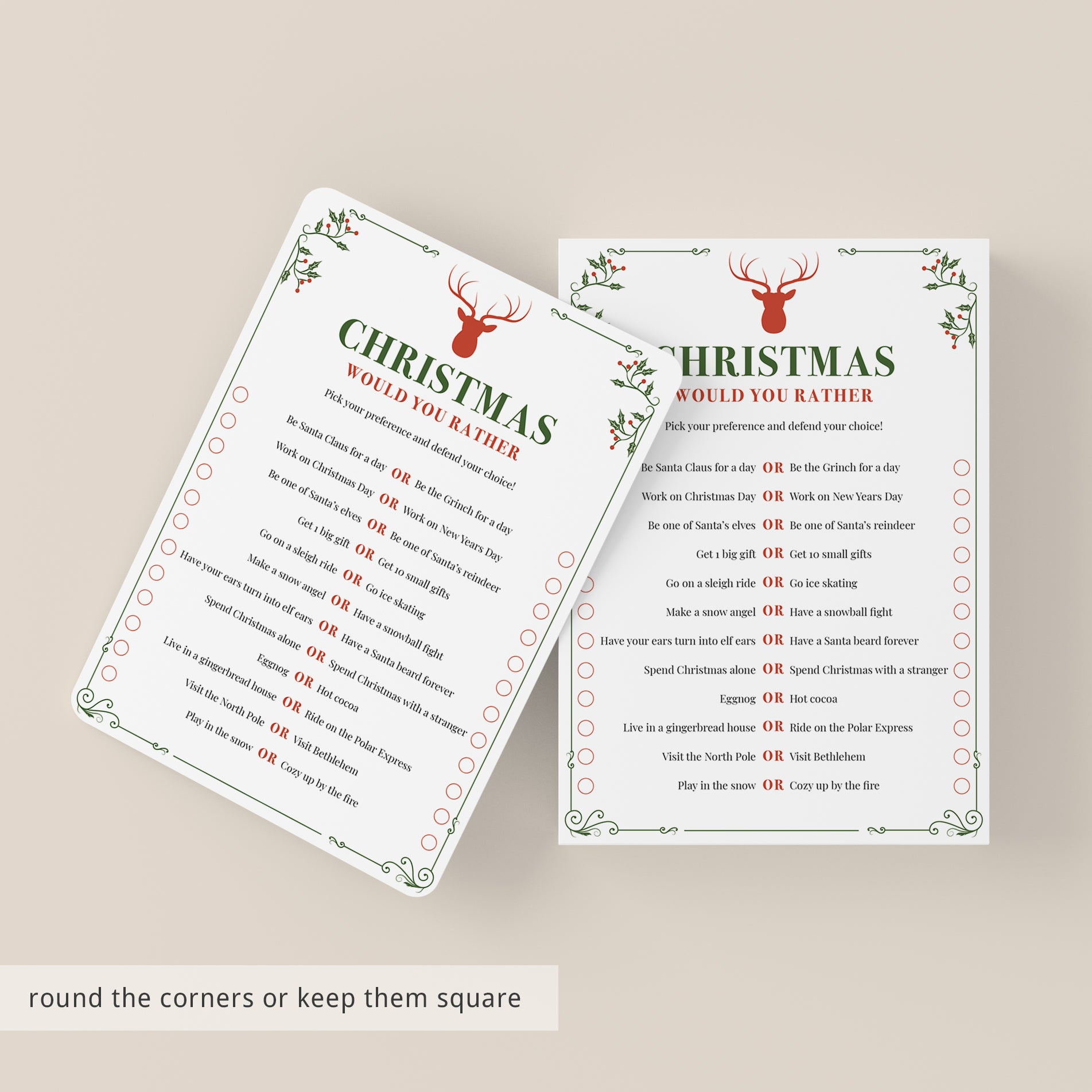 Are you looking for a fun icebreaker game for your Christmas party? Play Would You Rather. It's is a great conversation starter and will definitely get your guests mingling and laughing. This vintage theme Christmas game has 12 Would You Rather questions. Have your guests pick their preferences and defend their choice.