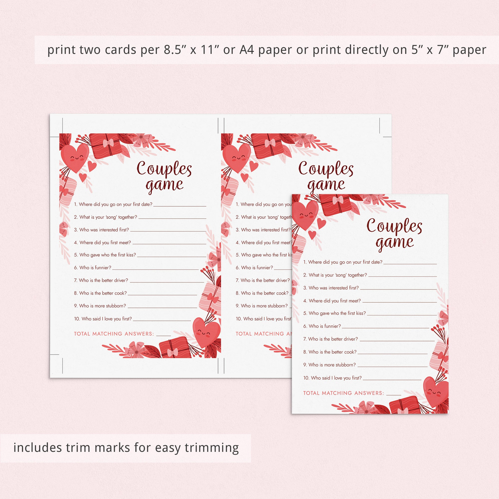 This printable Couples Game is an instant download. After purchase you will receive a download link immediately on screen. Also within minutes of your order and payment, an e-mail will be sent to you with a link for your download.