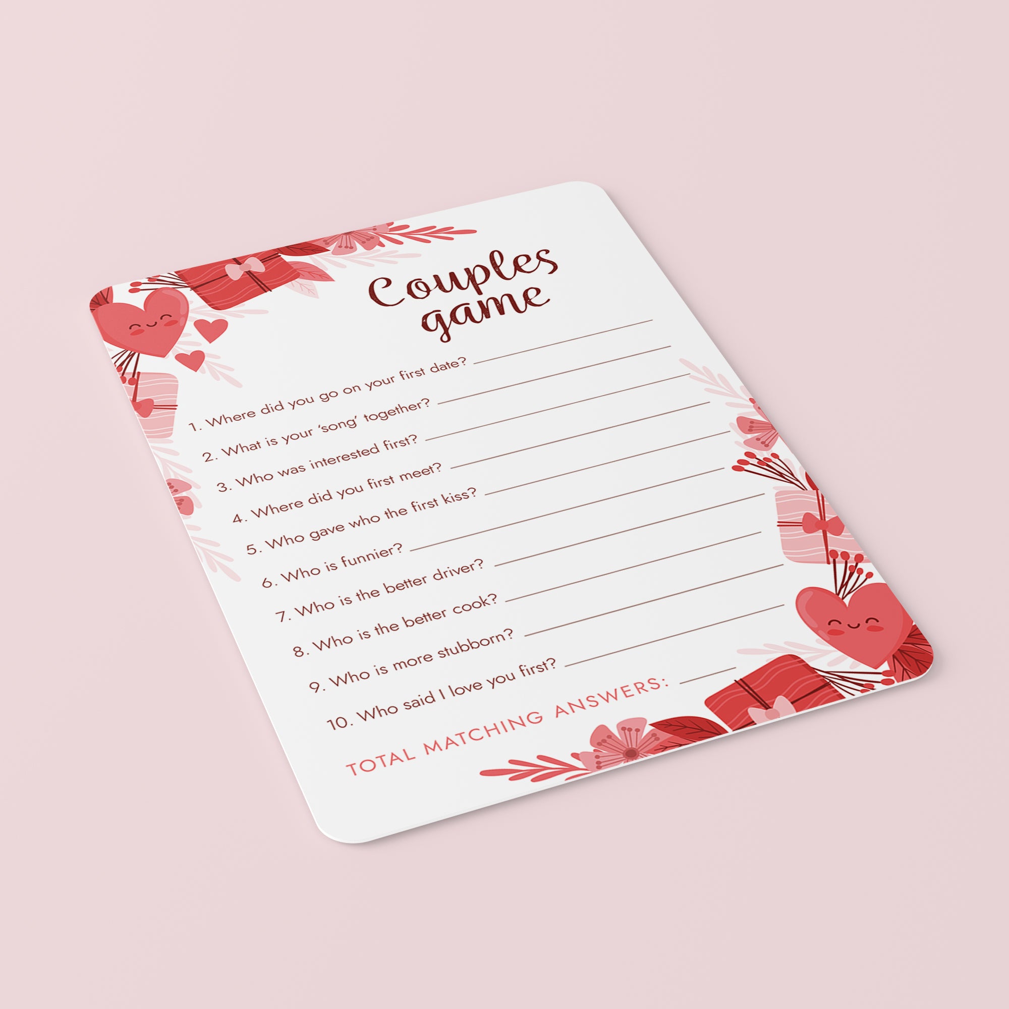The game is very easy to play. Simply pass out a game card along with a pen to each guest. Ask everyone to answer the questions about their relationship individually and don’t let couples see or talk about what they wrote down.