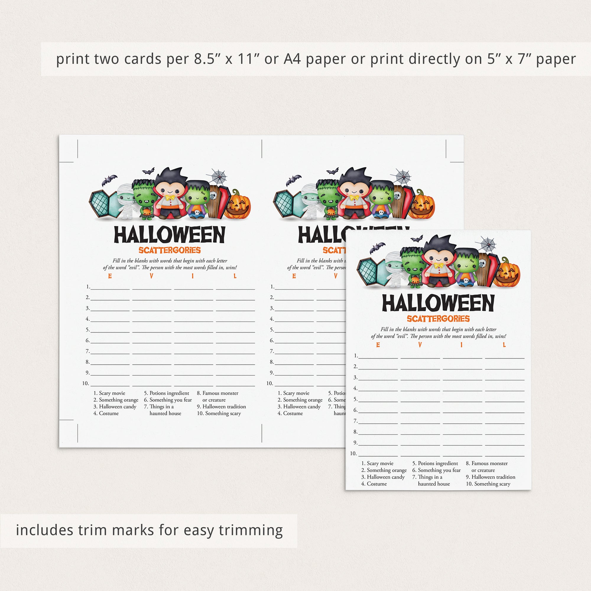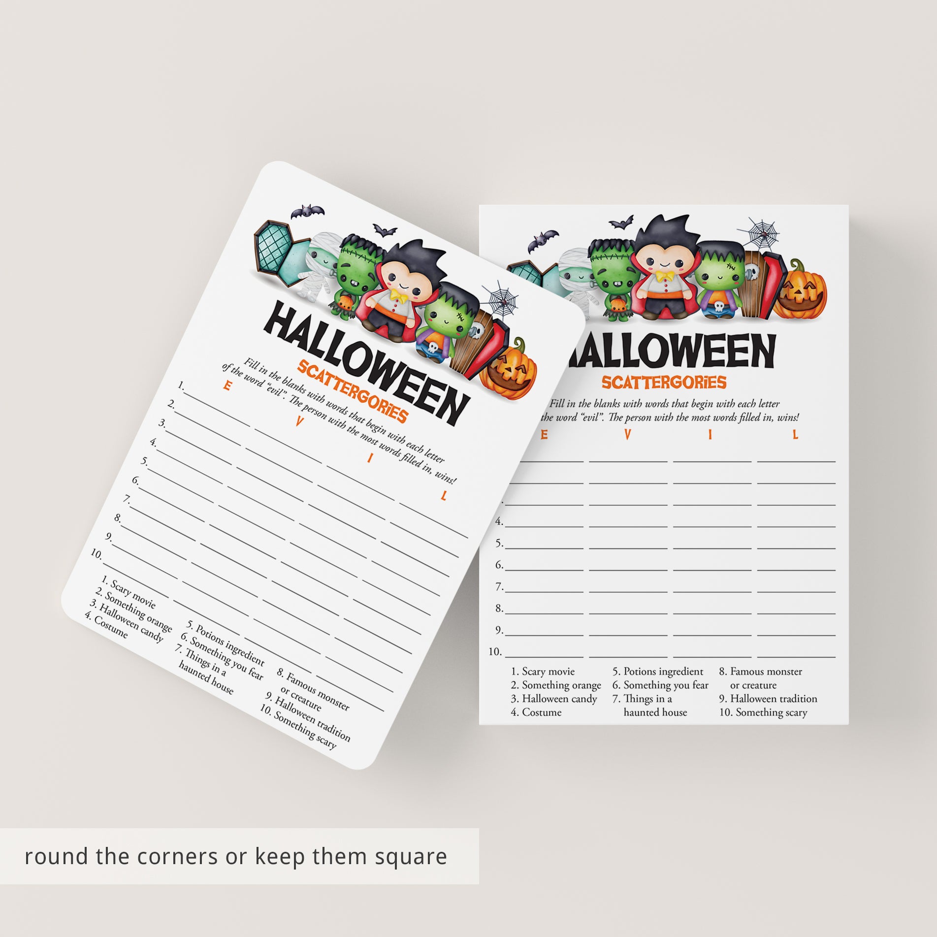 How many words can you fill in with the letters "E", "V", "I" and "L"? Play Scattergories at your Halloween party with this Scattergories game with cute Halloween characters.