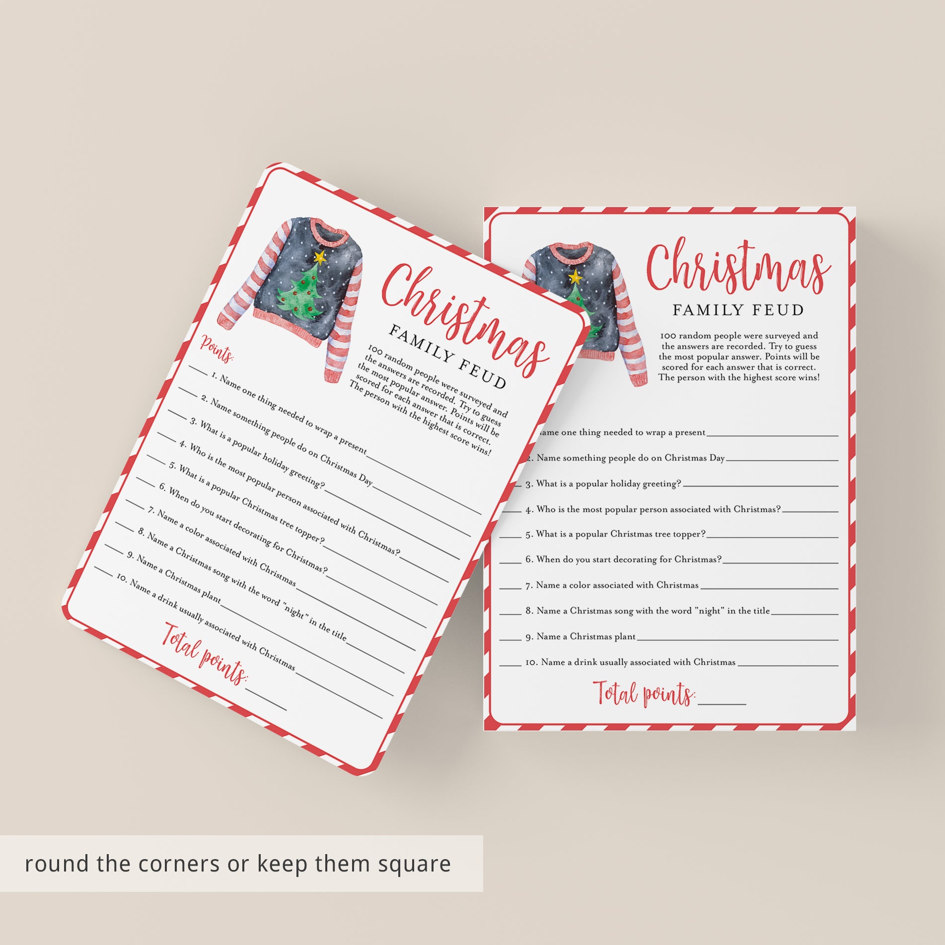 Family Feud is one of the best game shows ever. Have your friends and family compete to guess the most popular answer to random holiday themed family feud questions. An answer key with the Christmas family feud answers and points is included. The person or team with the highest score wins!