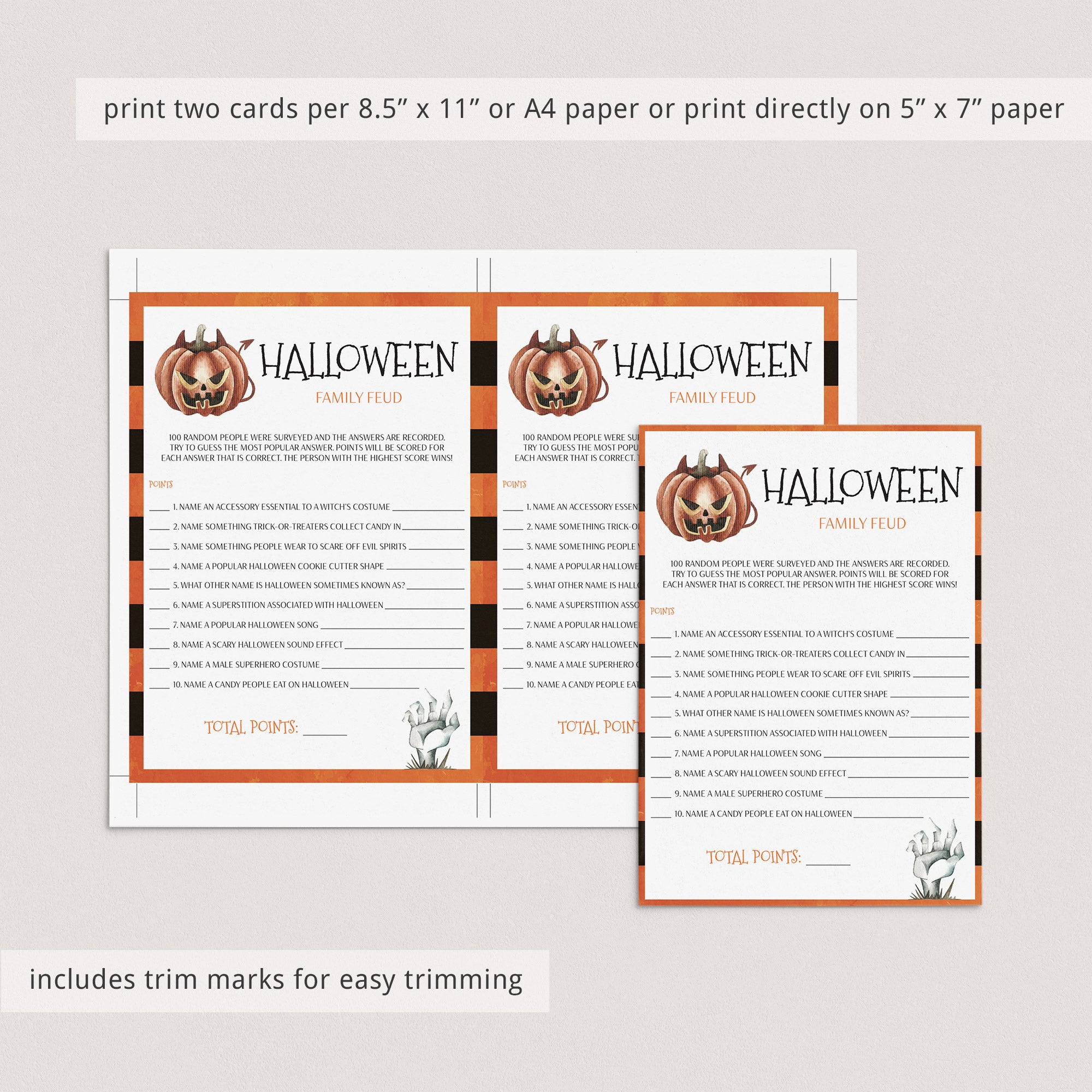 Add some fun to your Halloween party with this Family Feud Halloween game. Family Feud is one of the best game shows ever. Have your friends and family compete to guess the most popular answer to random Halloween family feud questions. An answer key with the Halloween feud answers and points is included. The person or team with the highest score wins!