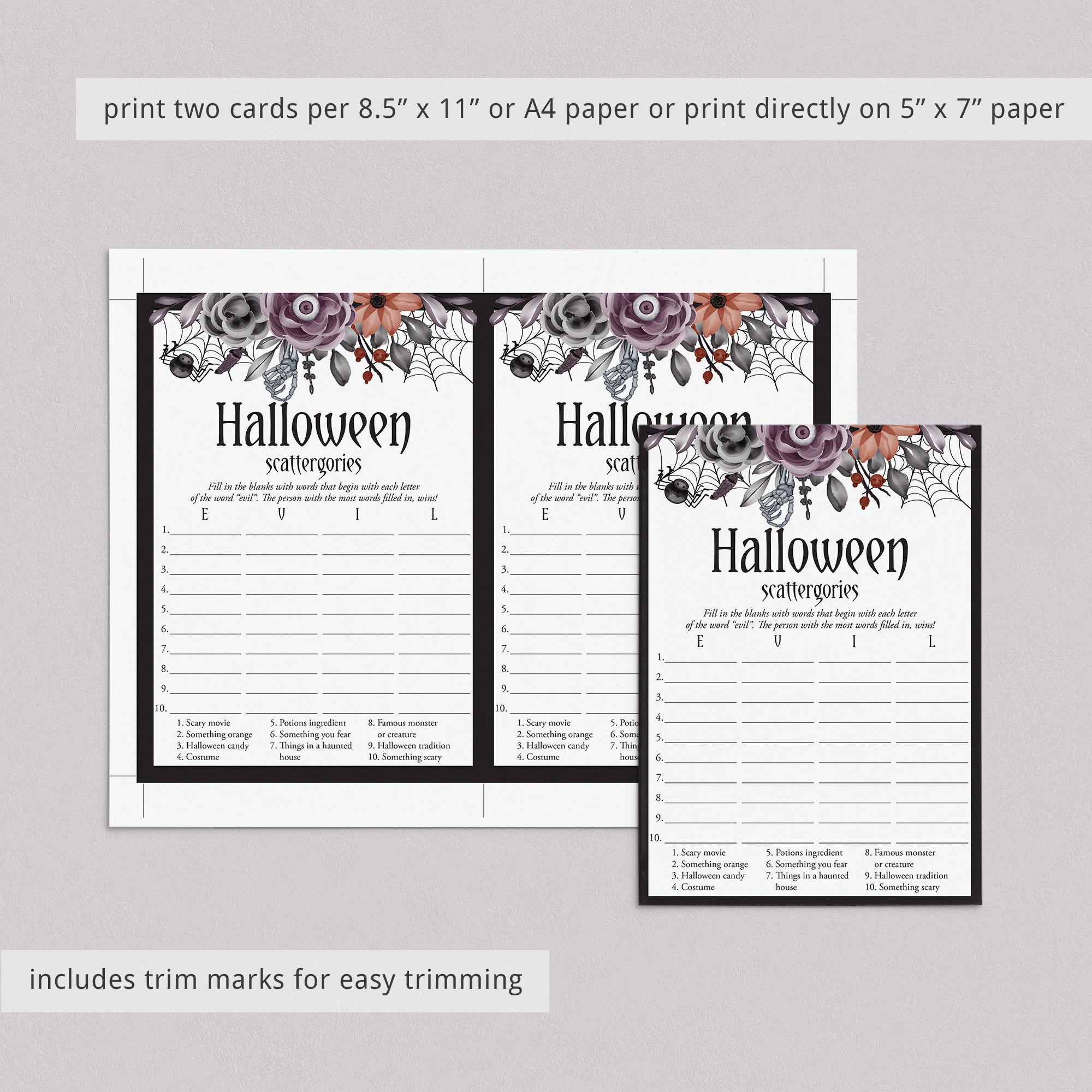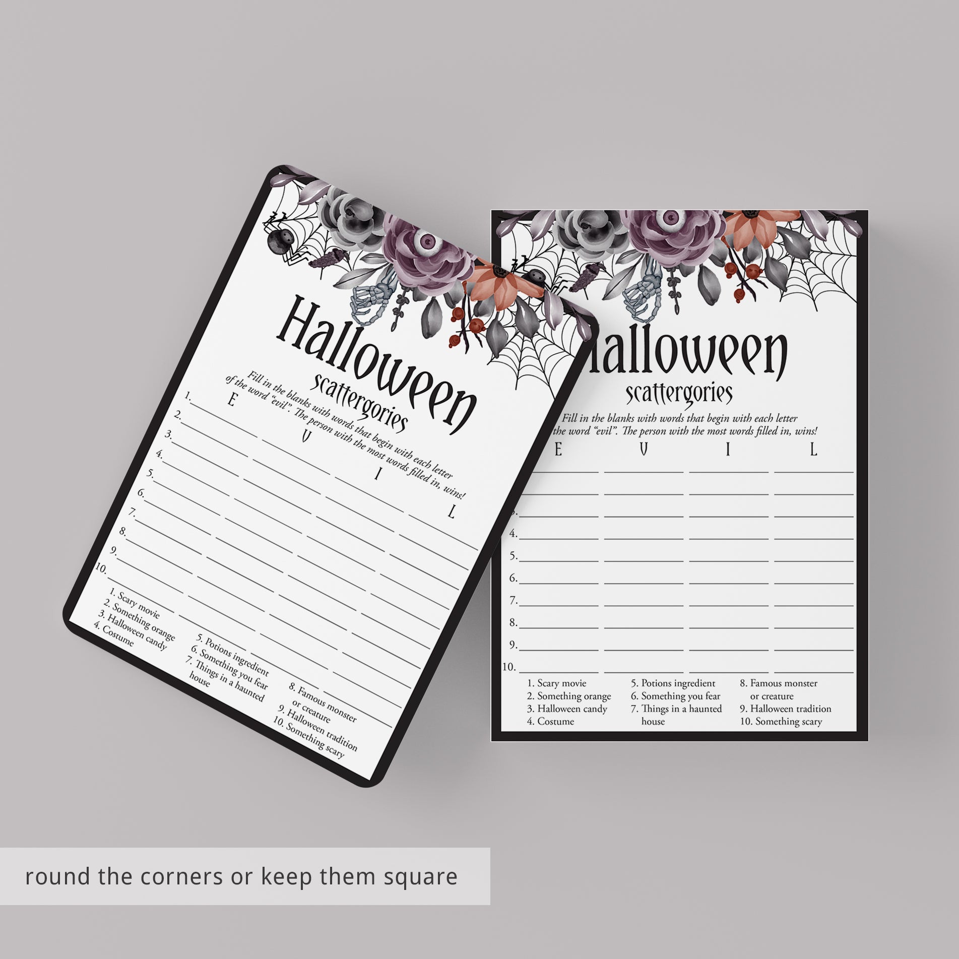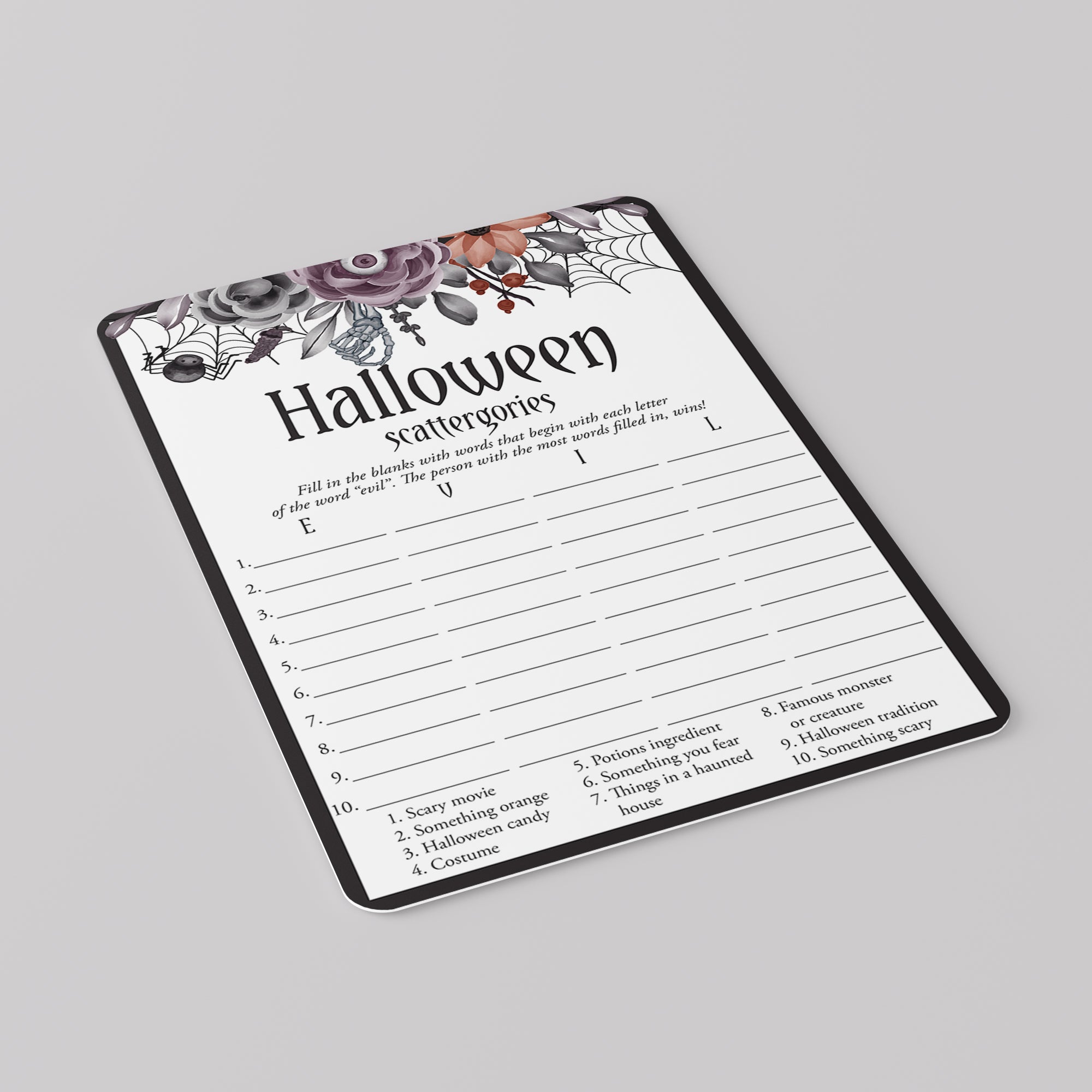How many words can you fill in with the letters "E", "V", "I" and "L"? Play Scattergories at your Halloween theme party with this creepy floral Halloween Scattergories game. It's the perfect addition to your Halloween ladies night or dinner party.