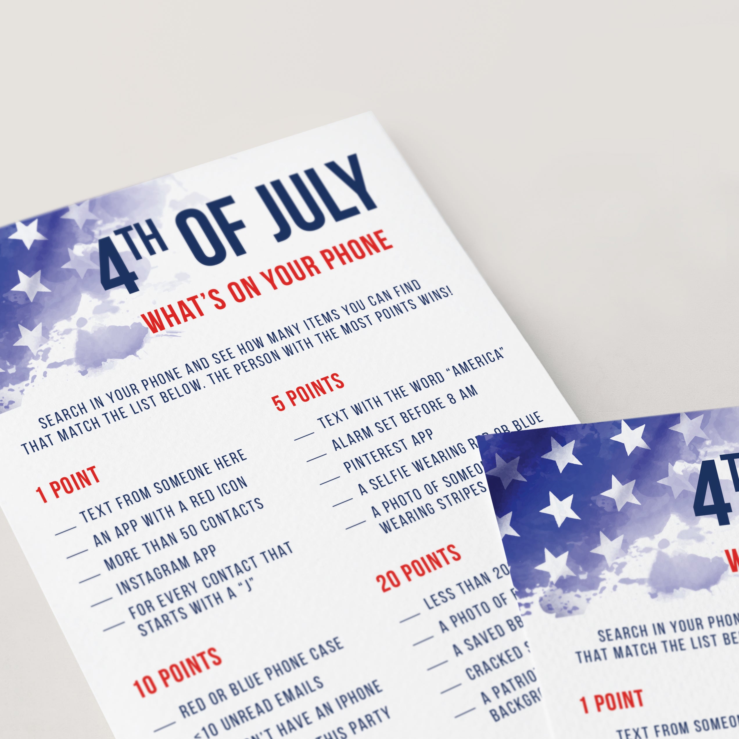 What’s On Your Phone is similar to the What’s In Your Purse game, but instead of searching for the items physically, your friends will just search for the listed items using their phone. They earn points for each item that they have in their phone. Things like having a red or blue phone case, a photo of fireworks, a patriotic song and much, much more. The person with the most points, wins!