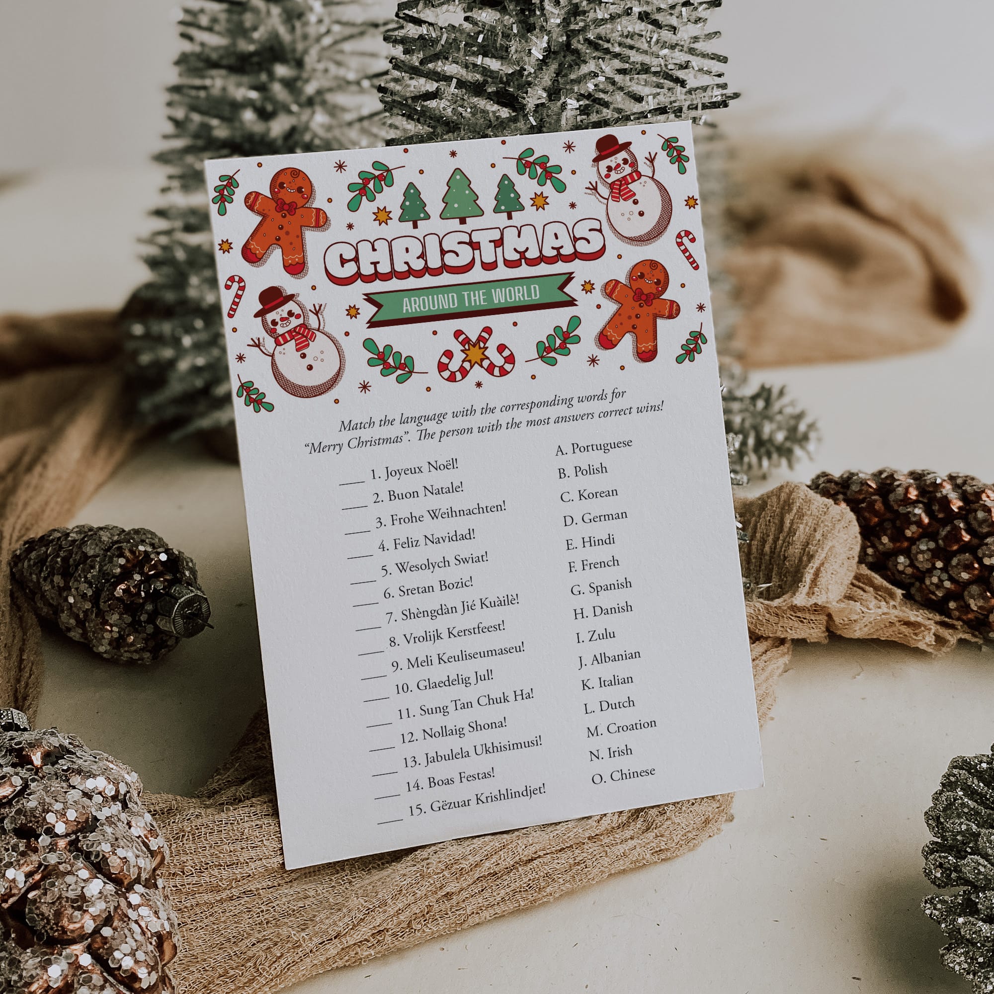 Are you hosting a Christmas party and looking for some last-minute entertainment? This huge Christmas Party Games Bundle for family with 12 popular games will definitely get your guests mingling and laughing. Everyone will love these ready-to-go Christmas games – simply download, print and play! The fun games with gingerbreak cookies and snowmen are great for Christmas parties with family, Friendsmas game nights, classrooms and holiday office parties.
