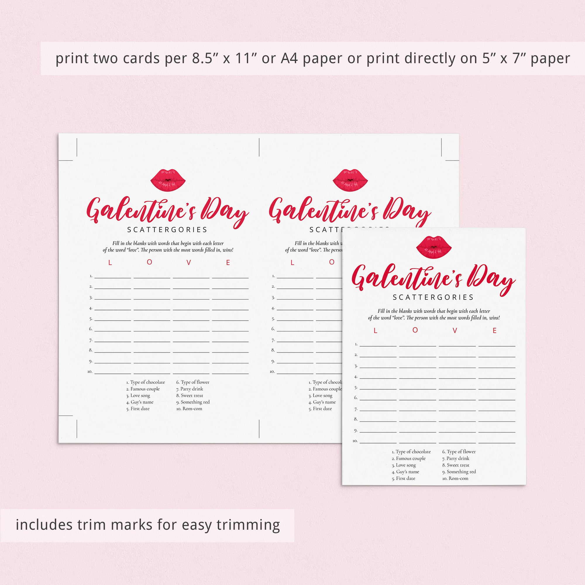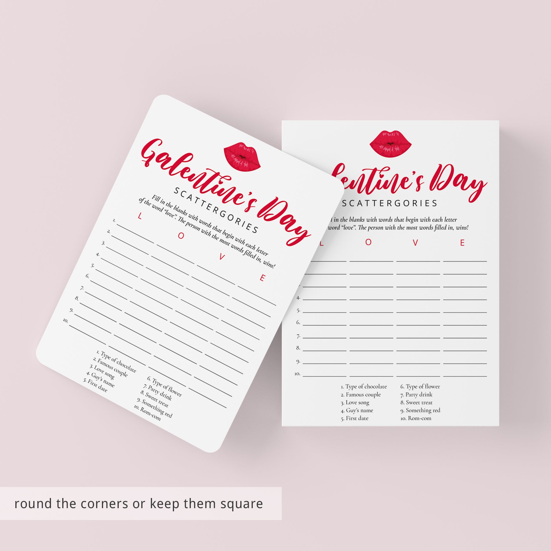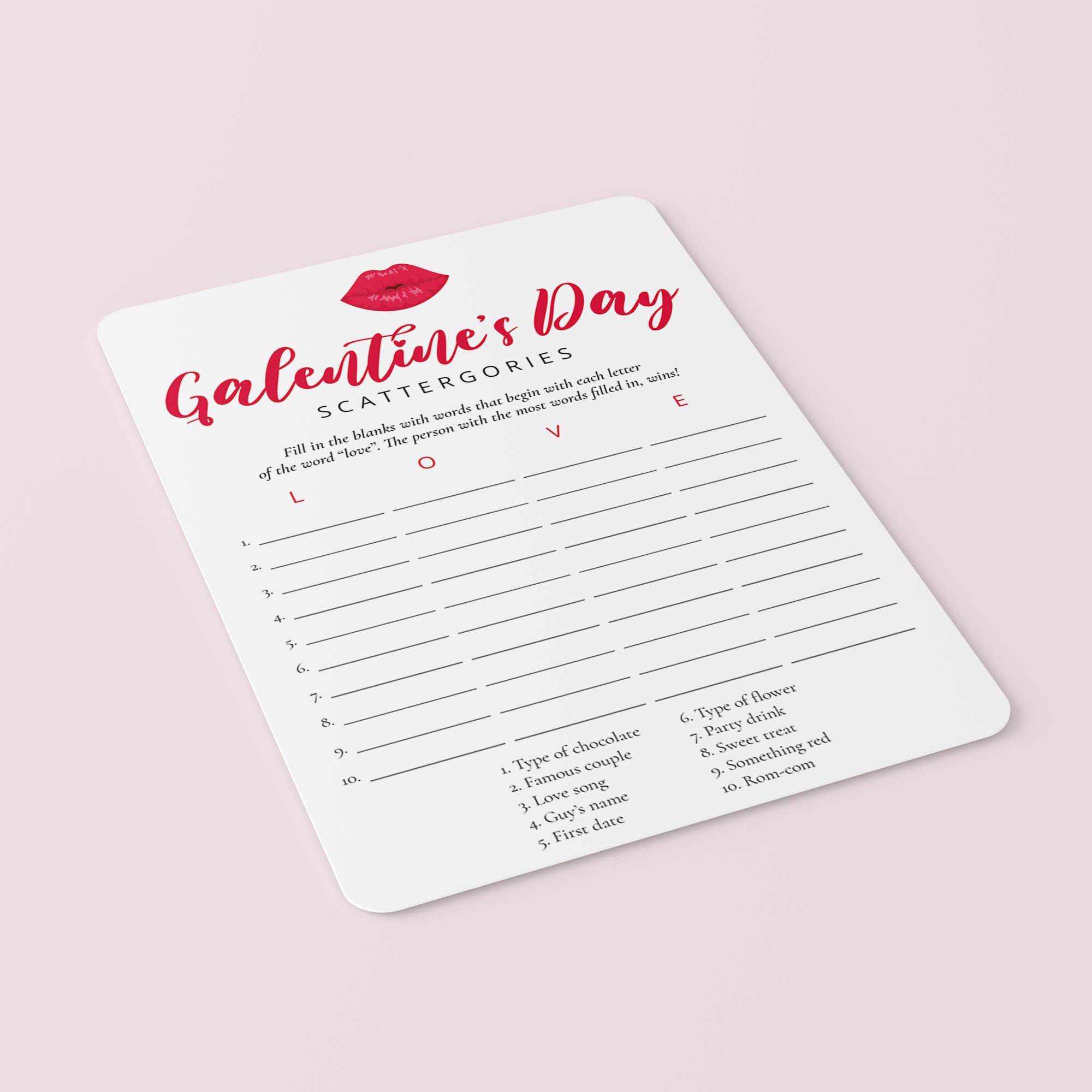 The game is very easy to play. Simply hand out this Galentine's Scattergories game card with kissing lips to your BFF's. They will have to come up with as many words related to the categories at the bottom of the sheet. The difficulty is that the words must begin with the letters in the word "LOVE". The girl that gets the most answers filled in within the set time, wins!