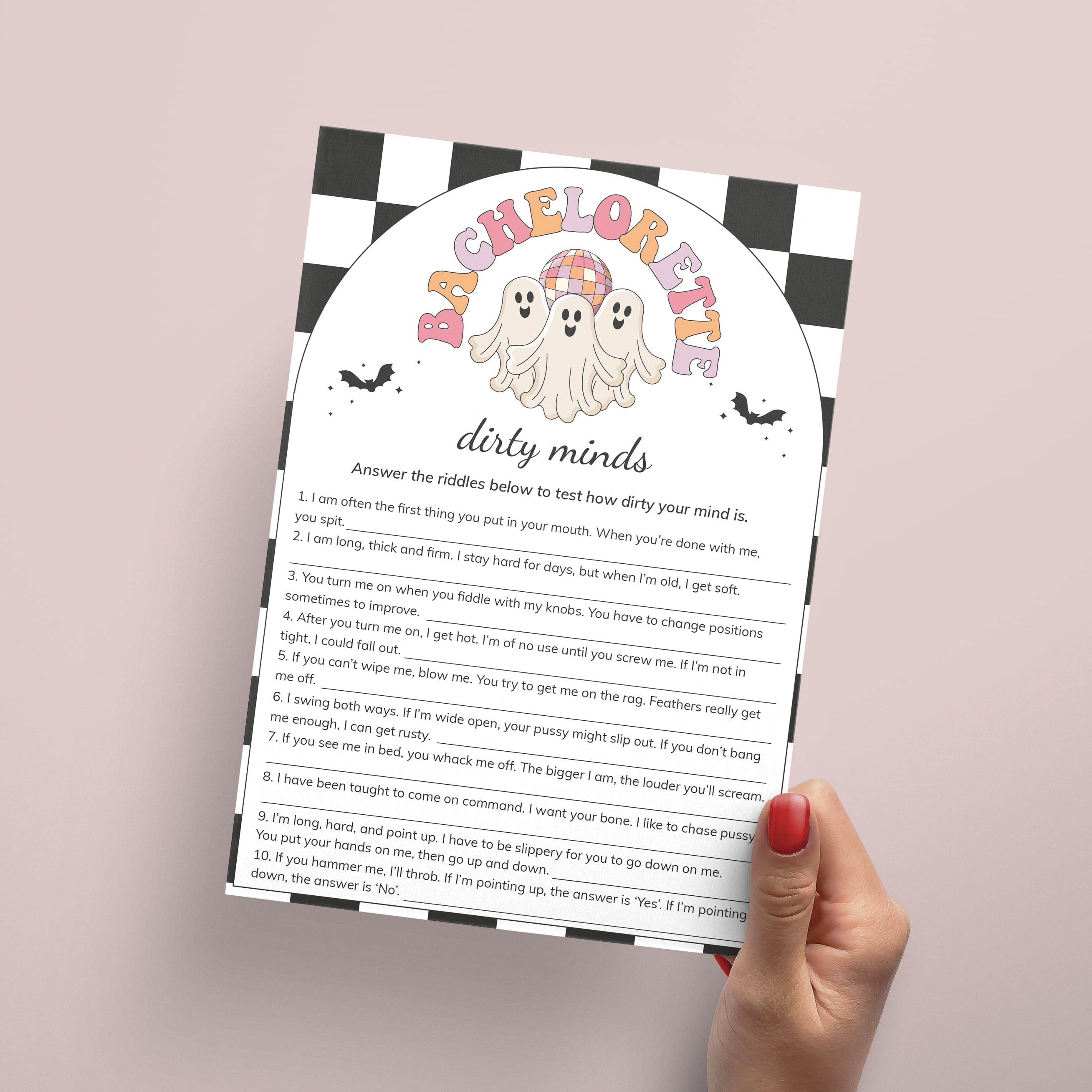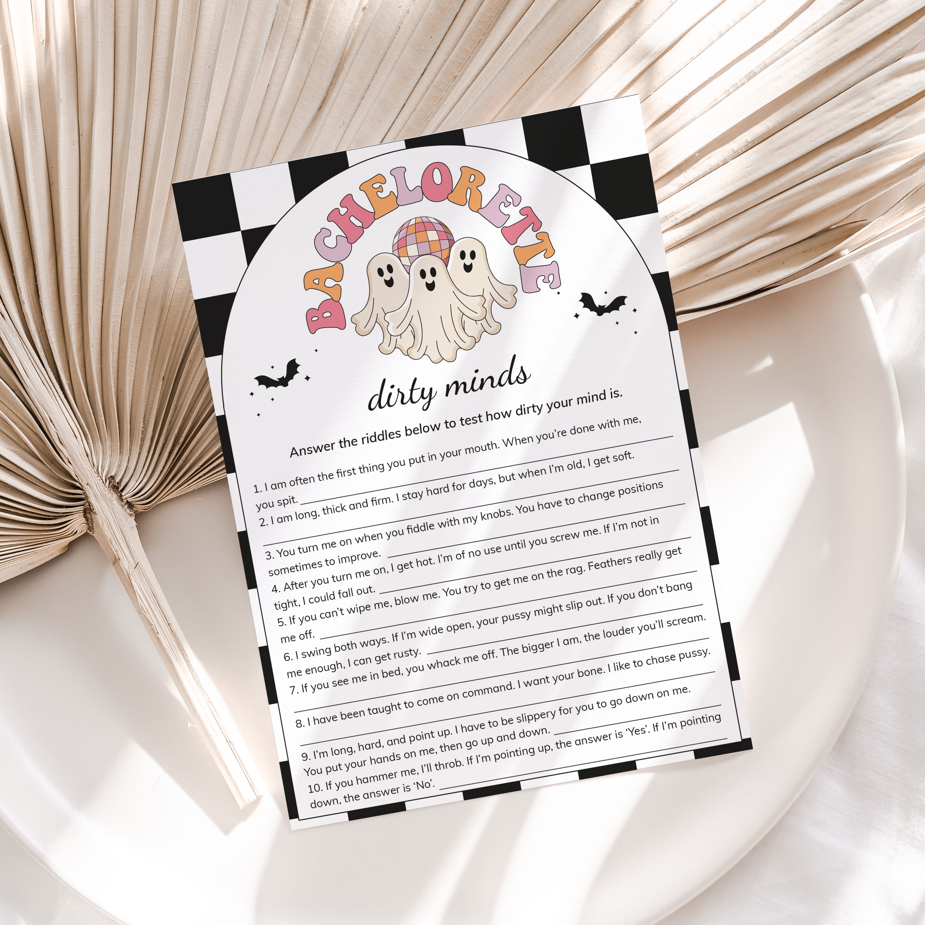The dirtier a mind you have, the worse you will be at playing this Dirty Minds game. This game, with cute ghost and black and white checkered background, is the perfect game to play with your girls at your Let's Go Ghouls Party, Last Boo Before I Do Hen Night, She Found Her Boo Bridal Shower or Halloween Girl's Night.