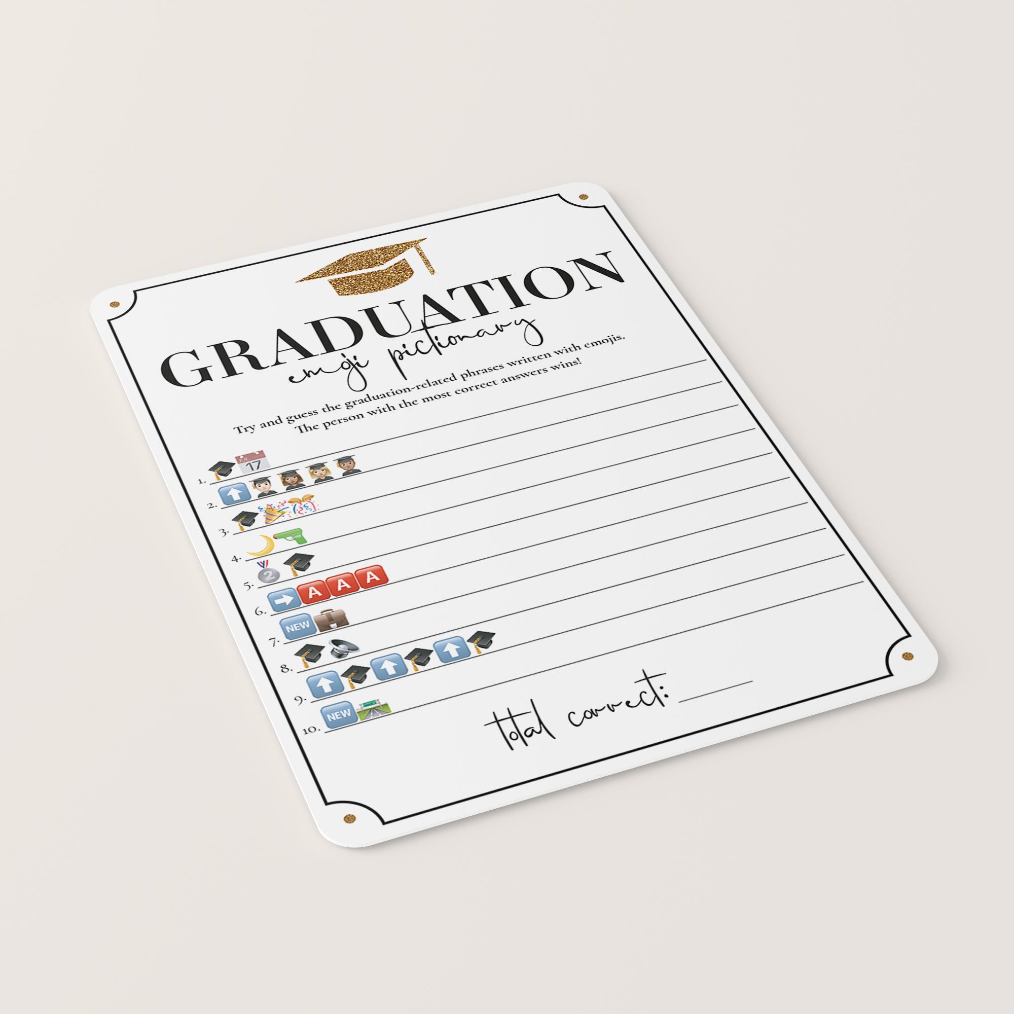 Are you looking for a fun game to play at your graduation party? Play Emoji Pictionary! It's a great game for all ages. Play this shiny gold graduation game at a high school graduation party or college graduation party. Games are a must for every grad party!