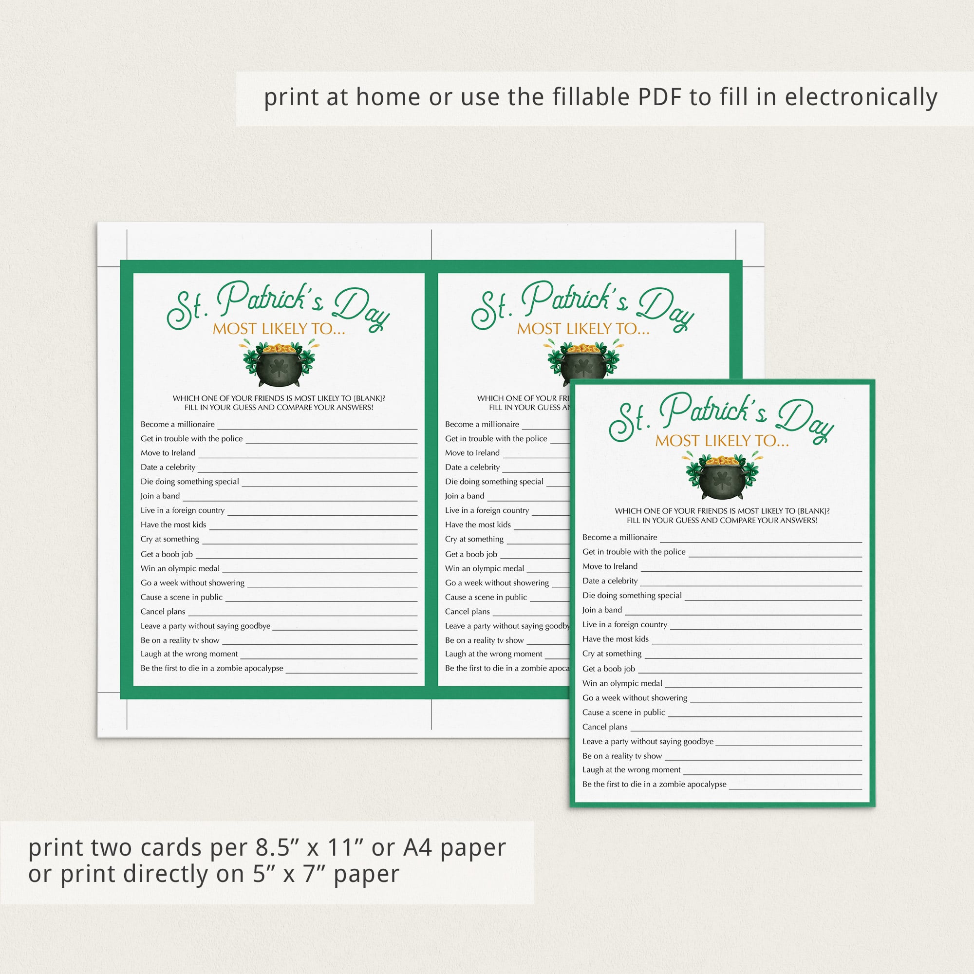 For an in-person St Patrick's Day celebration, download and print the game cards as many times as you need. We recommend printing on a nice heavy card stock for highest quality feel. Print right from your computer in a matter of minutes or have the cards printed at your favorite print shop.