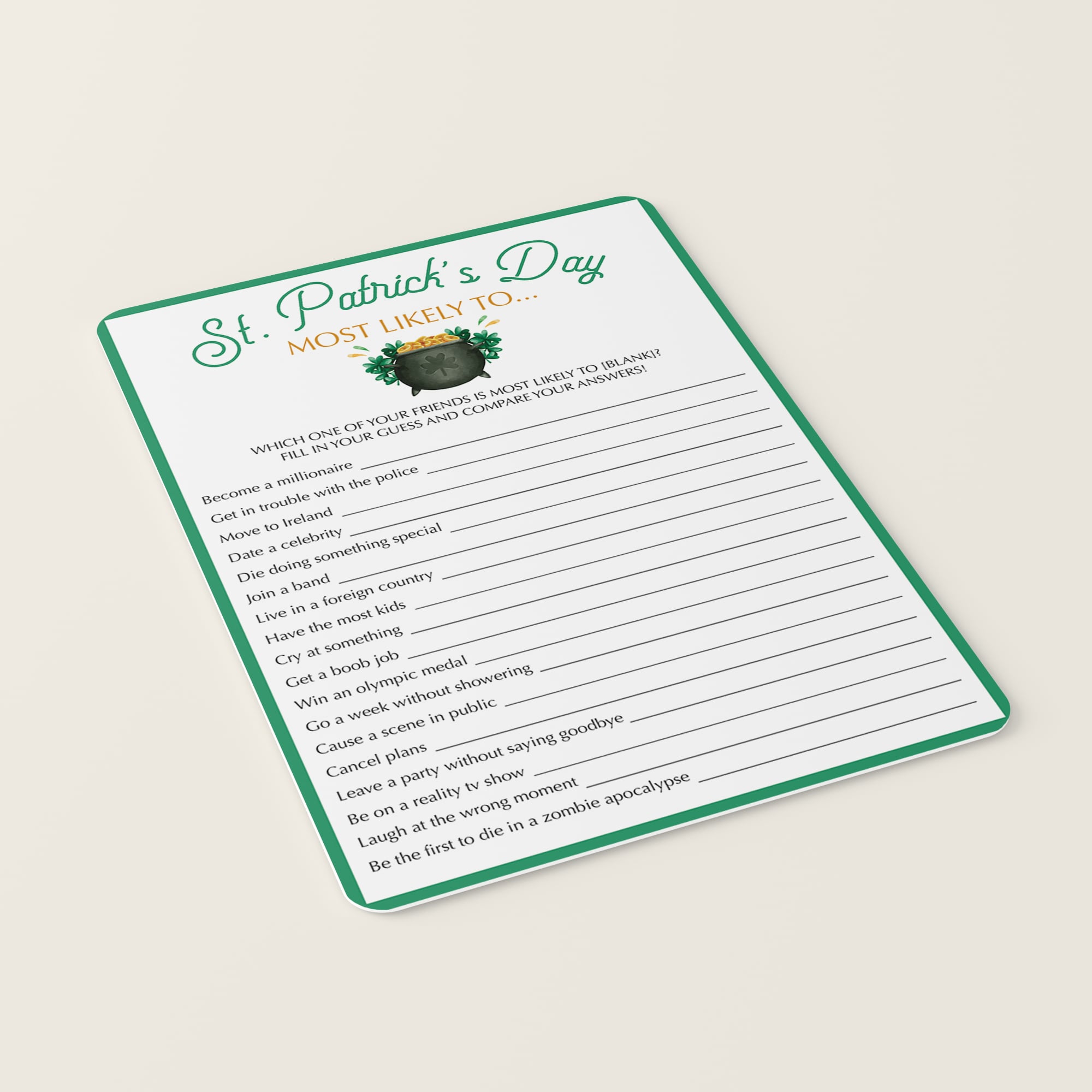 Are you looking for a fun St Patrick's Day game to play with your friends? Play Most Likely To. This fun game has 18 Most Likely To questions for St Patrick's Day that will get everyone talking and laughing. You will get to know your friends at some new level.