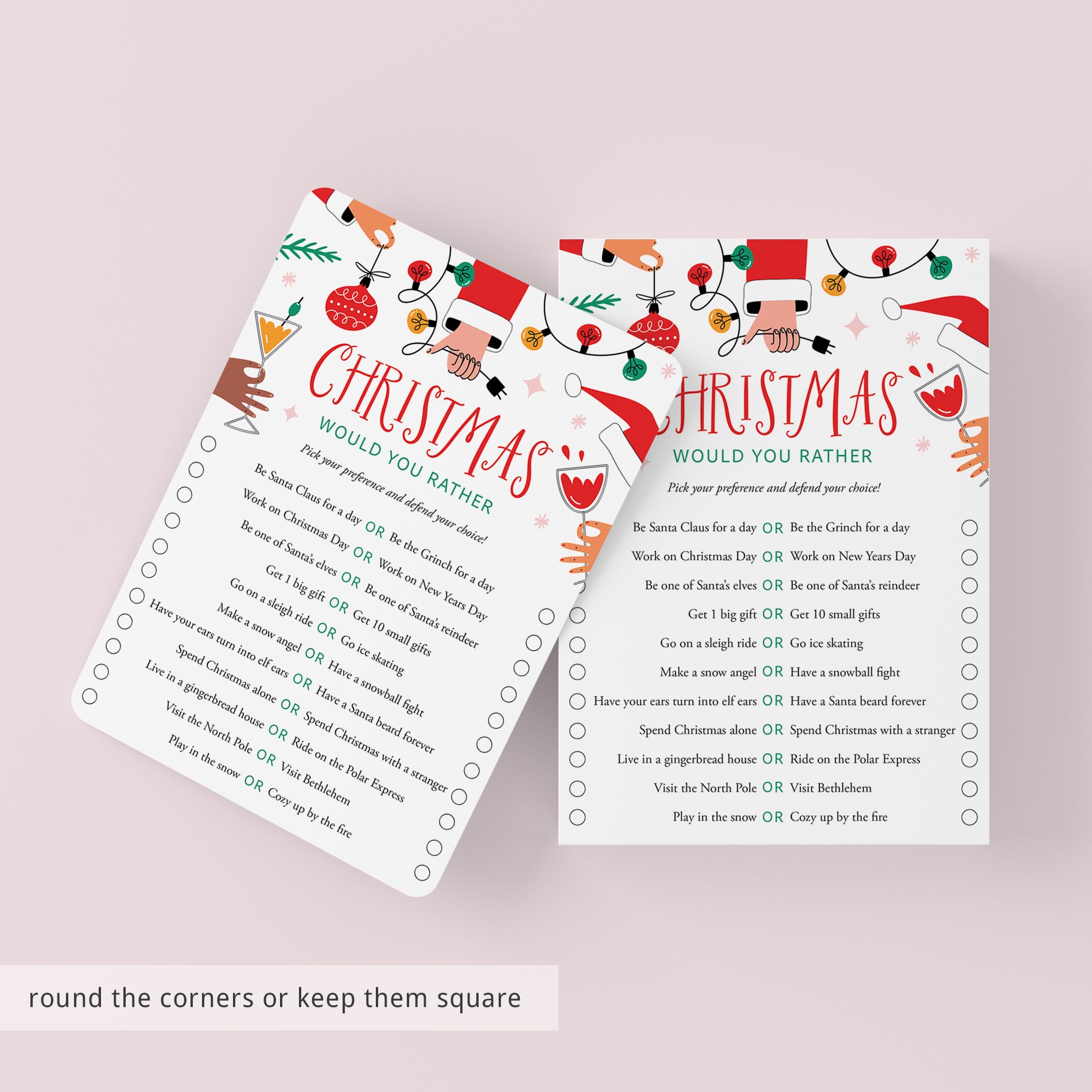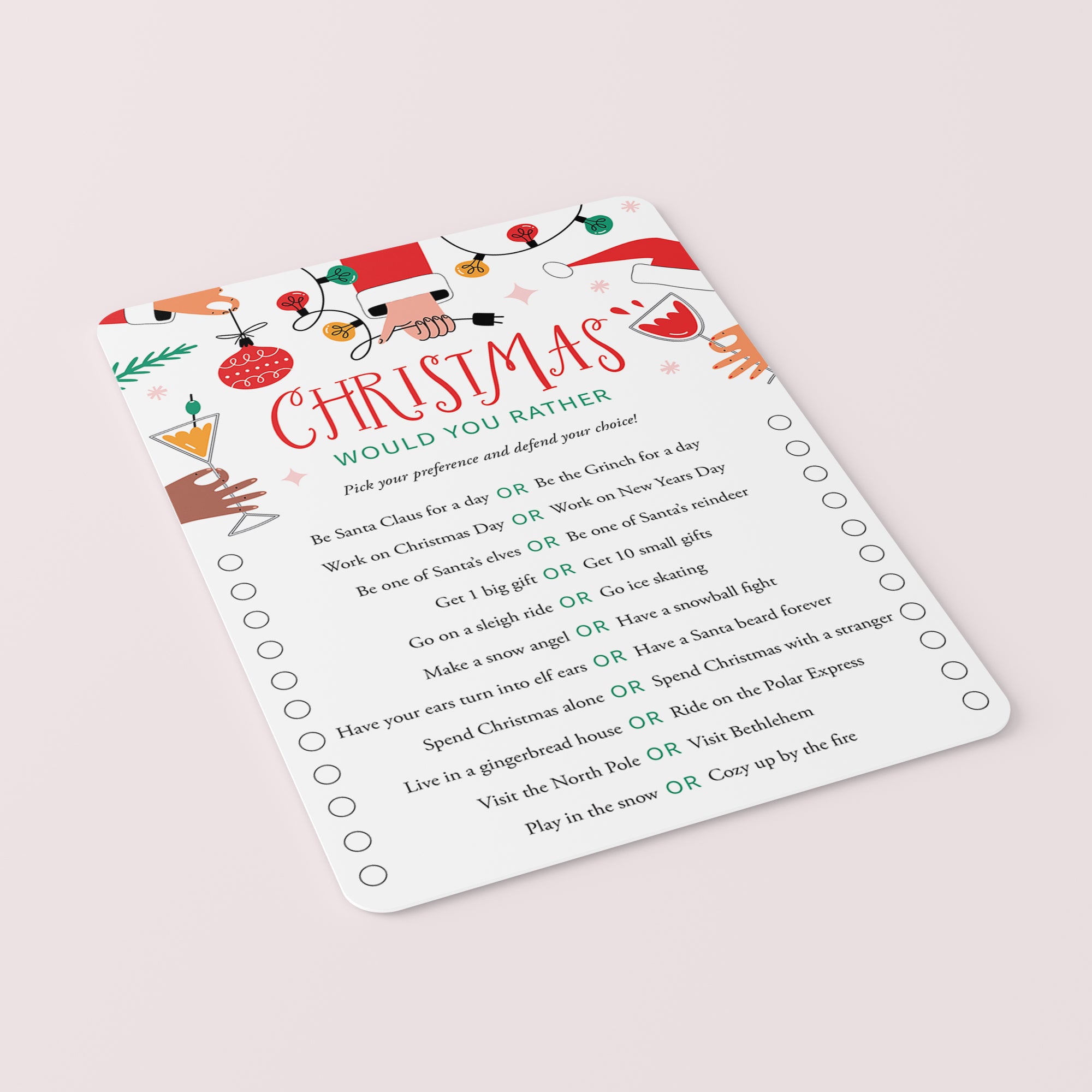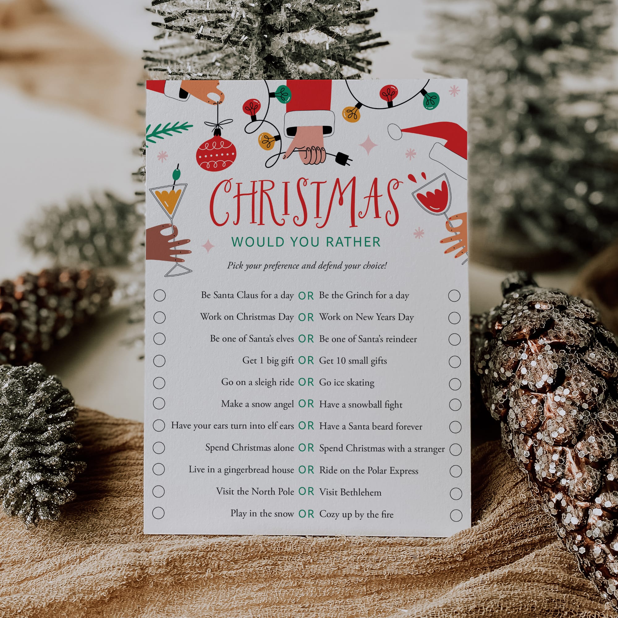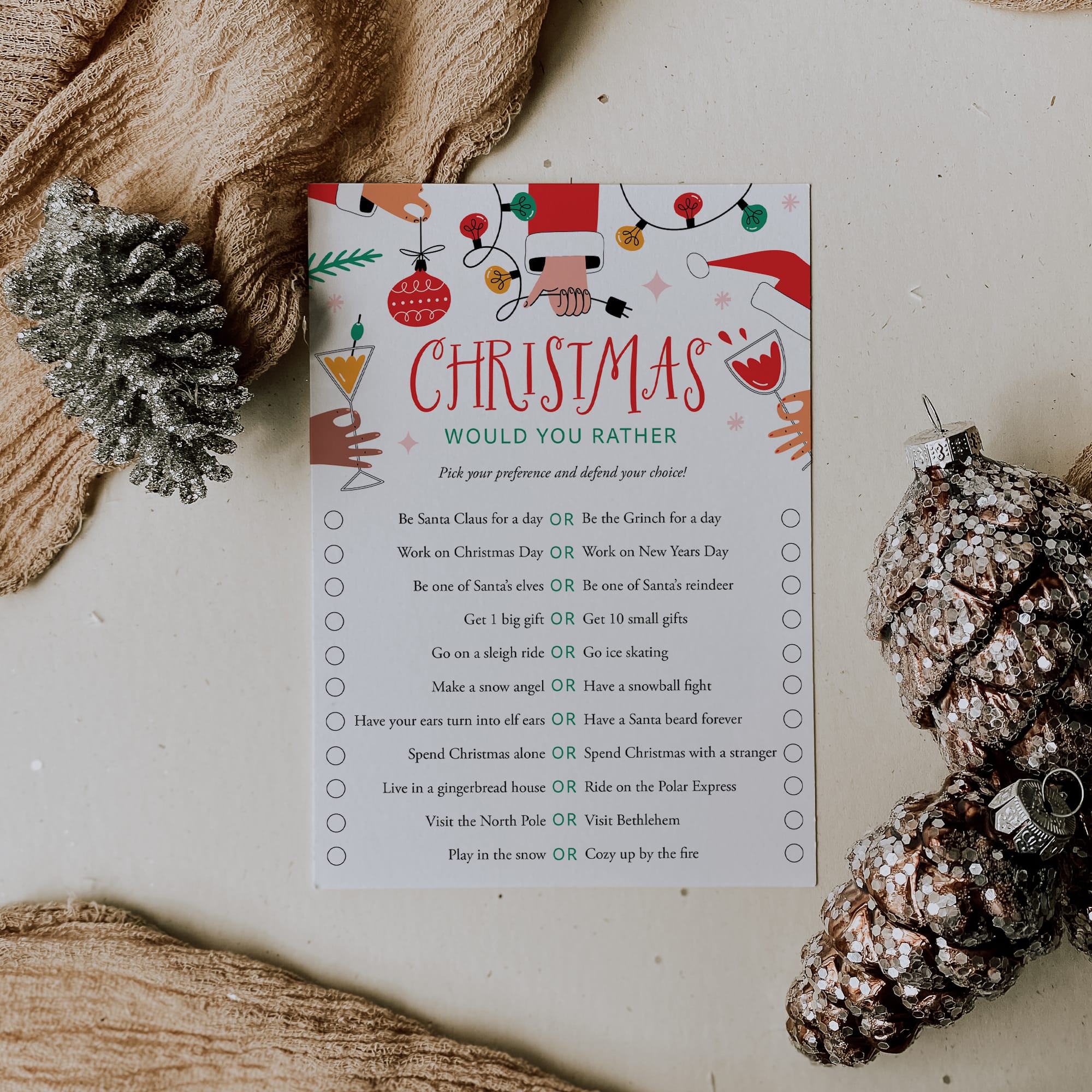 Are you looking for a fun icebreaker game for your Christmas party? Play Would You Rather. It's is a great conversation starter and will definitely get your guests mingling and laughing. This funny adult Christmas party game has 11 Would You Rather questions. Have your guests pick their preferences and defend their choice.