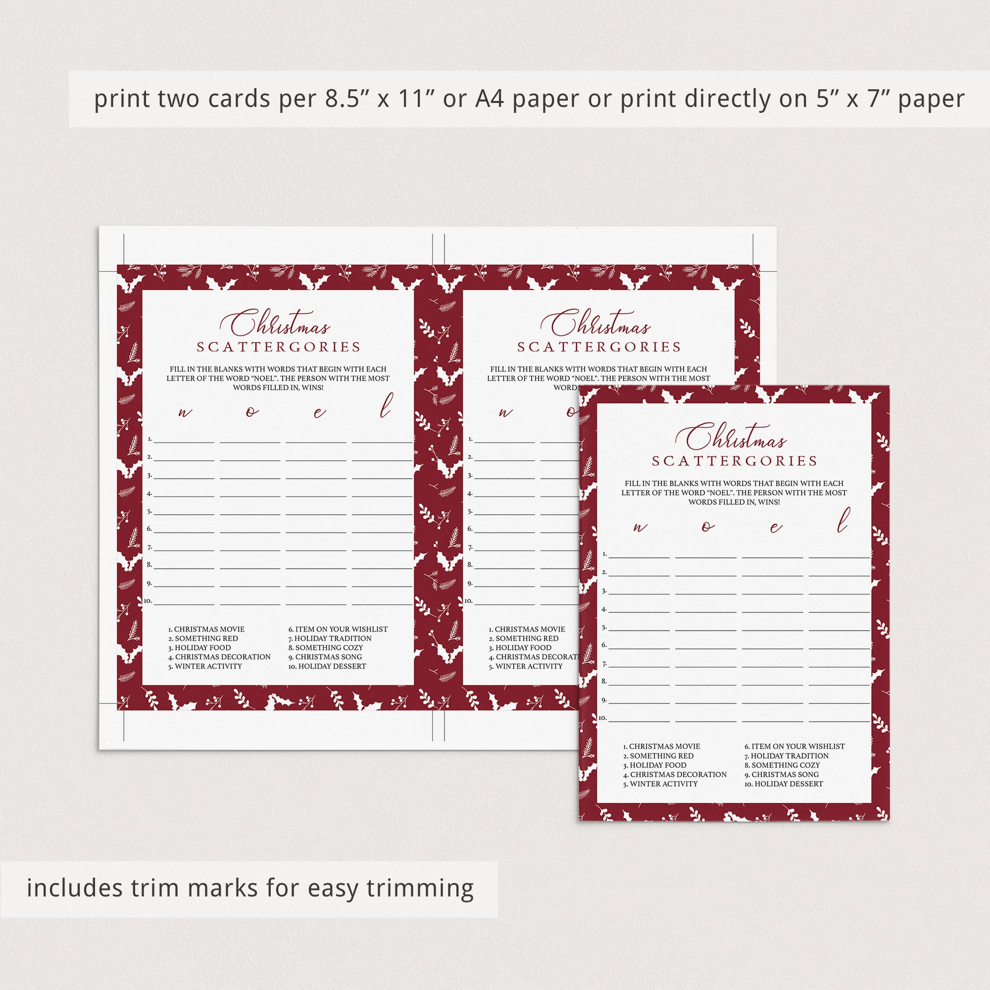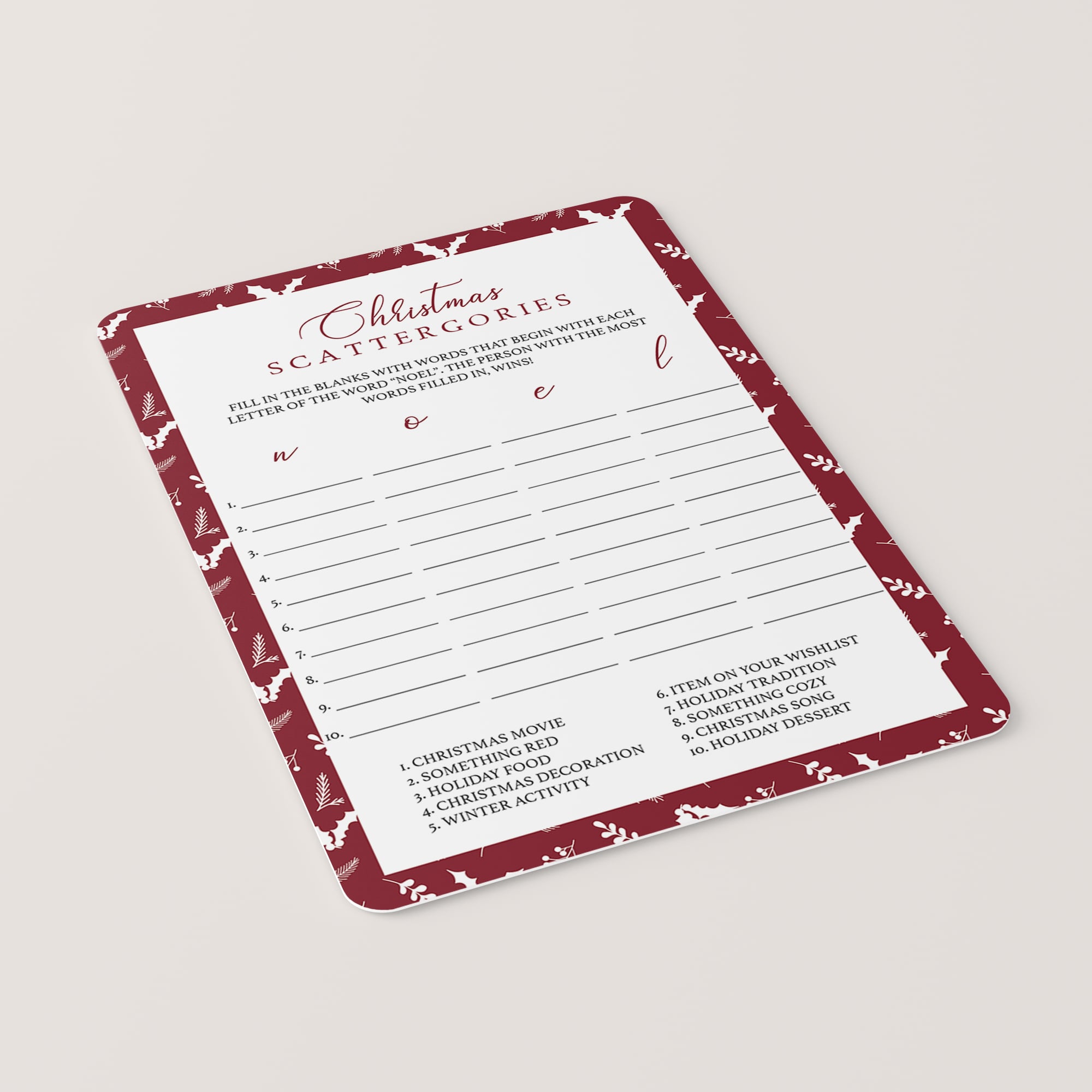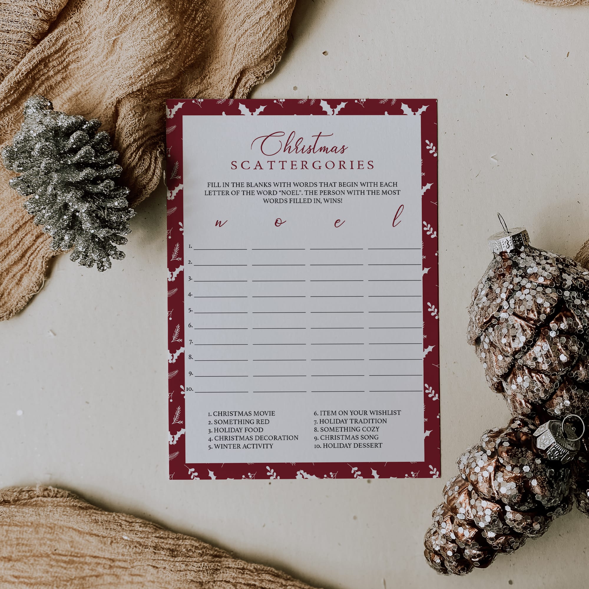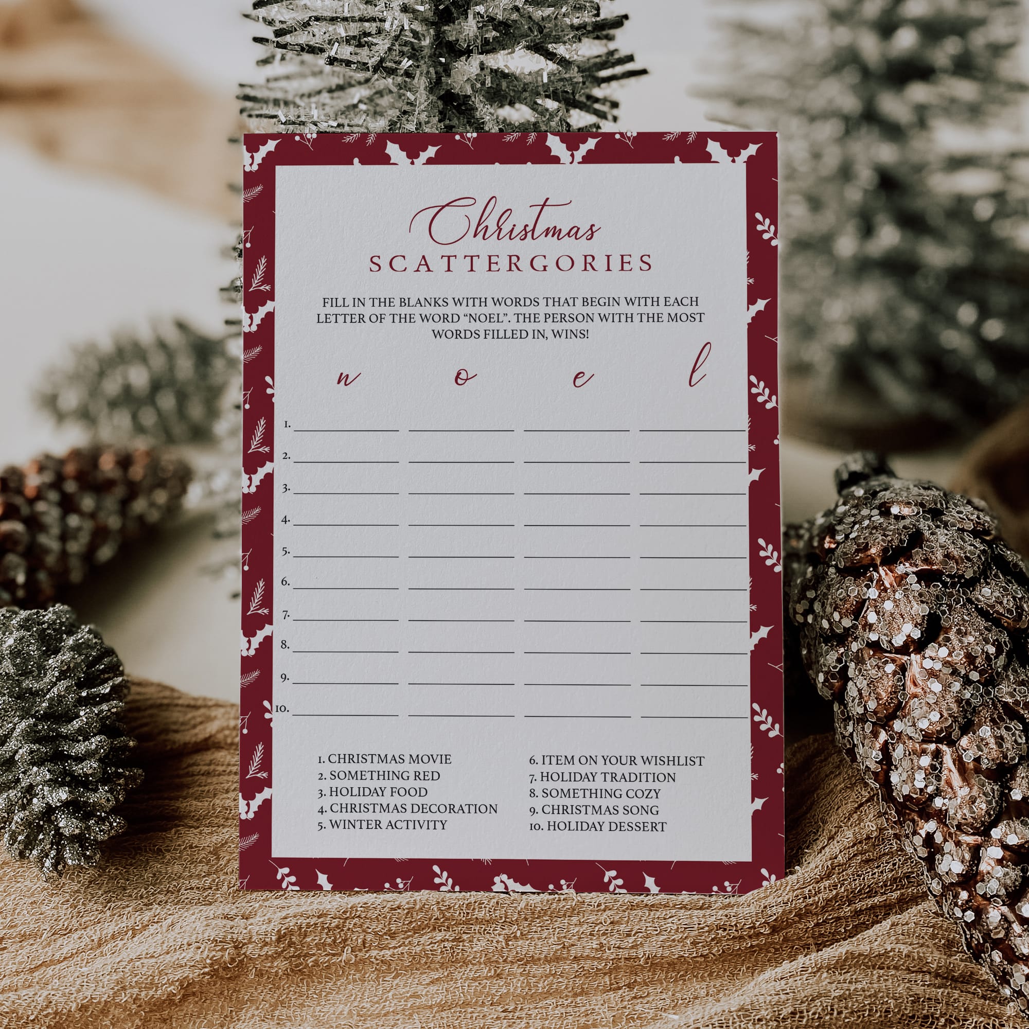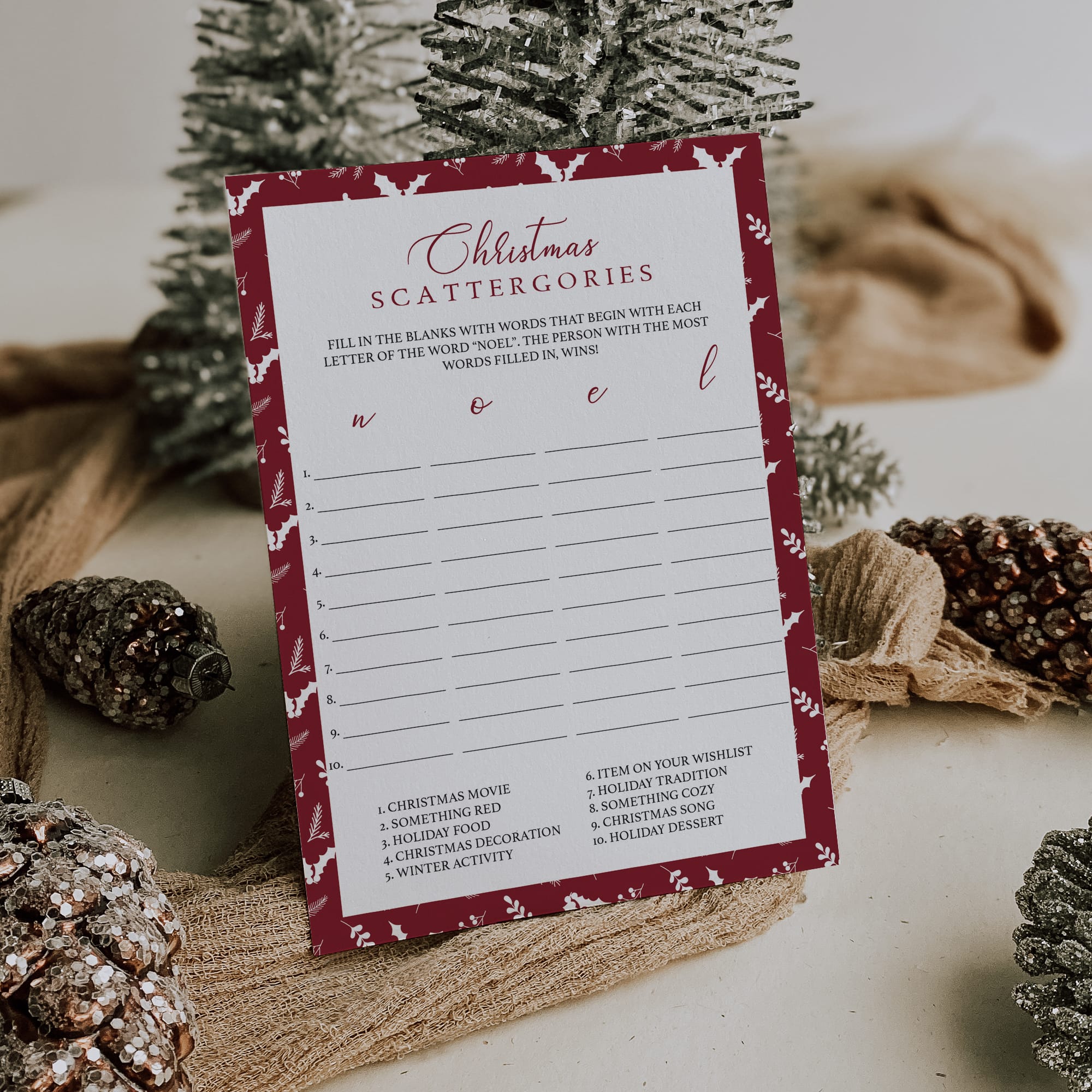 How to play the Christmas Scattergories game? Simply hand out a game sheet and a pen to your guests. They will have to come up with as many words related to the categories at the bottom of the sheet. The difficulty is that the words must begin with the letters in the word "NOEL". The person that gets the most words filled in within the set time, wins!