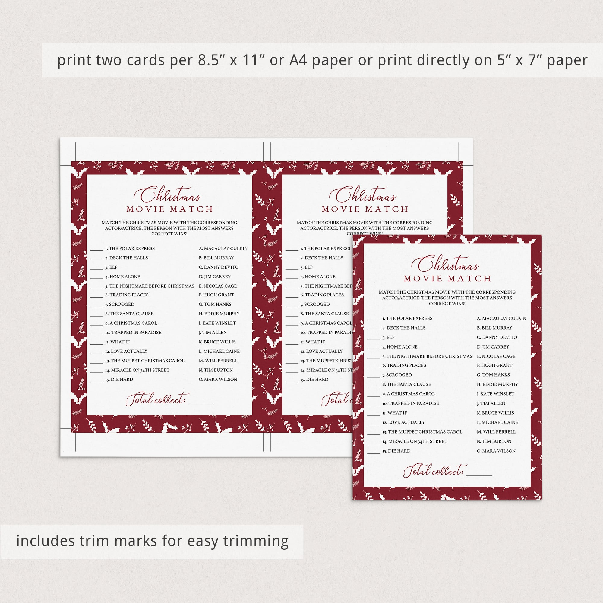 This Christmas movie game is an instant download, so simply download and print the cards as many times as you need. Print at the comfort of your home or order the game from a local or online print shop. A detailed instruction guide with tips & tricks on editing, trimming, paper choices and more is included.