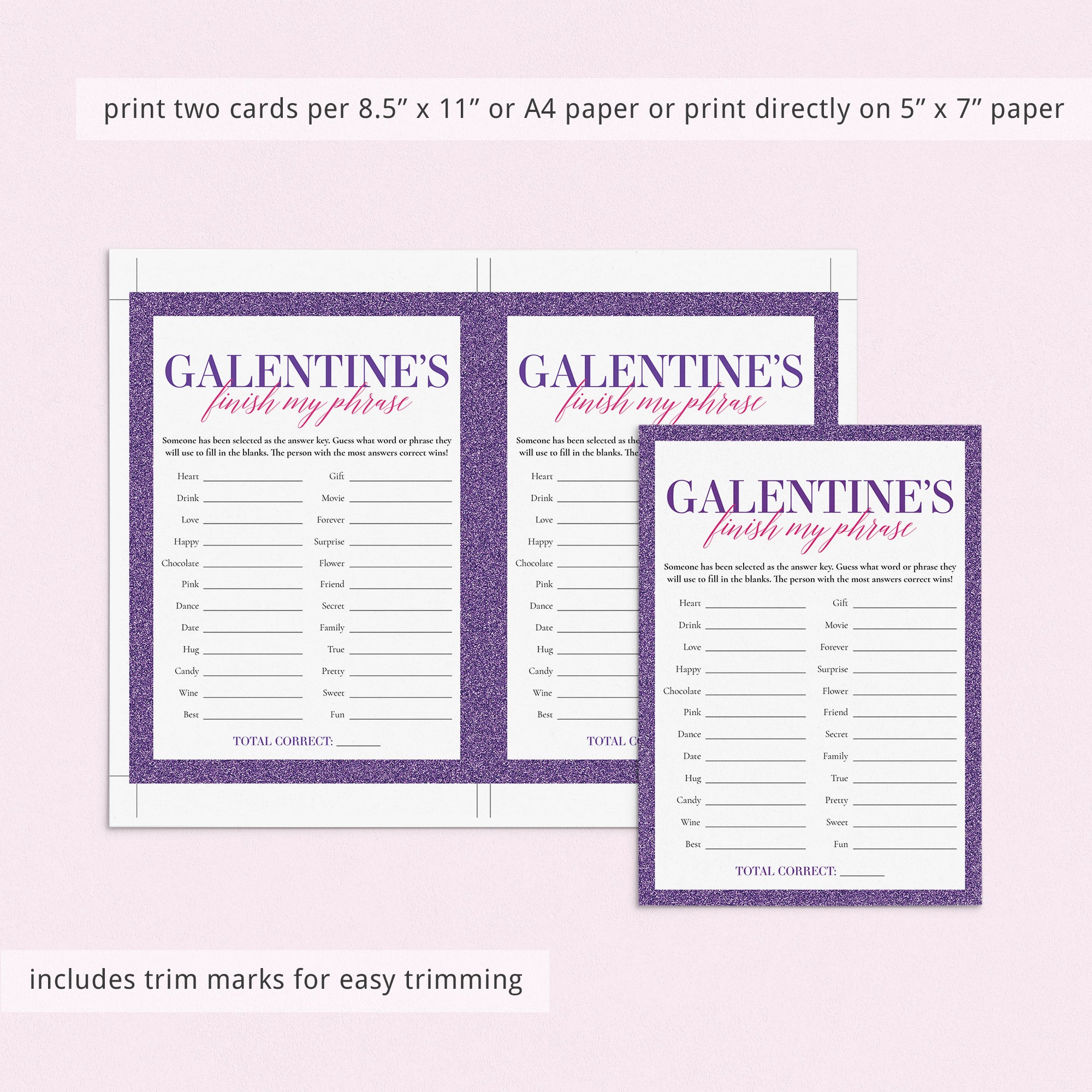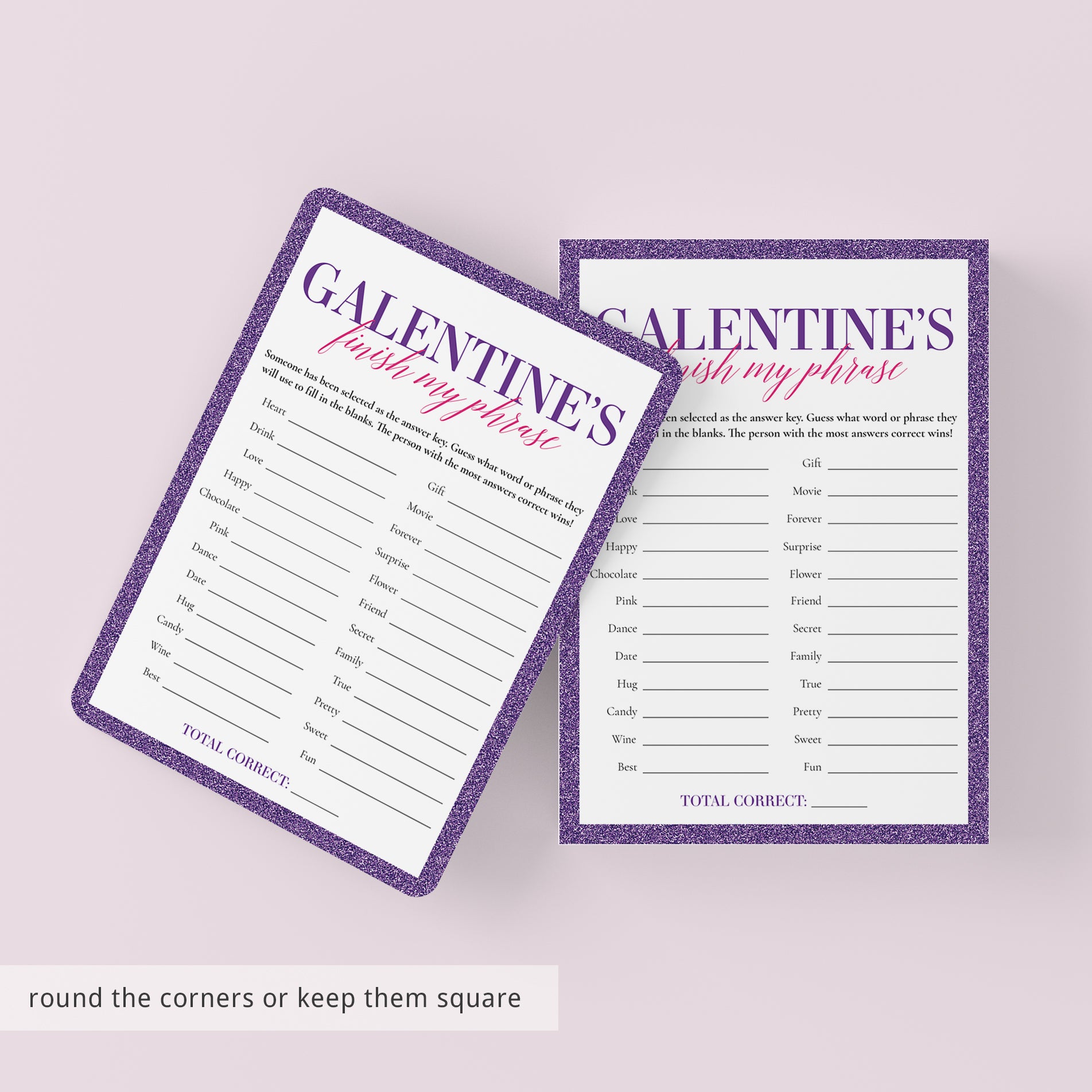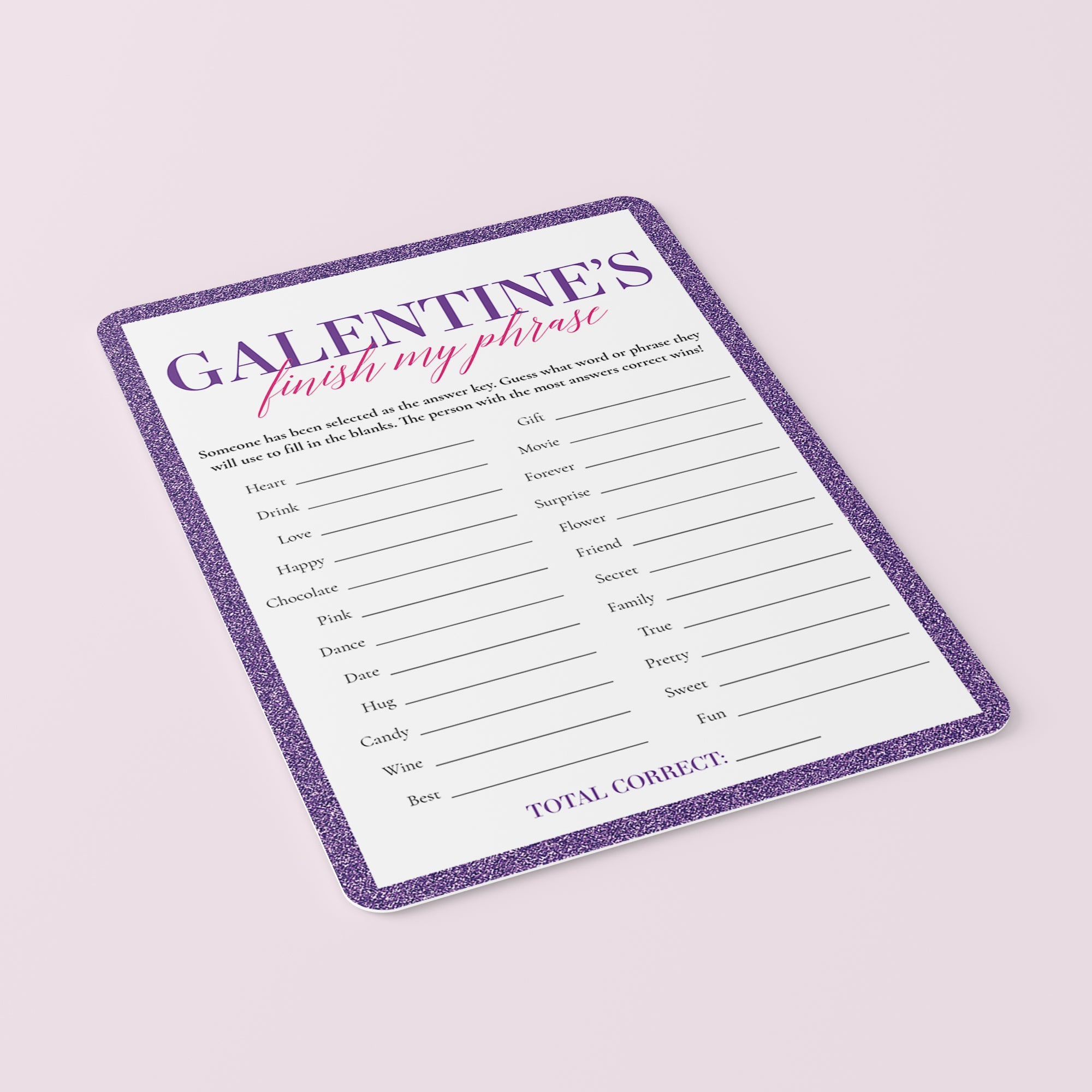 Finish That Phrase is a great game to kick off your your Galentine's Day Party. It is a fun Galentine's activity and very easy to play. This purple glittery game card will definitely get everyone excited.