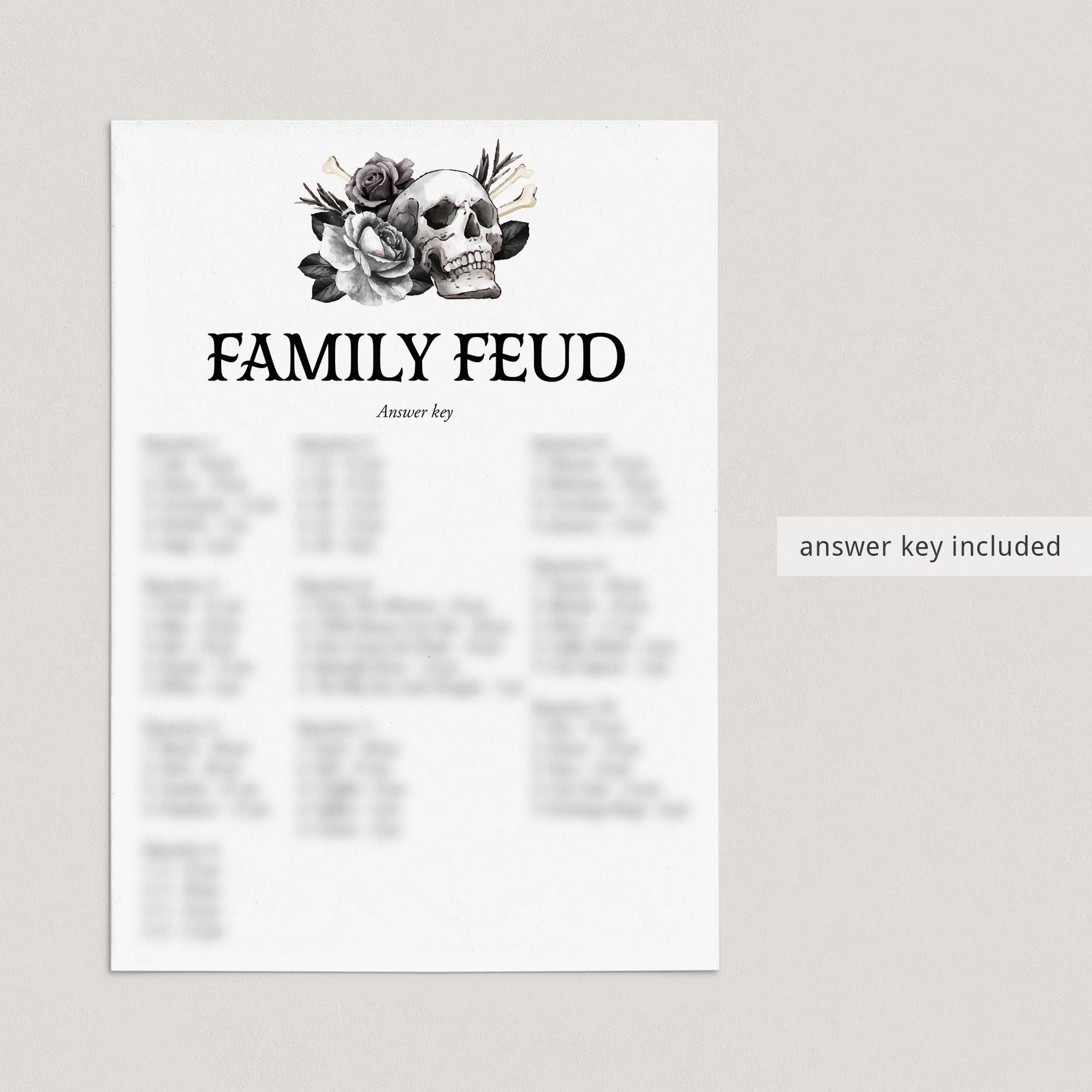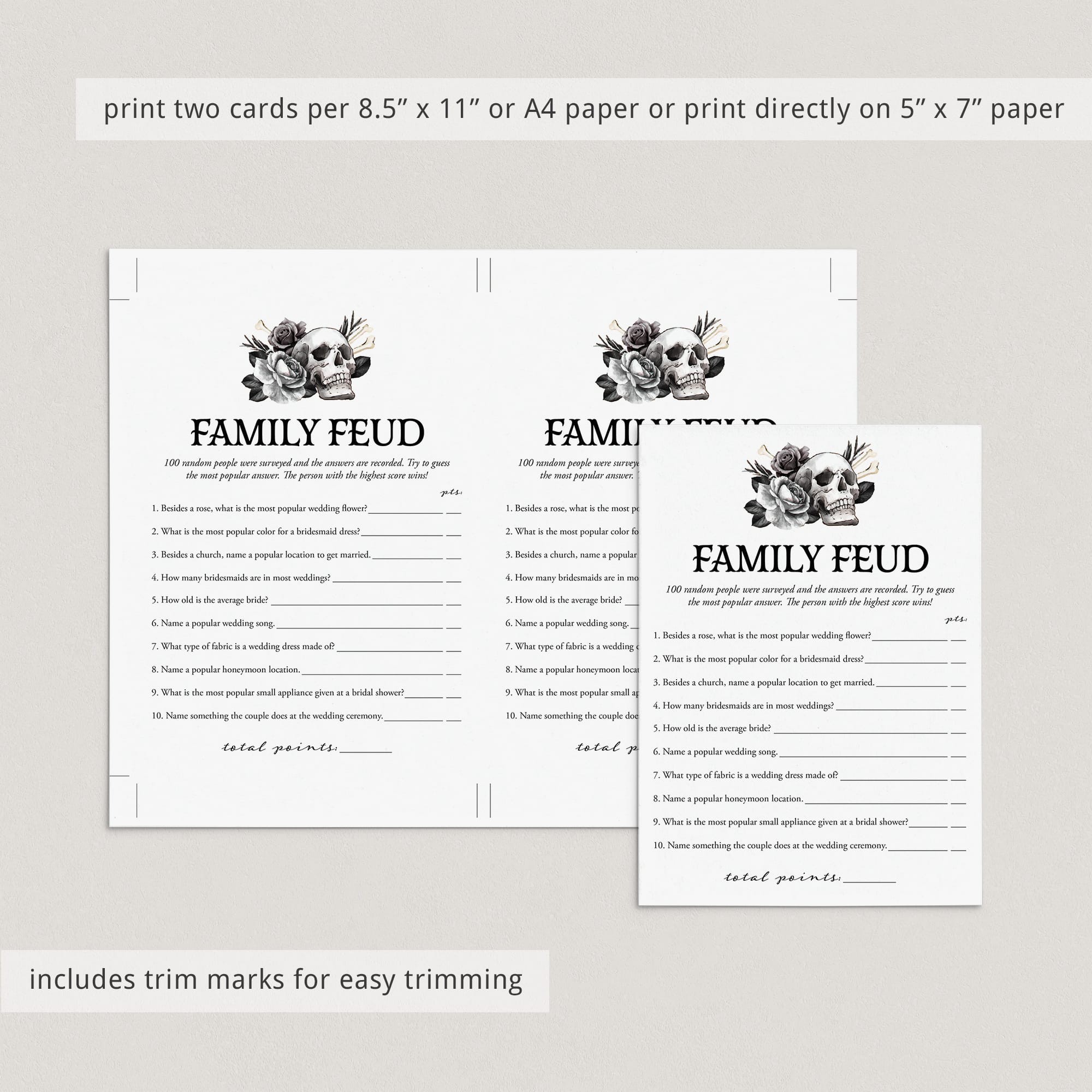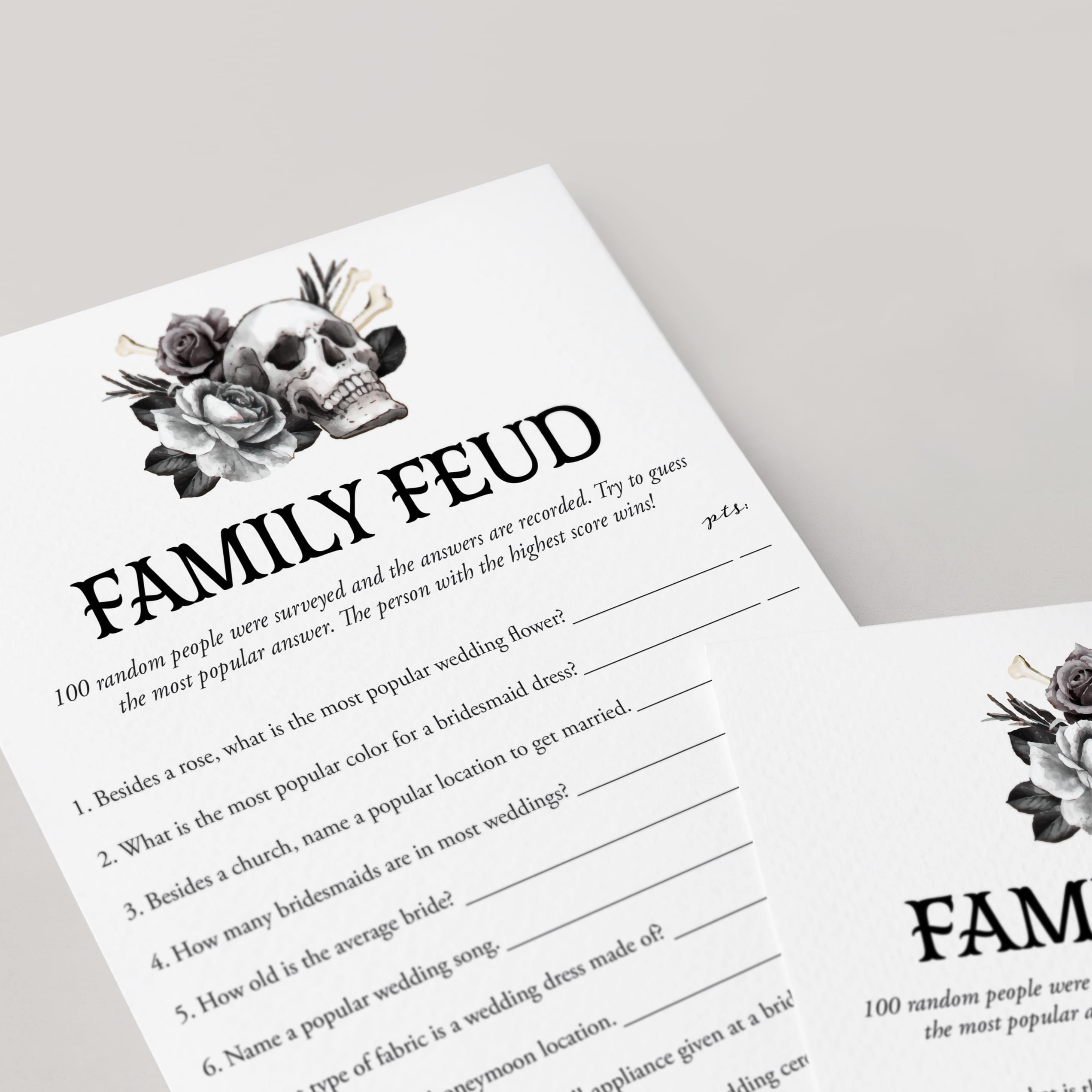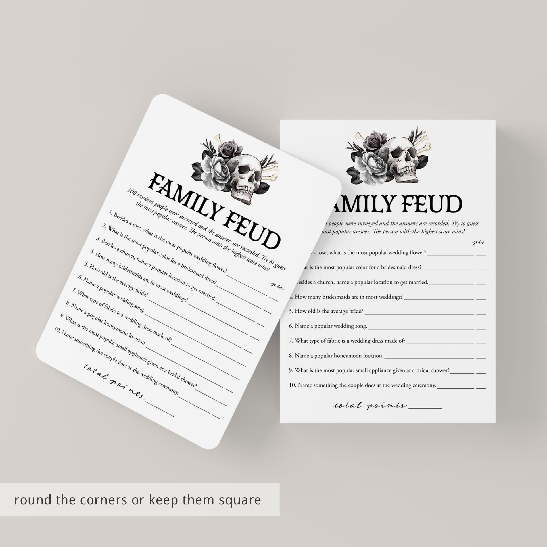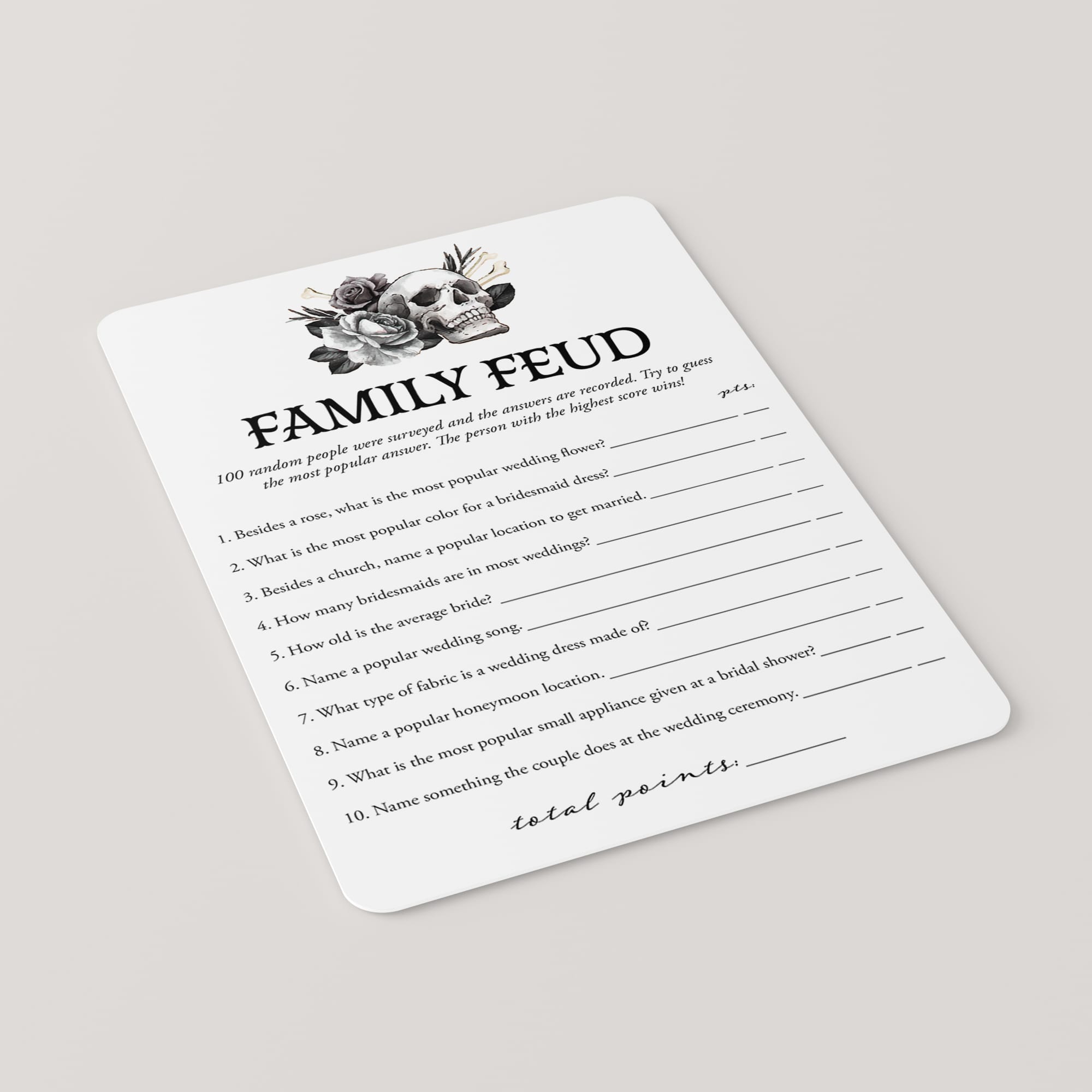 Add some fun to your goth theme bridal shower with this black floral skull Bridal Shower Family Feud game. Family Feud is one of the best games ever. Have your friends compete to guess the most popular answer to 10 bridal feud questions. An answer key with the Bridal Family Feud answers and points is included. The person or team with the highest score wins!