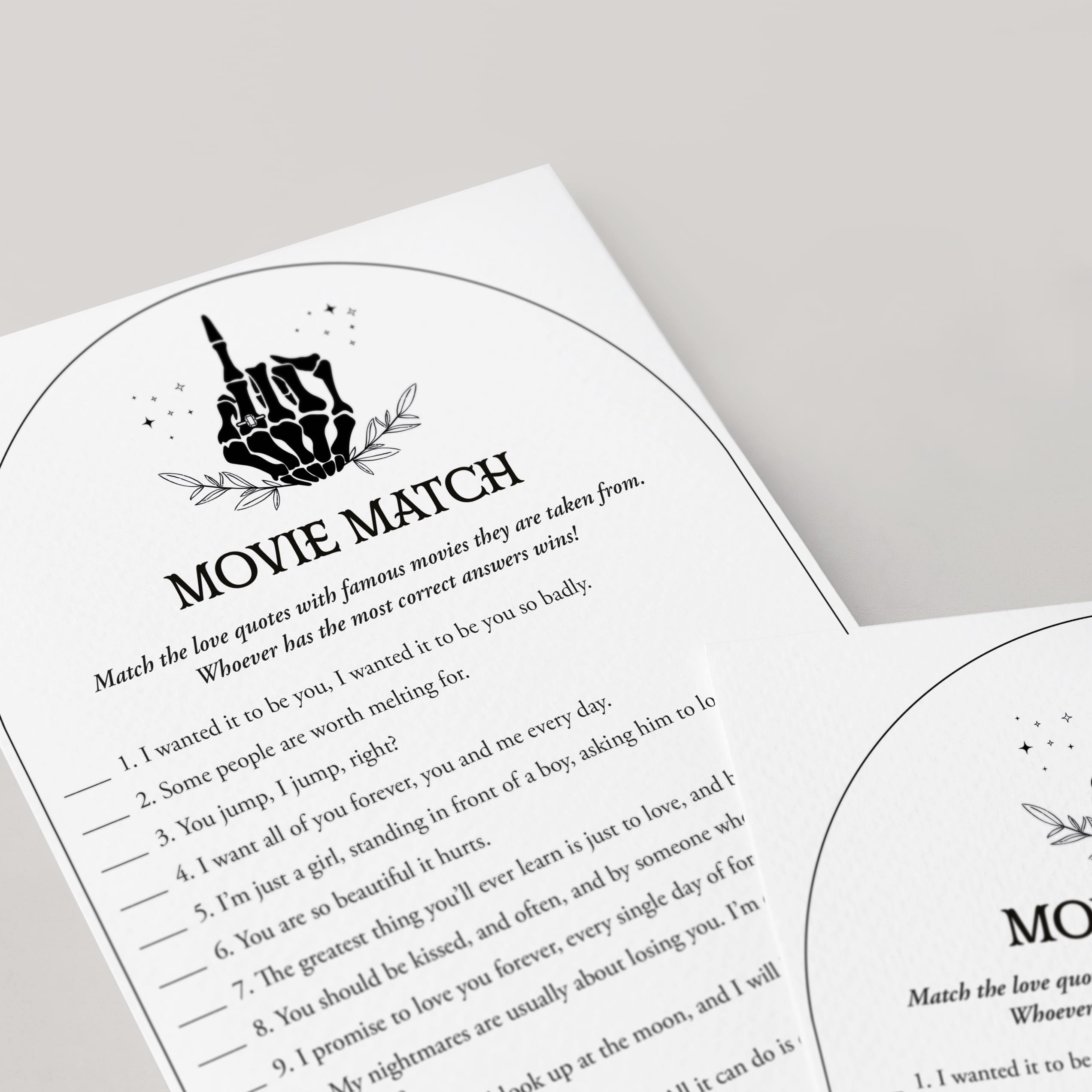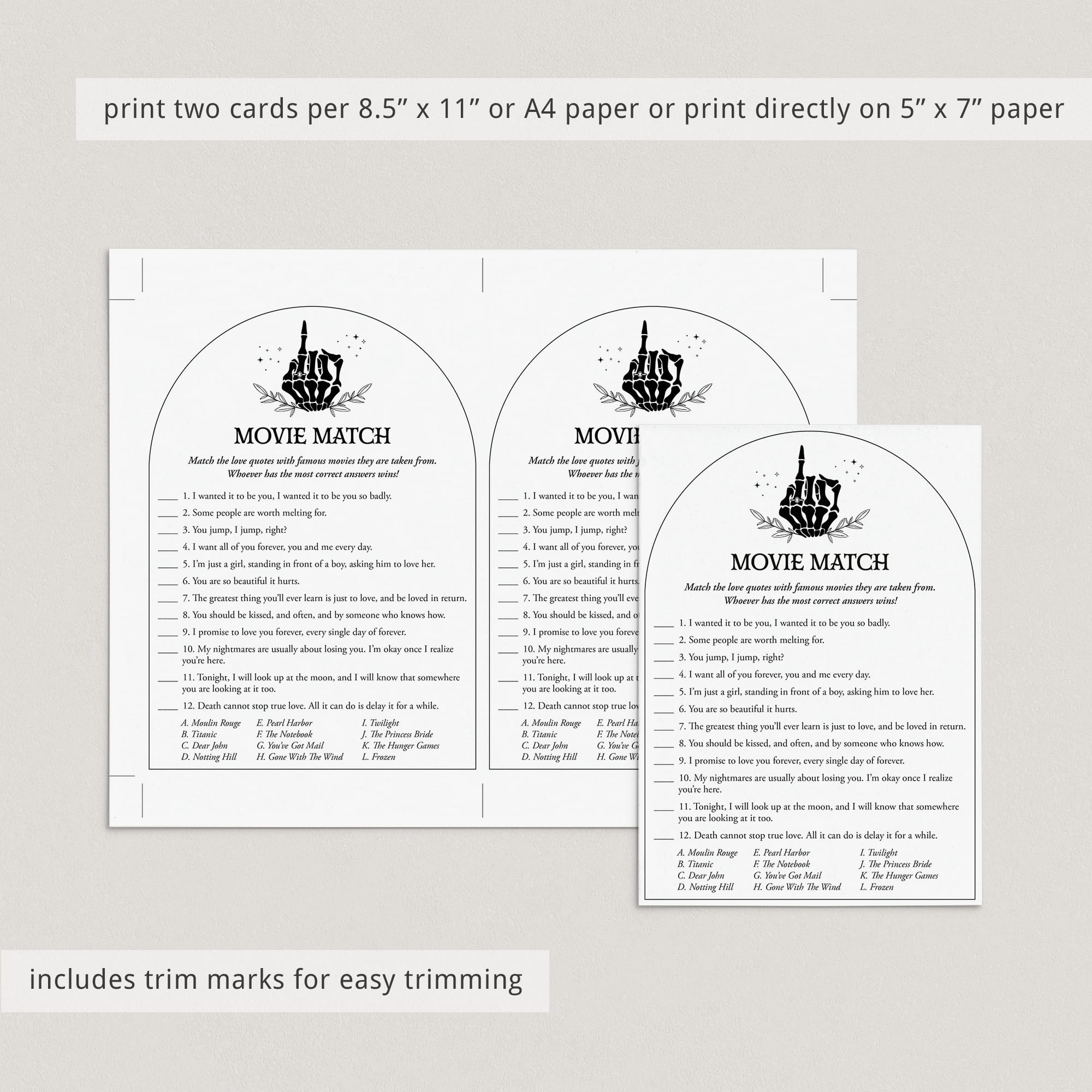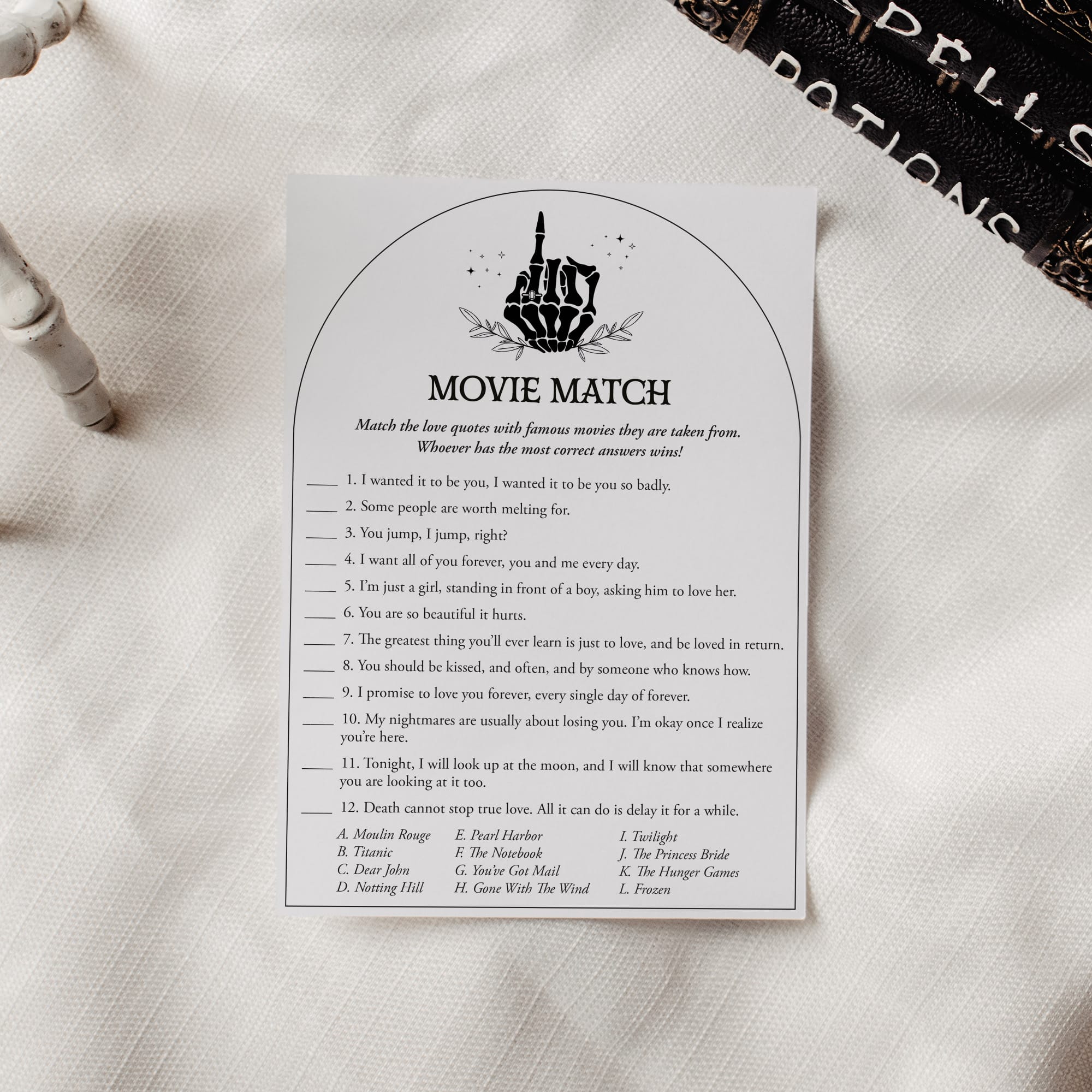 You think you know your romantic movies? This Goth Bridal Shower Movie Match game will put you to the test. It's the perfect game for romantic movie fans and will sure get the girls at your Till Death Do Us Party bridal shower or Bride or Die theme bach party interacting, laughing and enjoying the thrill of competition.