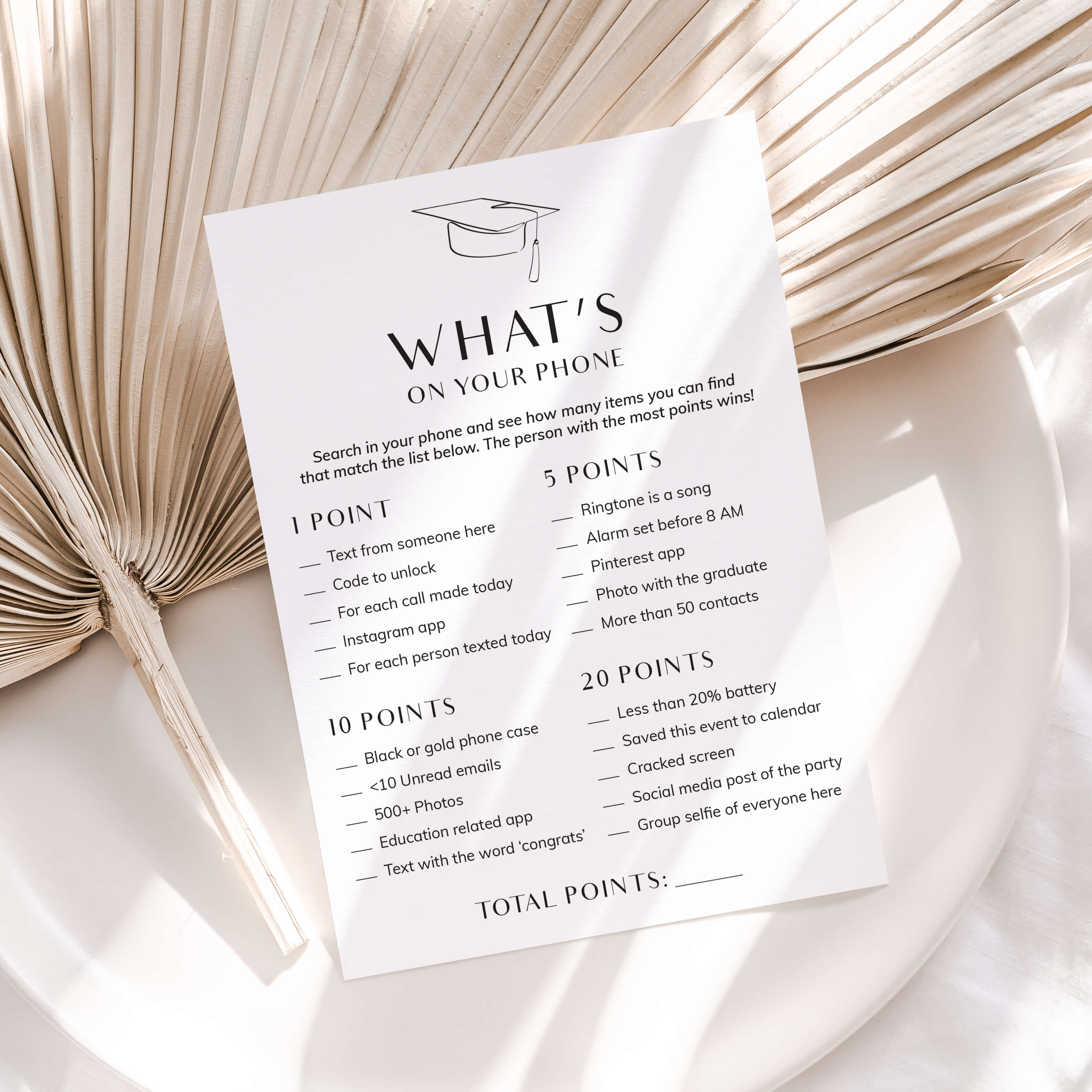 What’s On Your Phone is similar to the What’s In Your Purse game, but instead of searching for the items physically, your guests will just search for the listed items using their phone. They earn points for each item that they have in their phone. Things like having a black or gold phone case, a photo with the graduate, an education related app and much more. The person with the most points, wins!