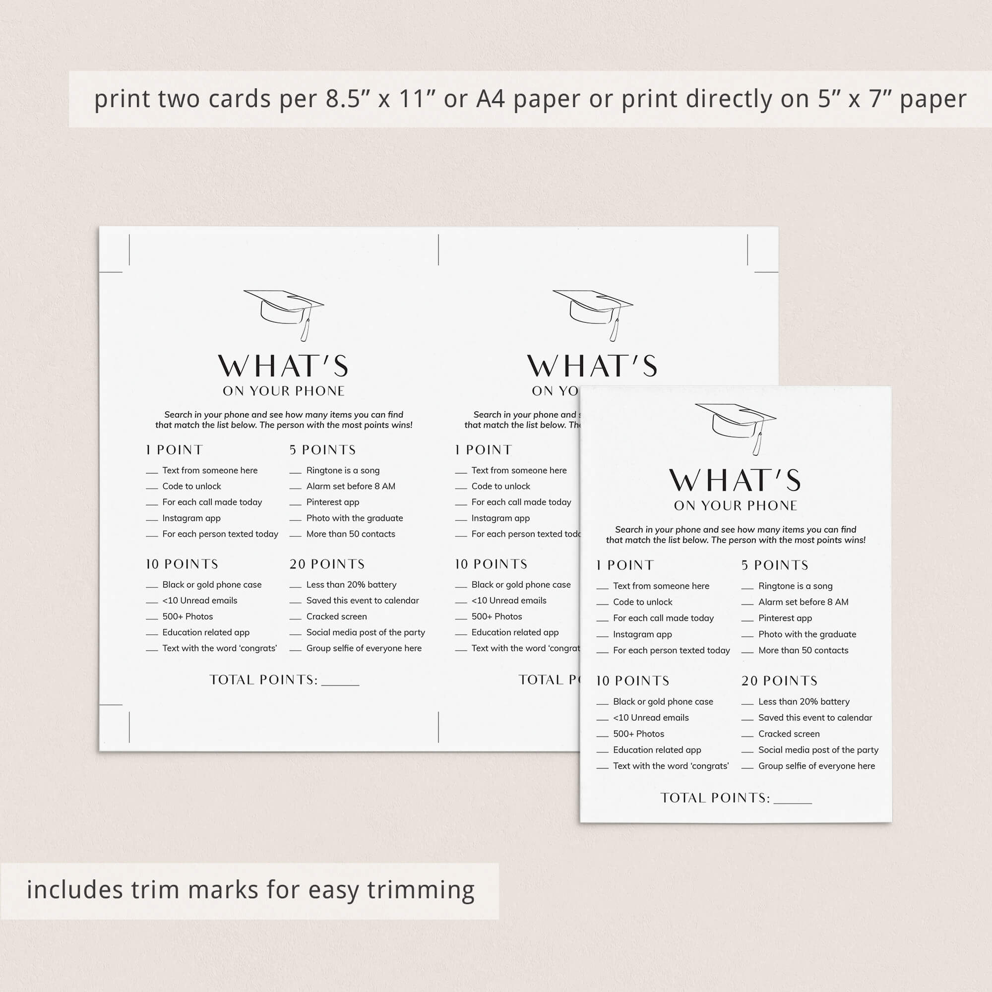 All guests need to play is a smartphone and one of these modern minimalist What's On Your Phone game cards with one line art graduation cap.