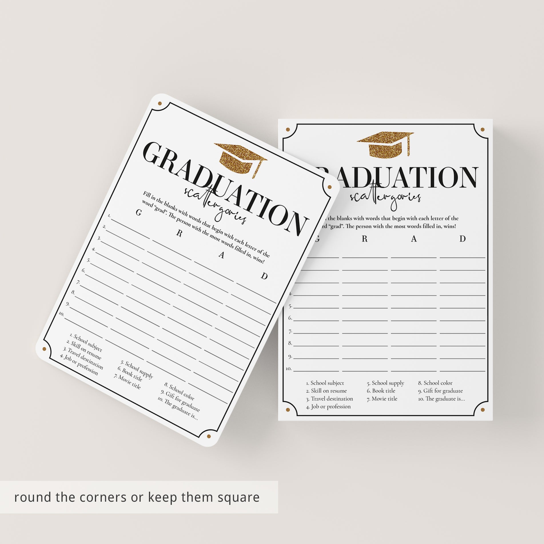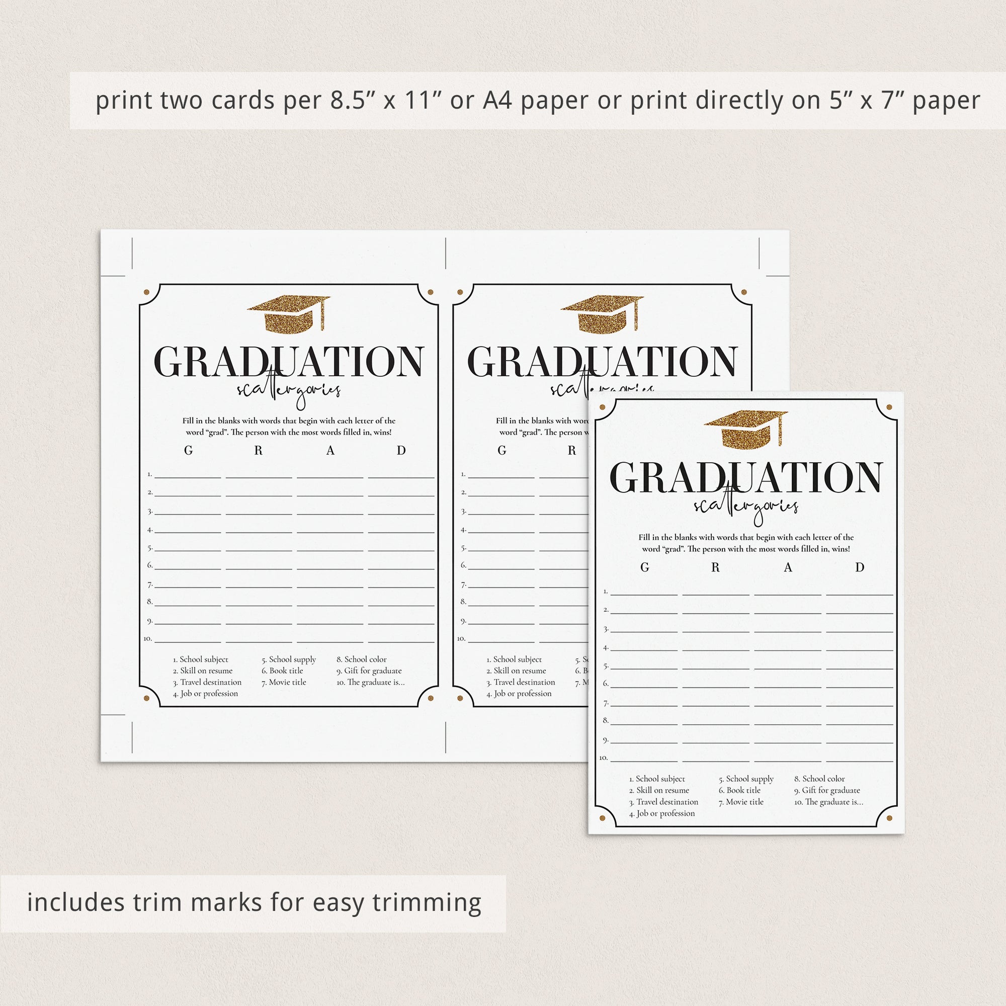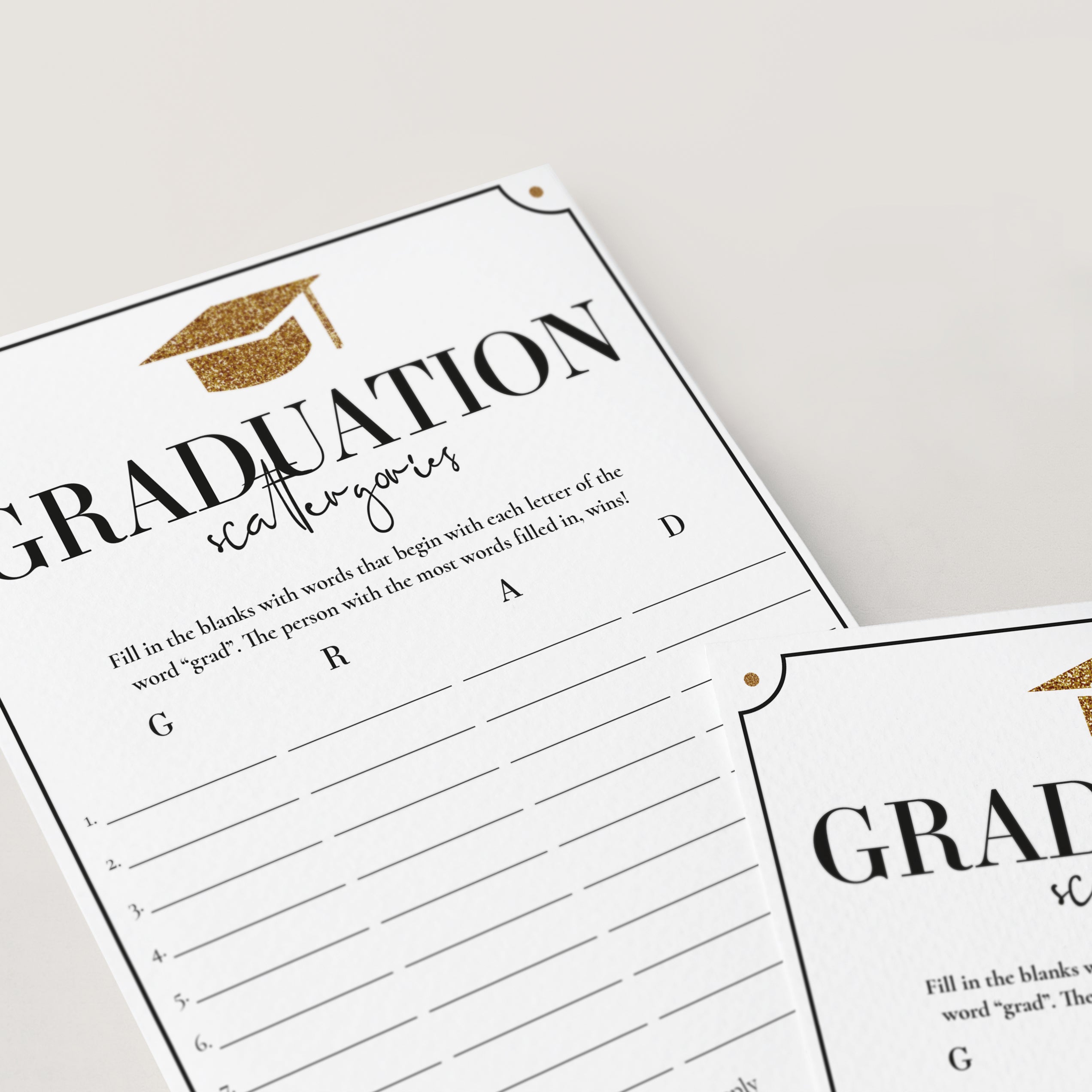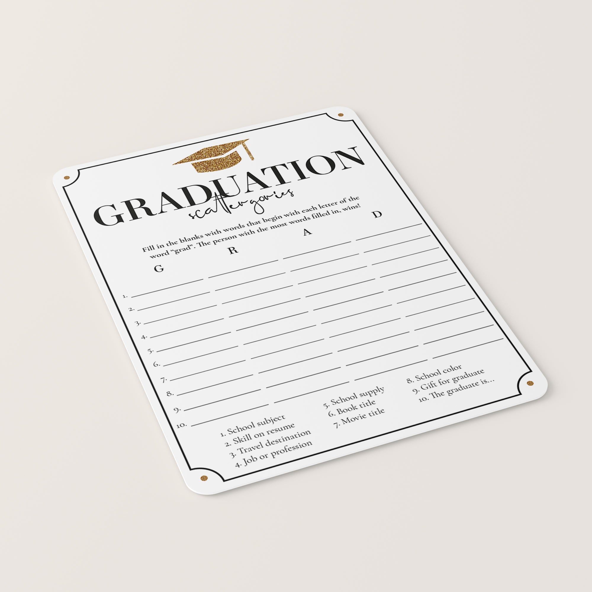 How many words can you fill in with the letters "G", "R", "A" and "D"? Play Scattergories at your Grad party with this fun Graduation game with gold glitter graduation cap.