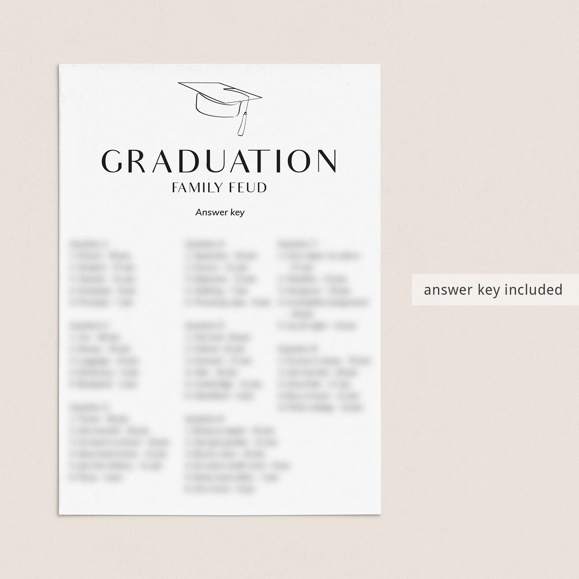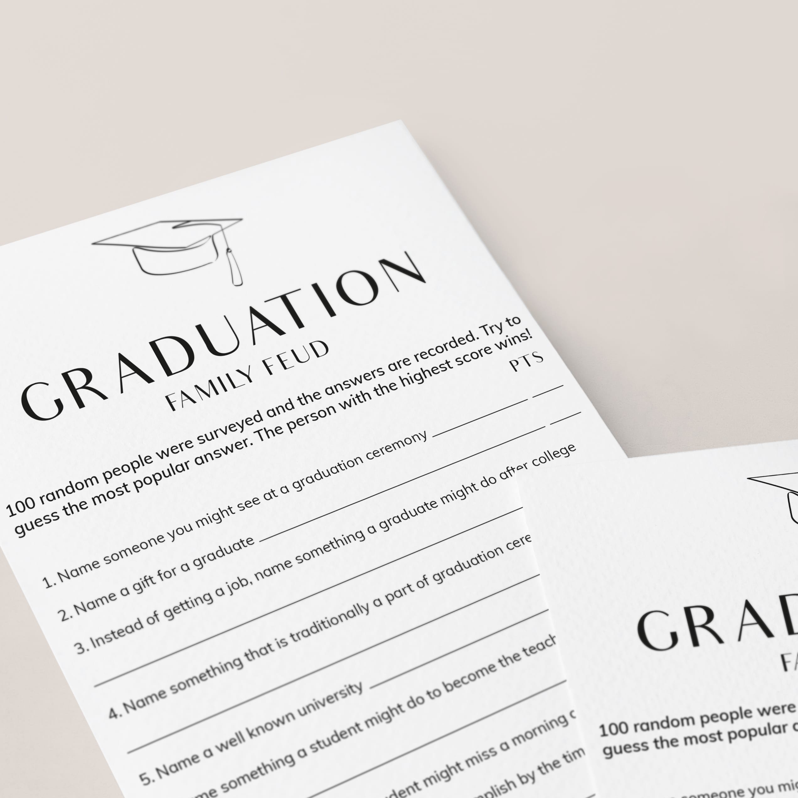 Add some fun to your Graduation Party with this modern minimalist Graduation Family Feud game. Family Feud is one of the best game shows ever. Have your friends and family compete to guess the most popular answer to Graduation themed Family Feud questions. An answer key with Graduation Feud Answers and Points is included. The person or team with the highest score wins!