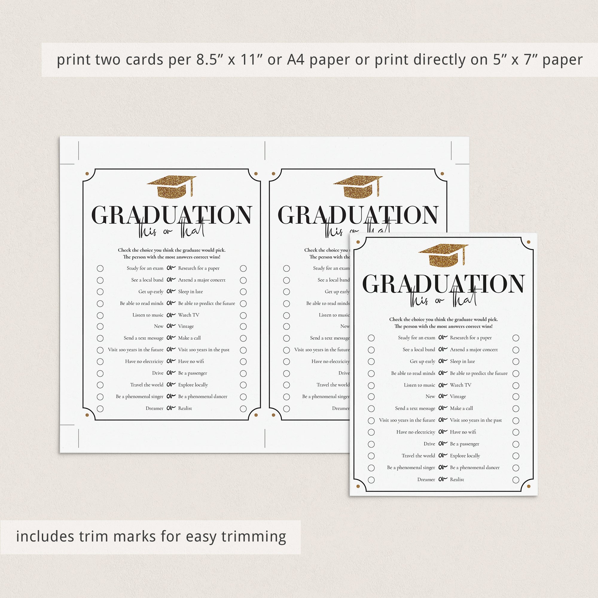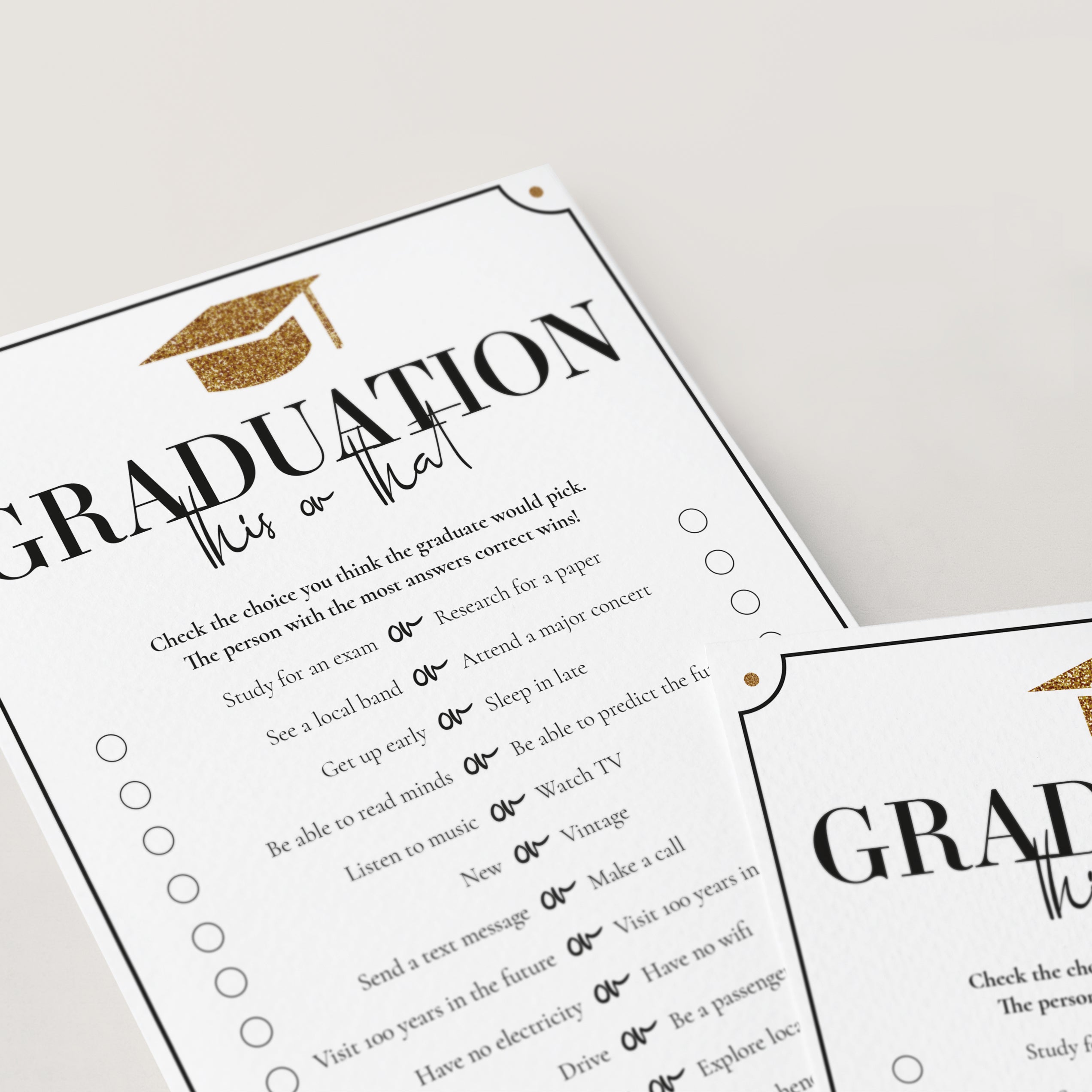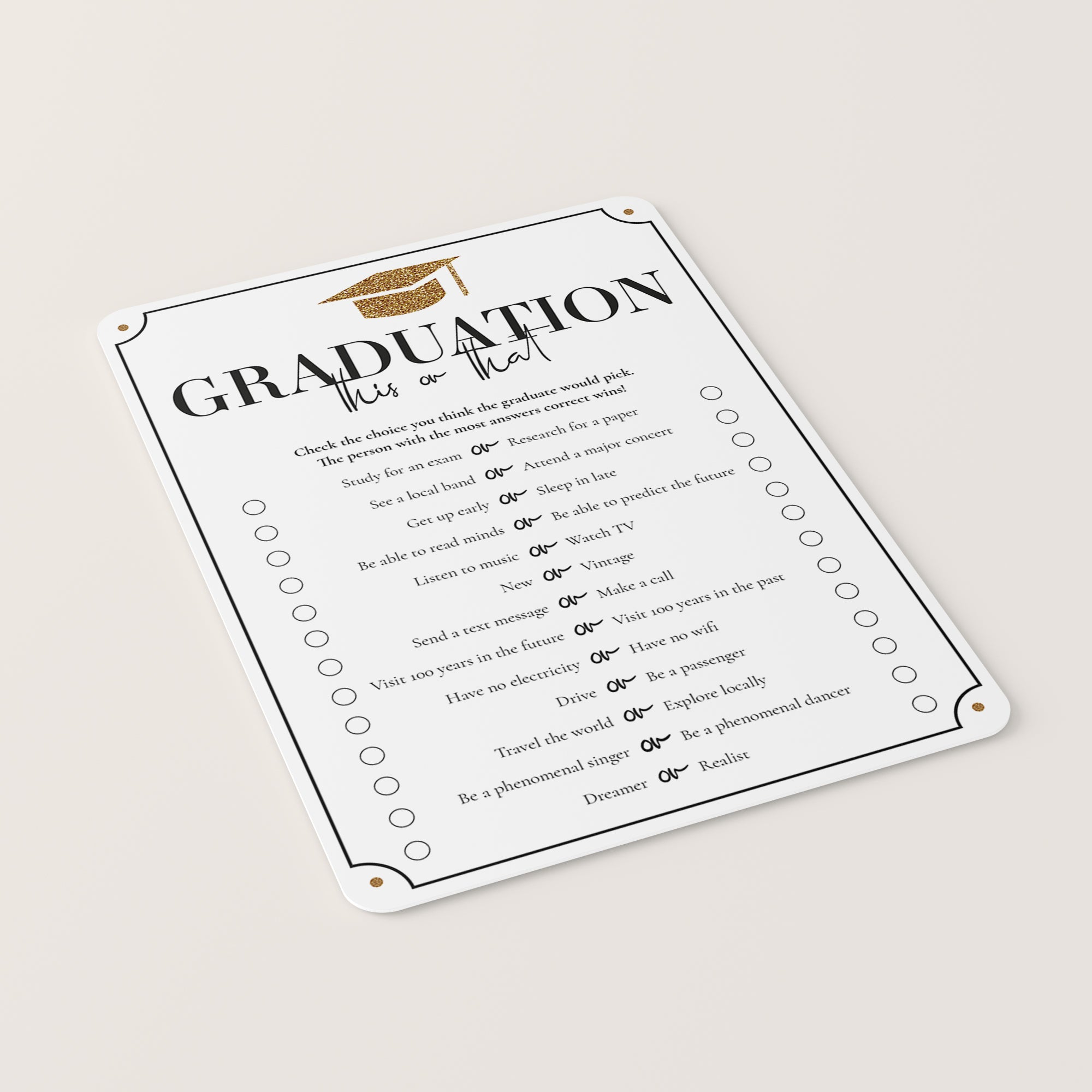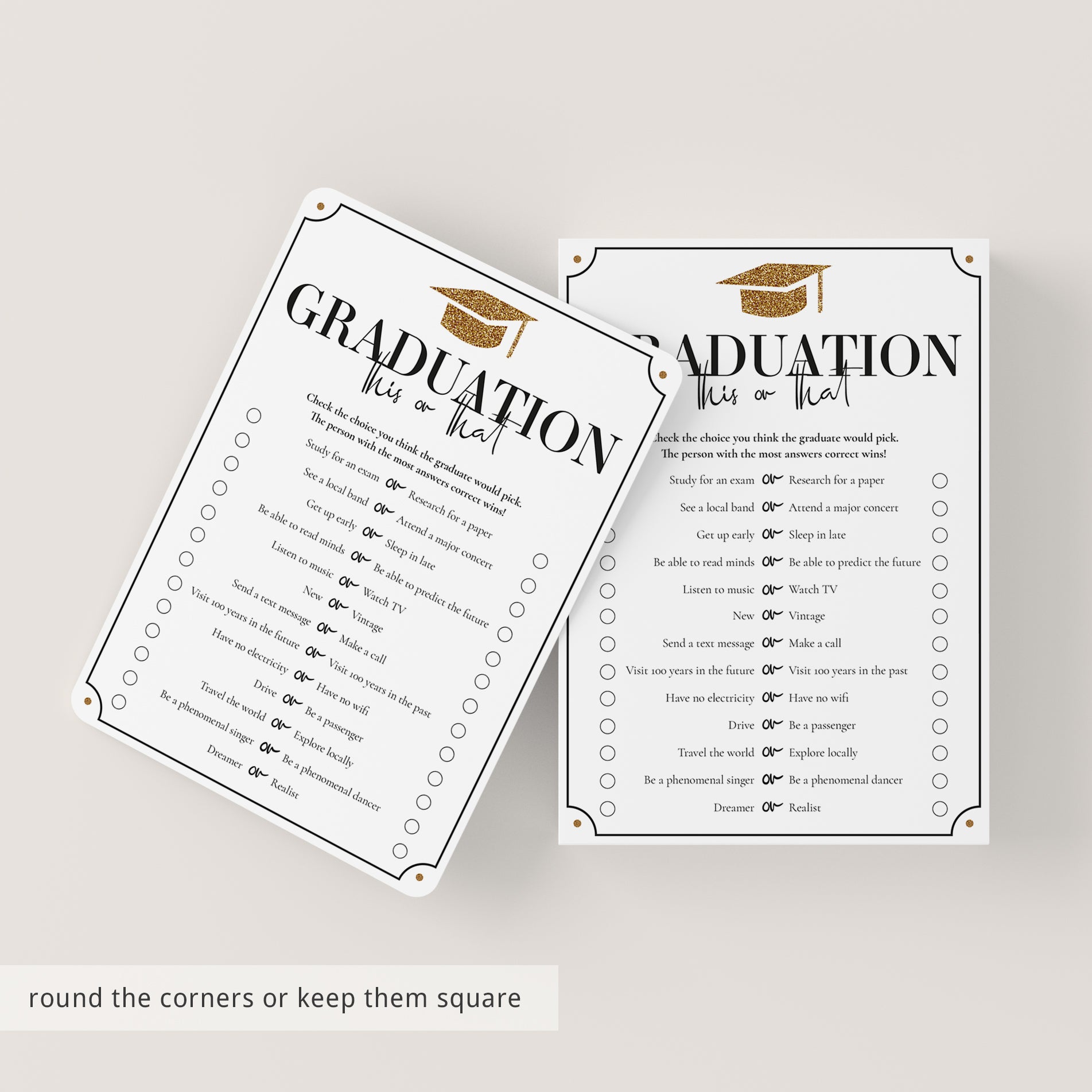 Are you looking for the perfect ice breaker to get people talking and in the party mood for your graduation party? Play Graduation Would They Rather This or That! After all, your guests have one thing in common: you know the graduate. This gold This or That game is the perfect addition to your grad party.