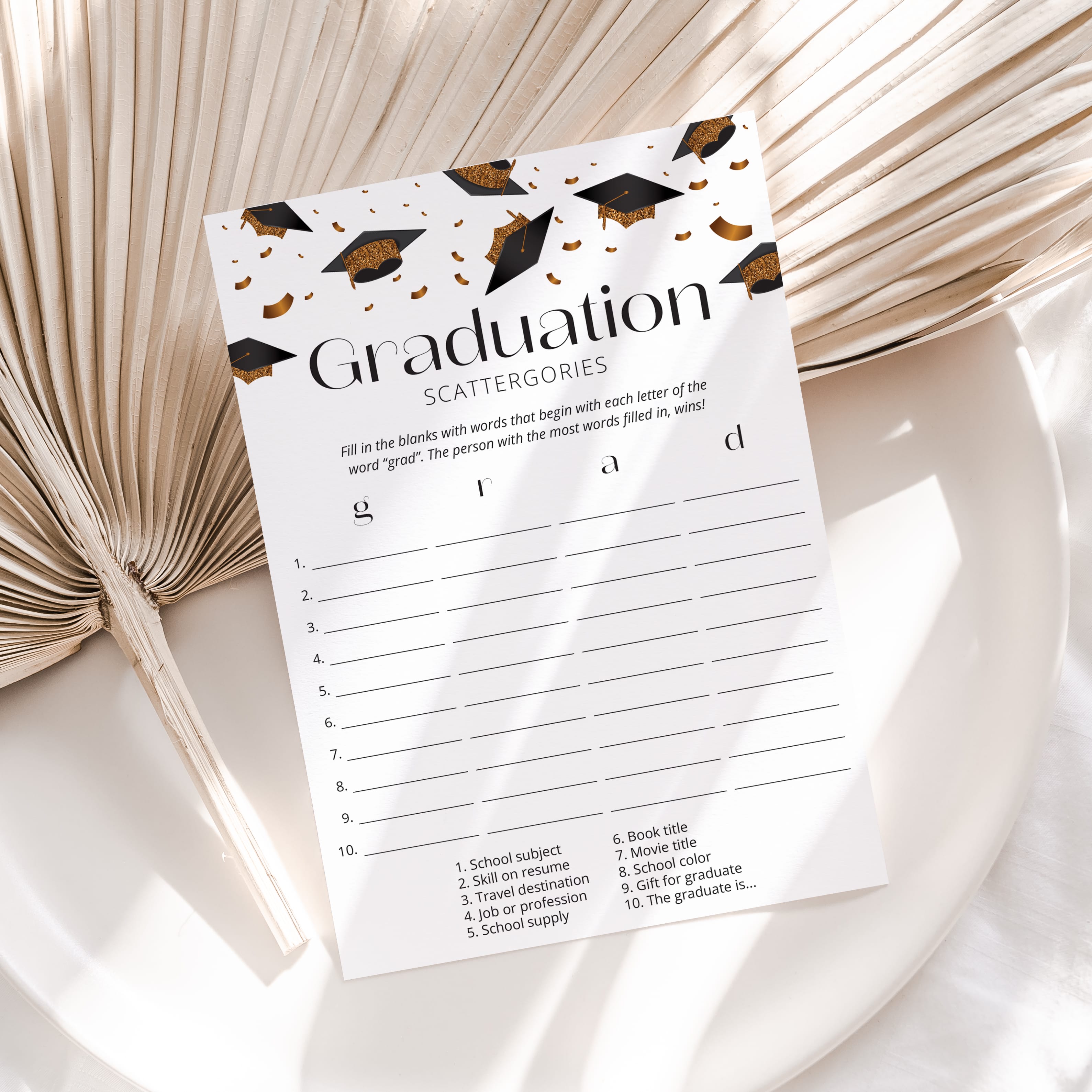 How many words can you fill in with the letters "G", "R", "A" and "D"? Play Scattergories at your Graduation party with this fun Graduation game with black and gold tossing caps.