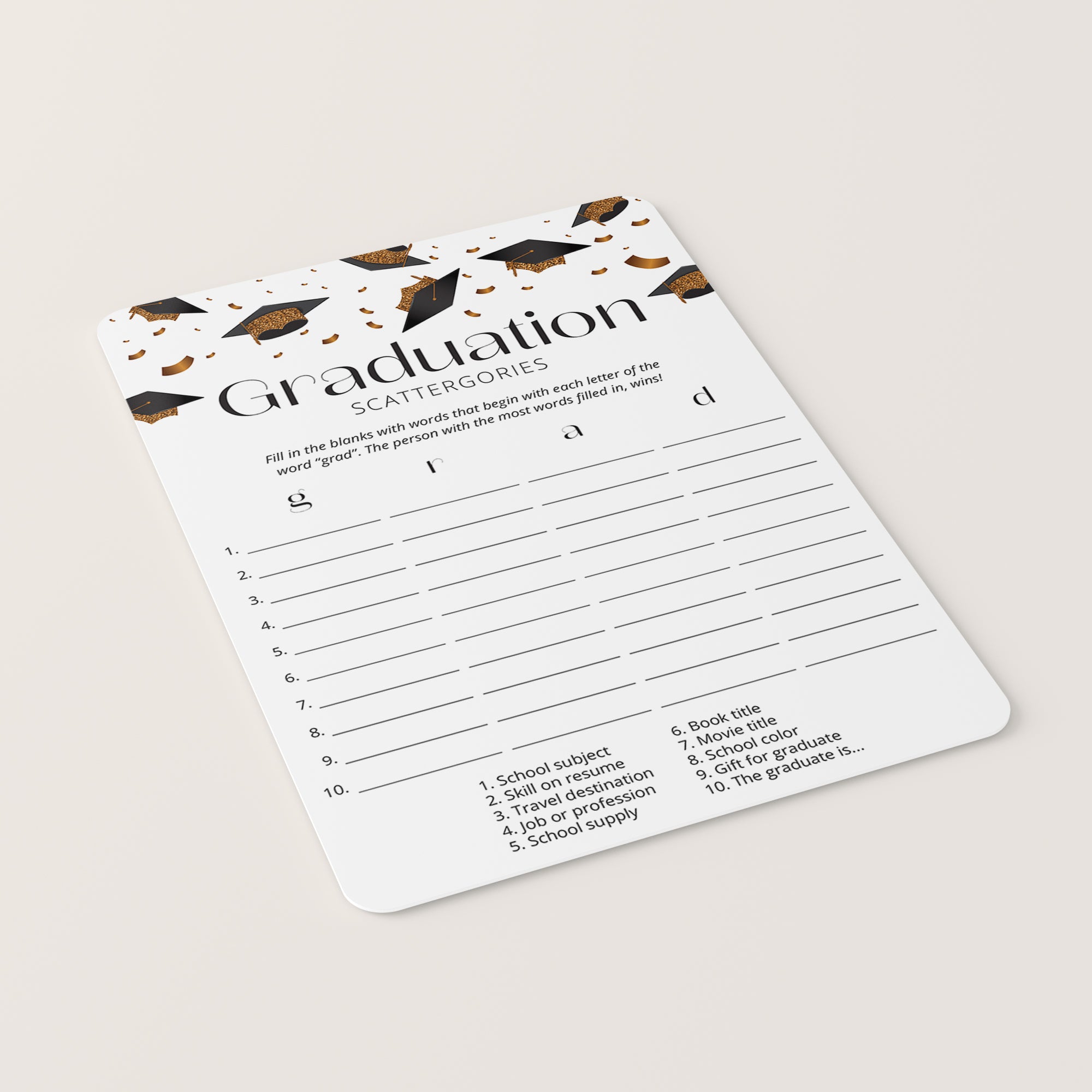 How to play the scattergories game? Simply hand out a game sheet and a pen to your guests. They will have to come up with as many words related to the Graduation categories at the bottom of the sheet. The difficulty is that the words must begin with the letters in the word "GRAD". The person that gets the most words filled in within the set time, wins!