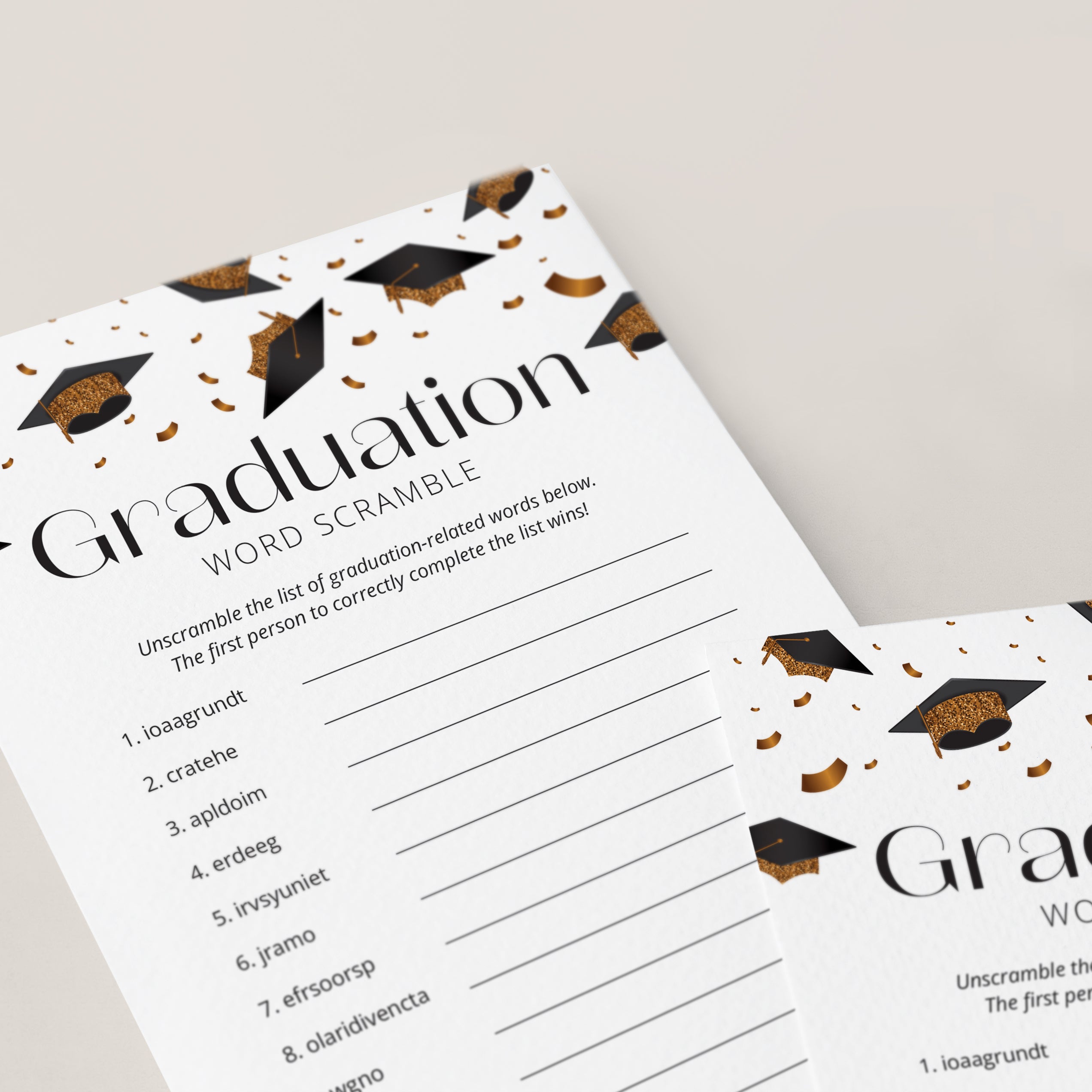 Are you hosting a Graduation Party? Add some extra fun with this black and gold graduation word scramble game. It's a ton of fun for all ages. Play this graduation game at a high school graduation party, college graduation party or even a preschool graduation. Games are a must for every grad party!