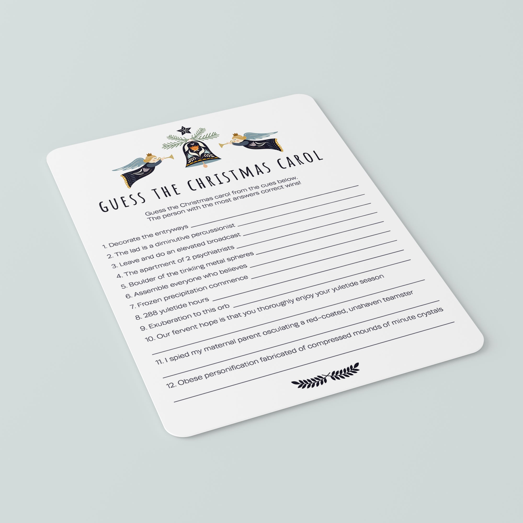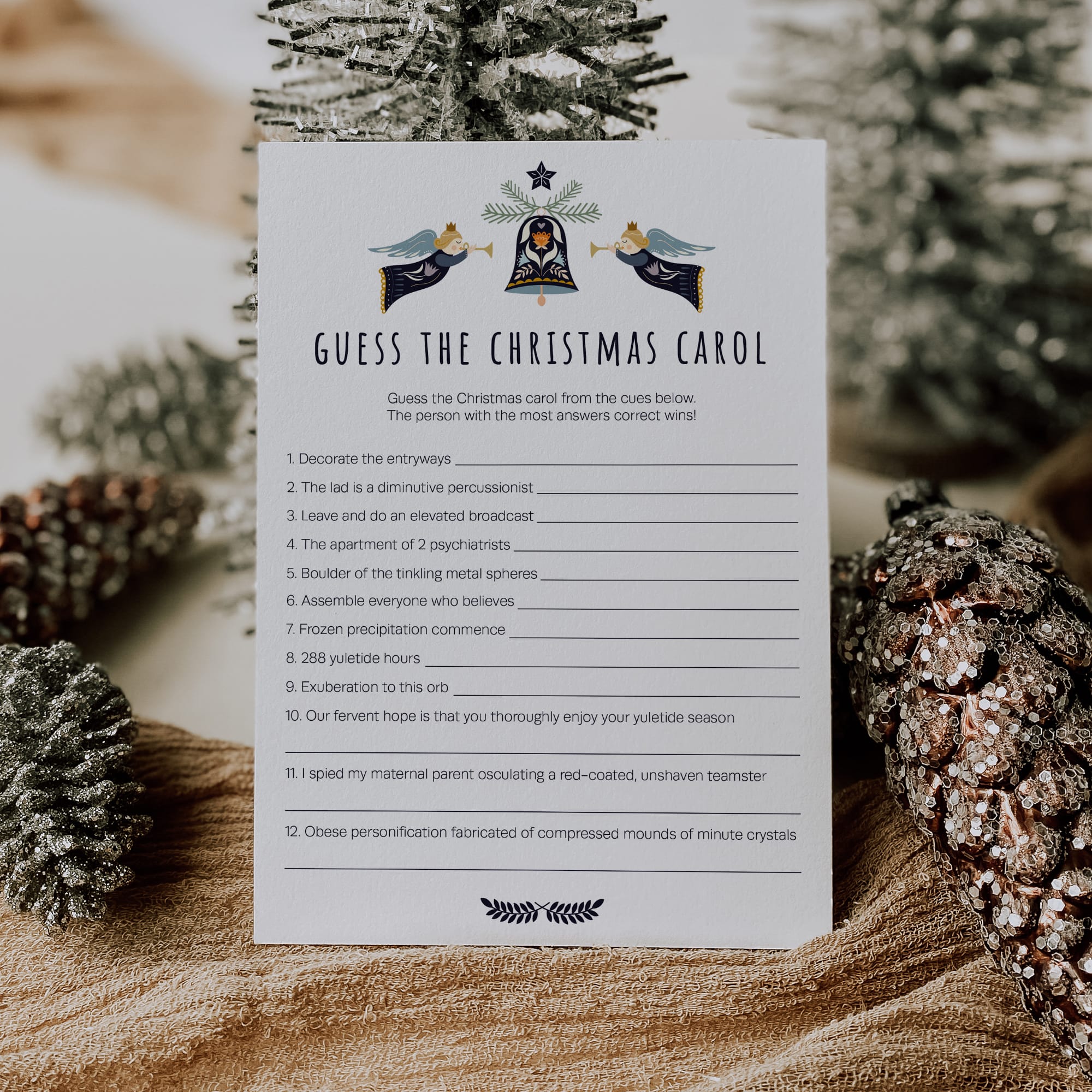 Guess The Christmas Songs is a fun holiday party game that involves guessing a popular Christmas carol by clue titles synonymous with the original titles. Some clues are easier than others, but it’s a fun game to start your party off with. For example “Decorate the entryways” is the Christmas song “Deck the halls”.