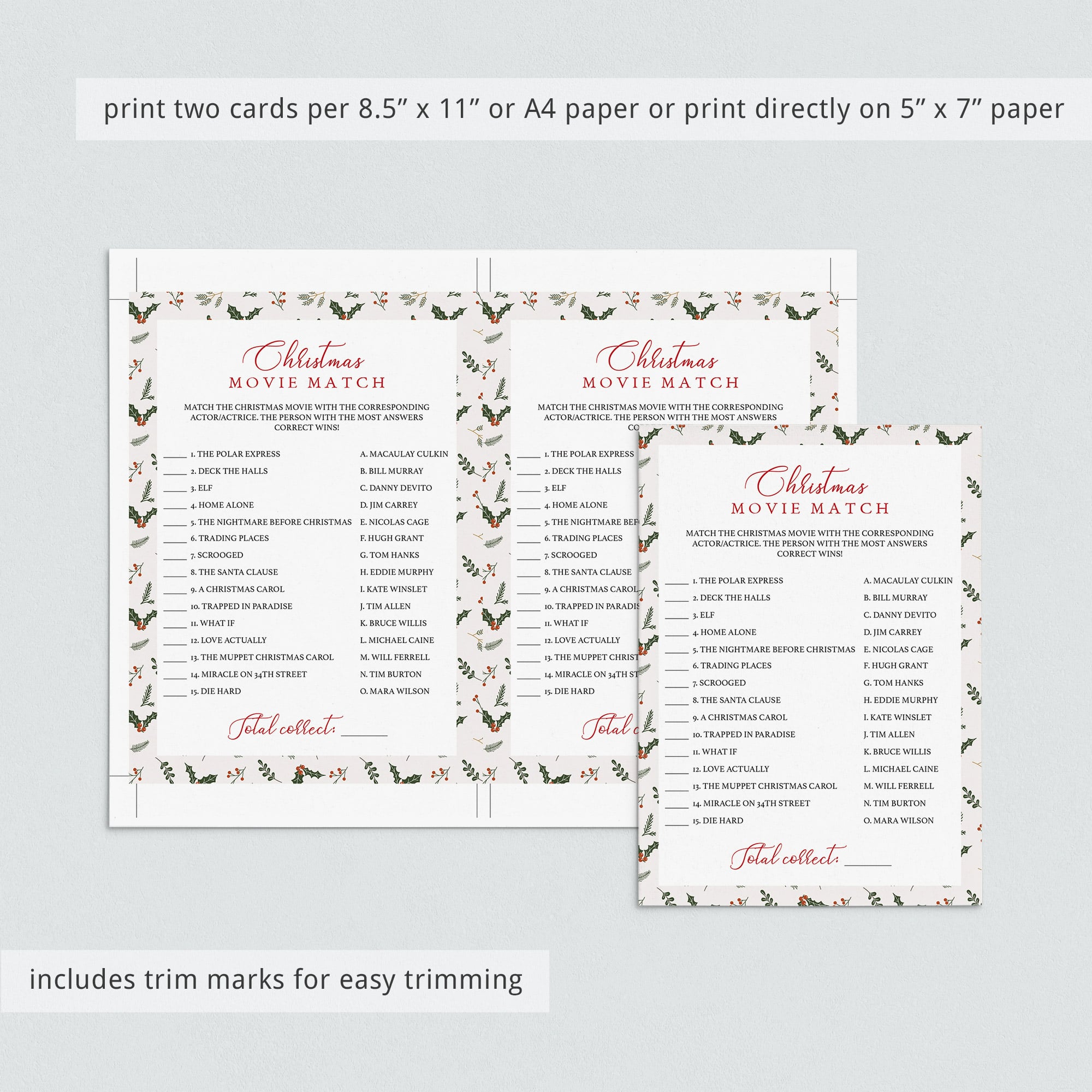 The holiday party games are are instant downloadable files. The games can be printed at the comfort of your home or ordered from a local or online print shop. You can print as many as you need. A detailed instruction guide, with tips & tricks on printing, trimming and paper choice is included.