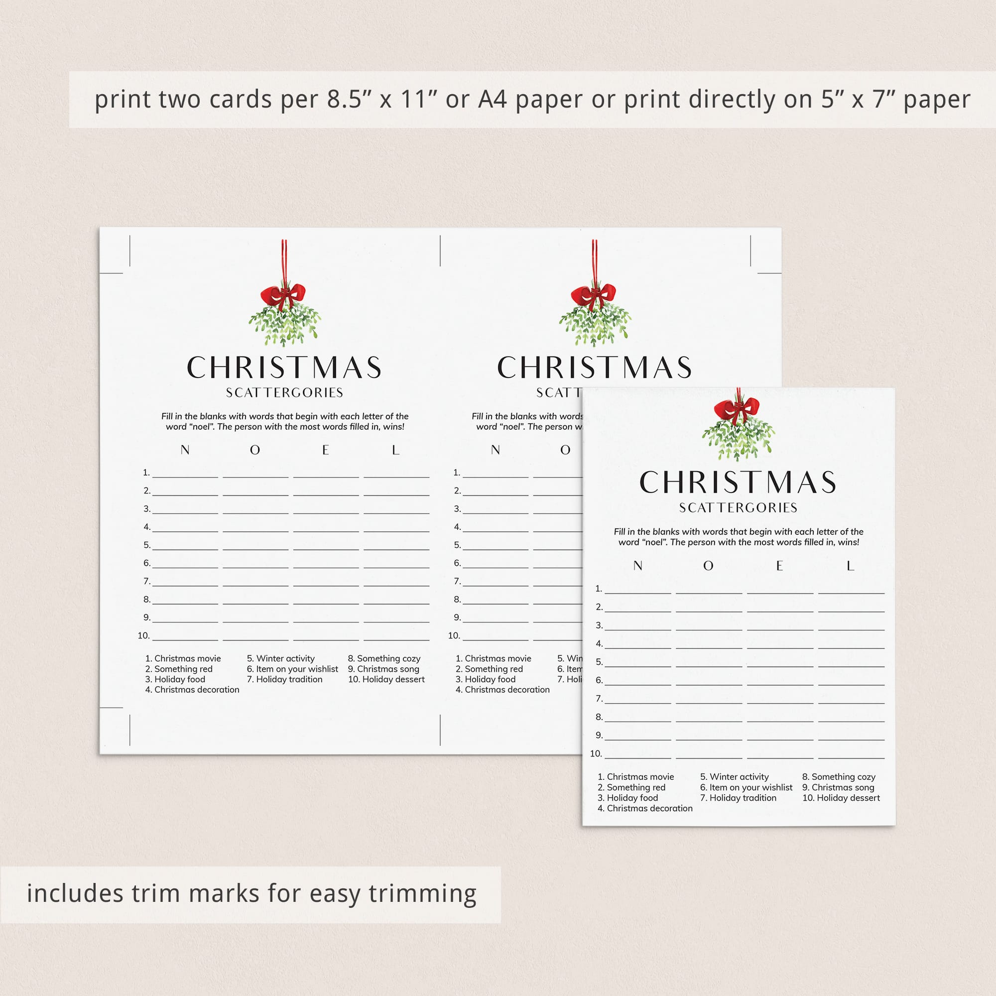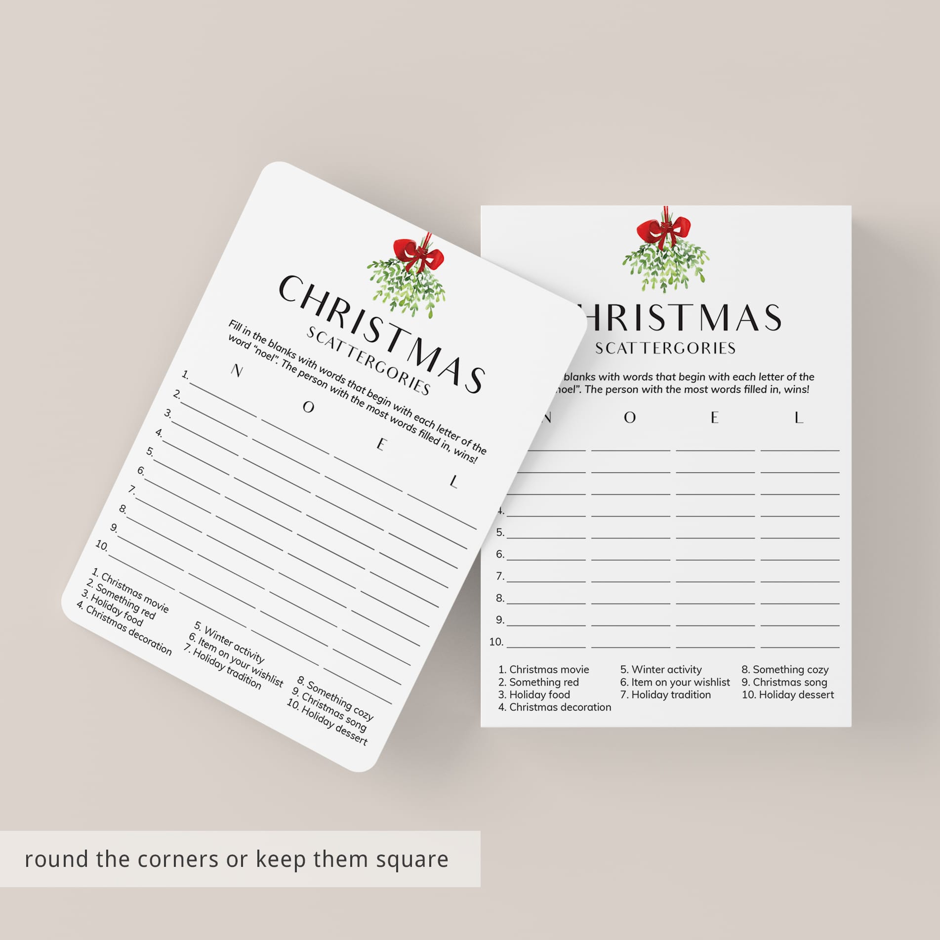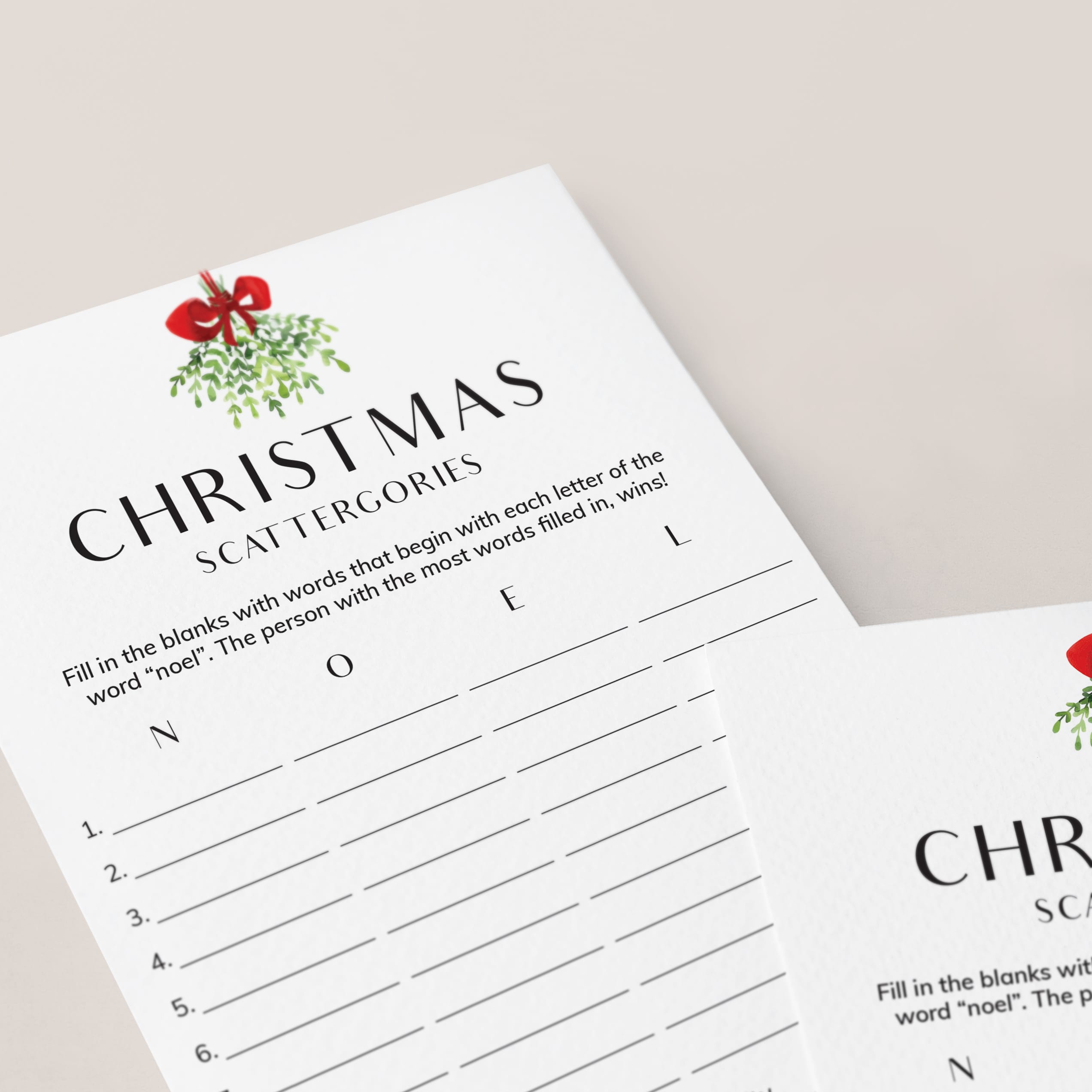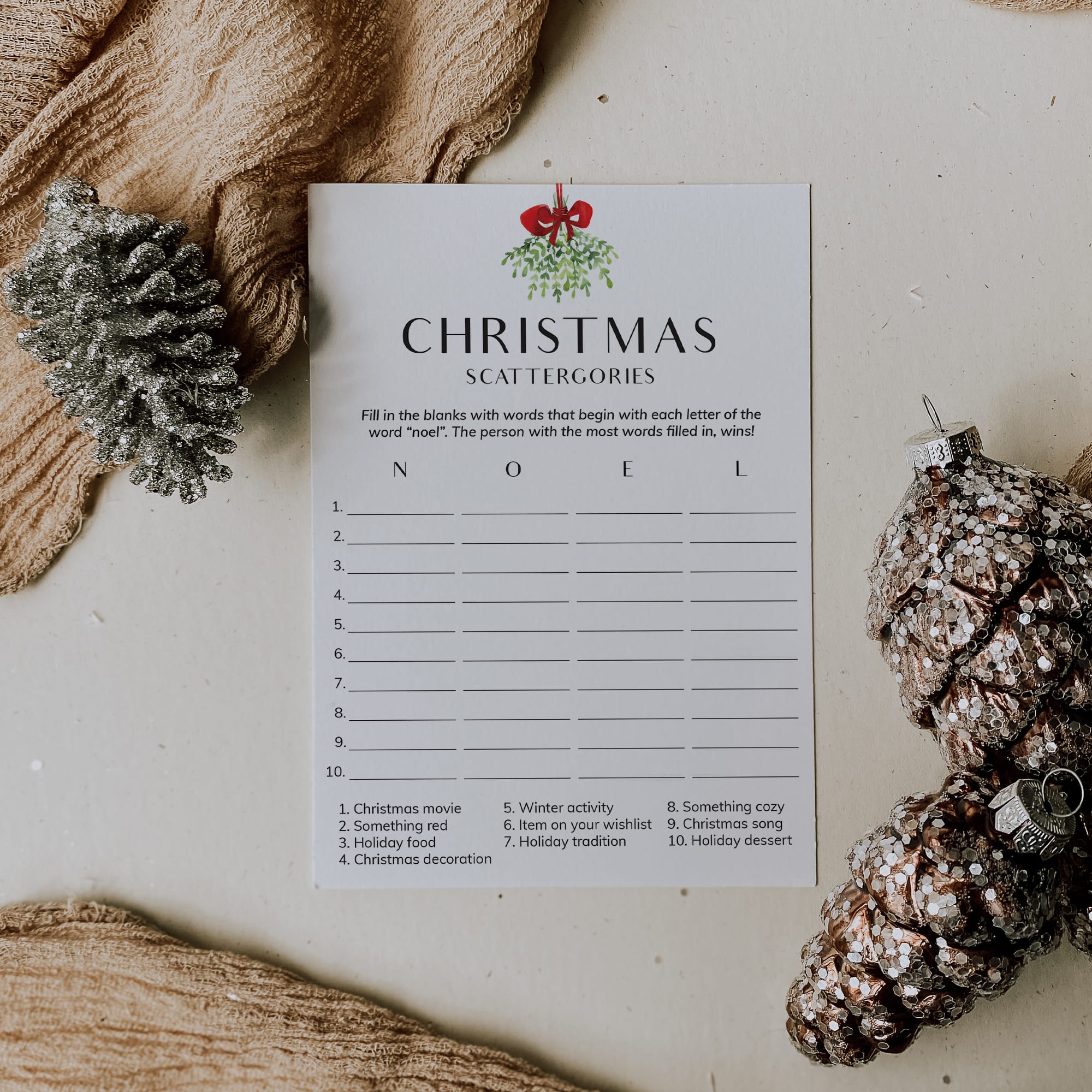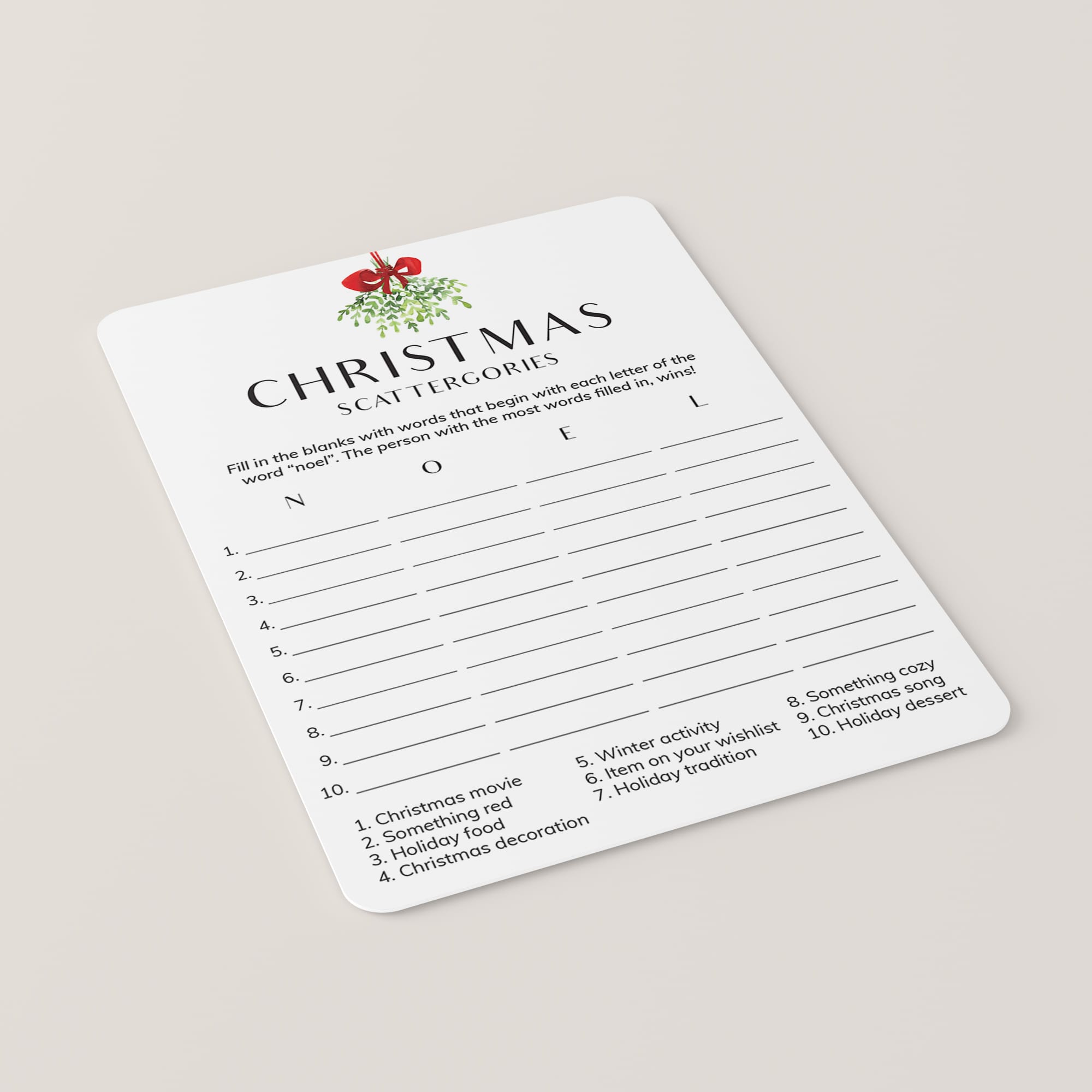 How to play the Scattergories game? Simply hand out a game sheet and a pen to your guests. They will have to come up with as many words related to the categories at the bottom of the sheet. The difficulty is that the words must begin with the letters in the word "NOEL". The person that gets the most words filled in within the set time, wins!