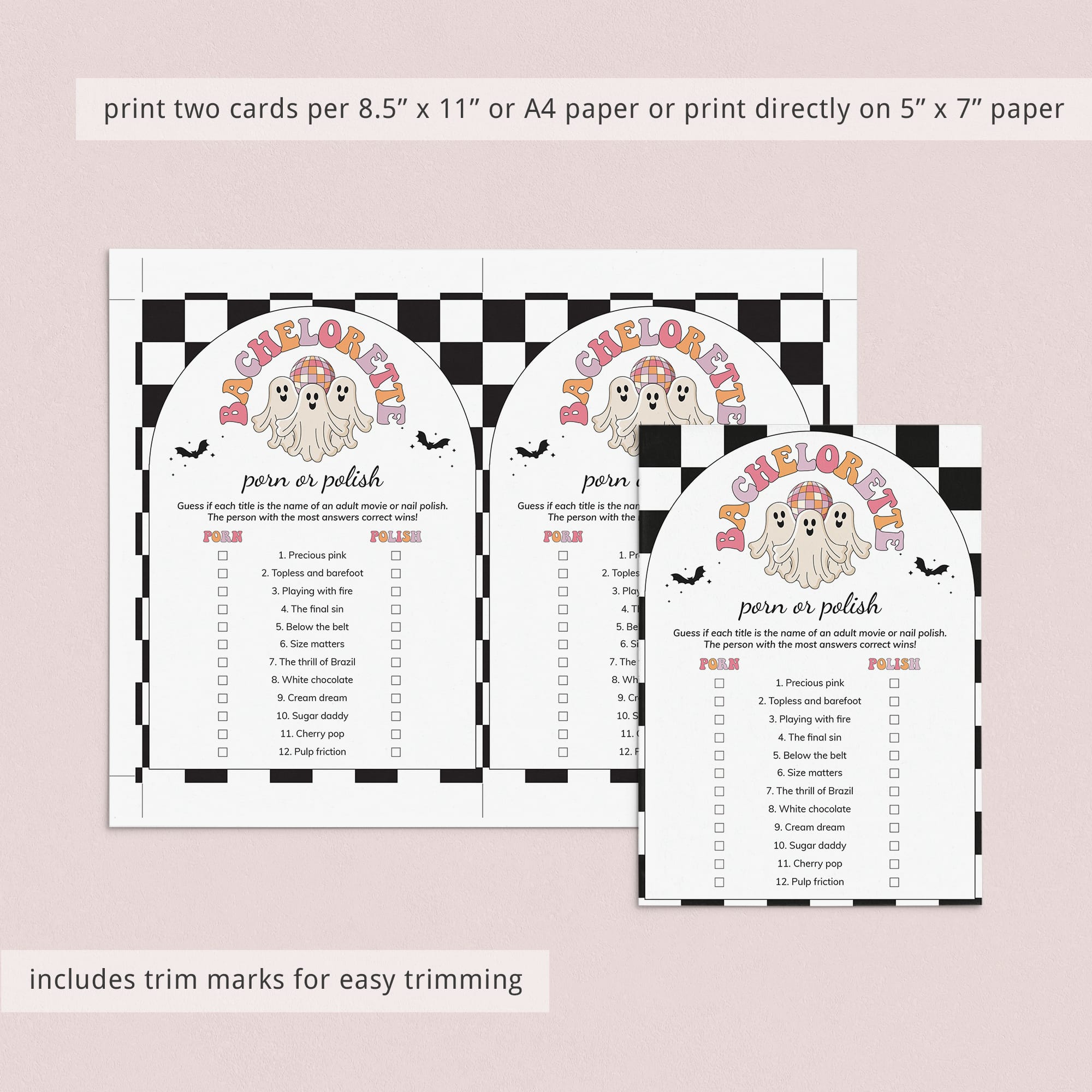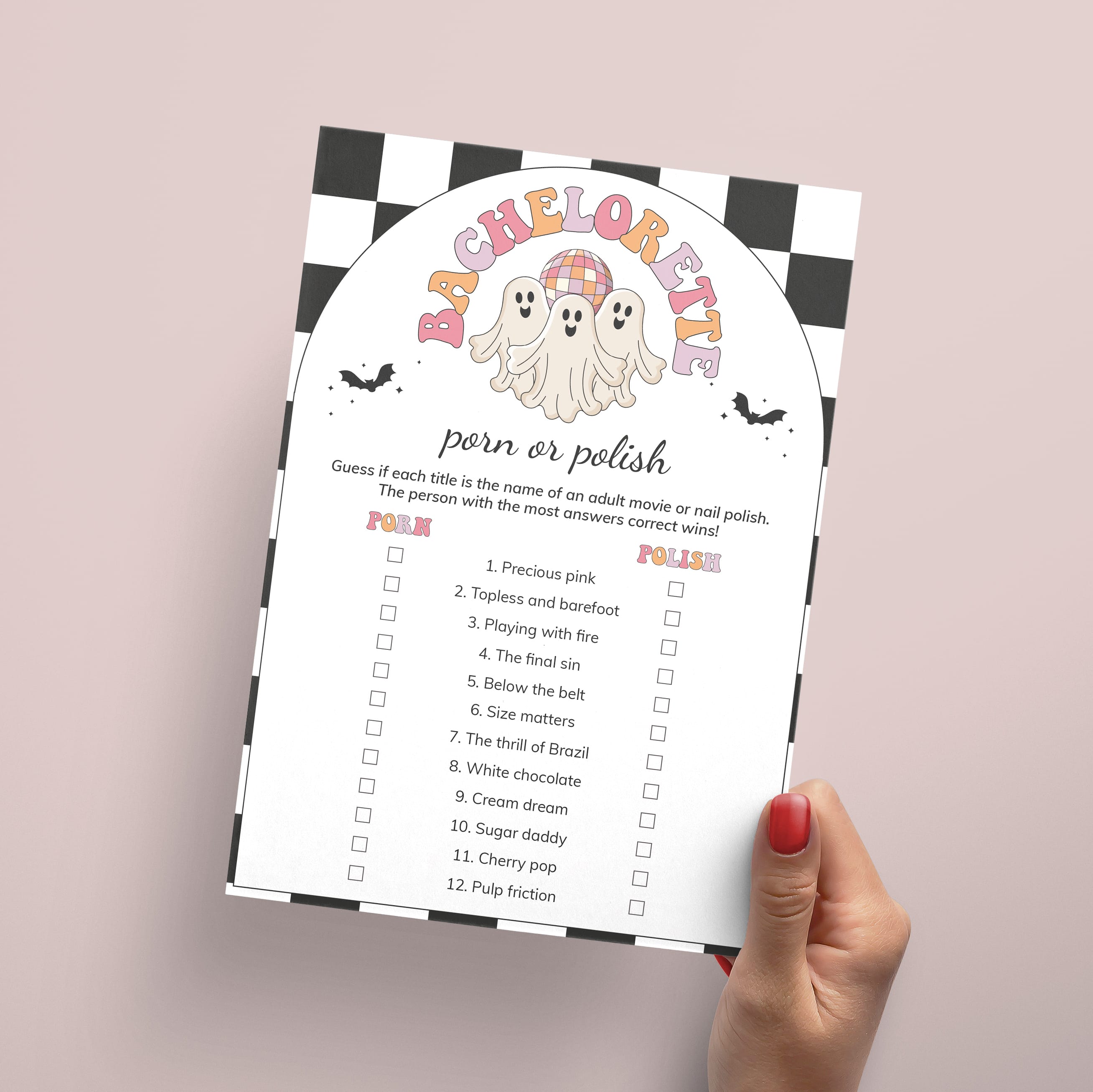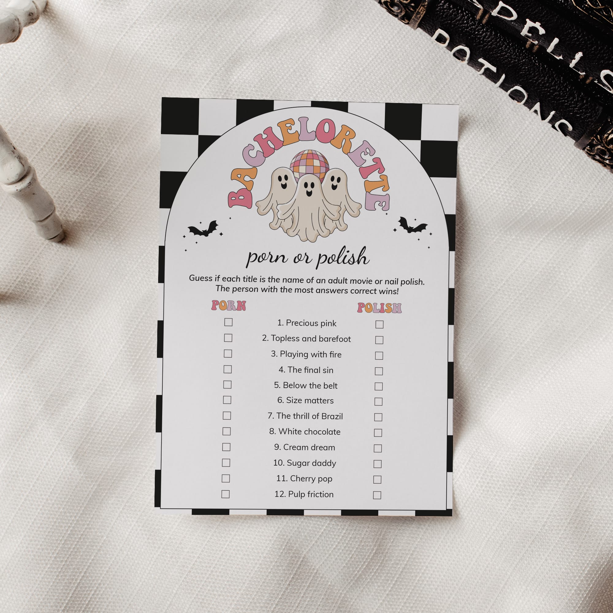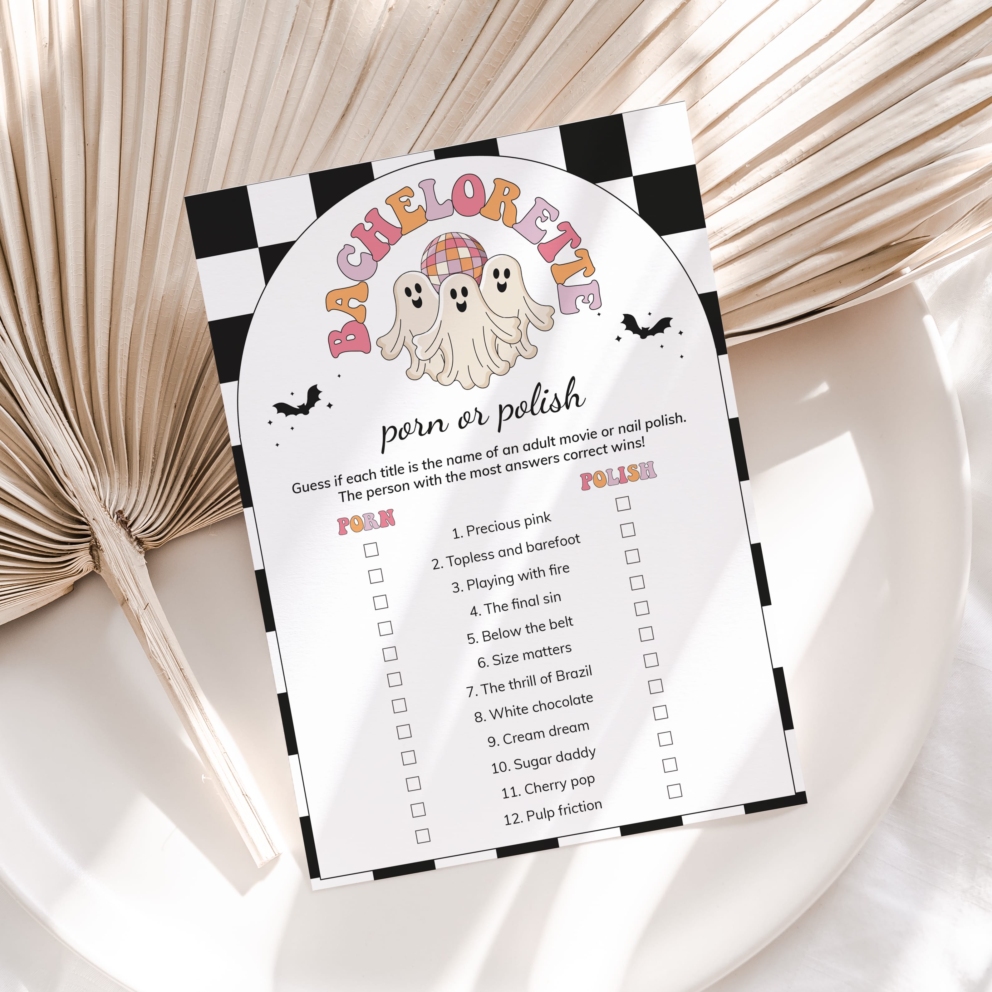 Are you looking for a naughty bachelorette game to play with your girlfriends? Play Porn or Polish with this Let's Go Ghouls bachelorette game with cute ghosts. It is a hilarious addition to your Ghouls Bachelorette Party, Spooku Hen Night or Halloween Bridal Shower. You'll have your girls laughing in no time.
