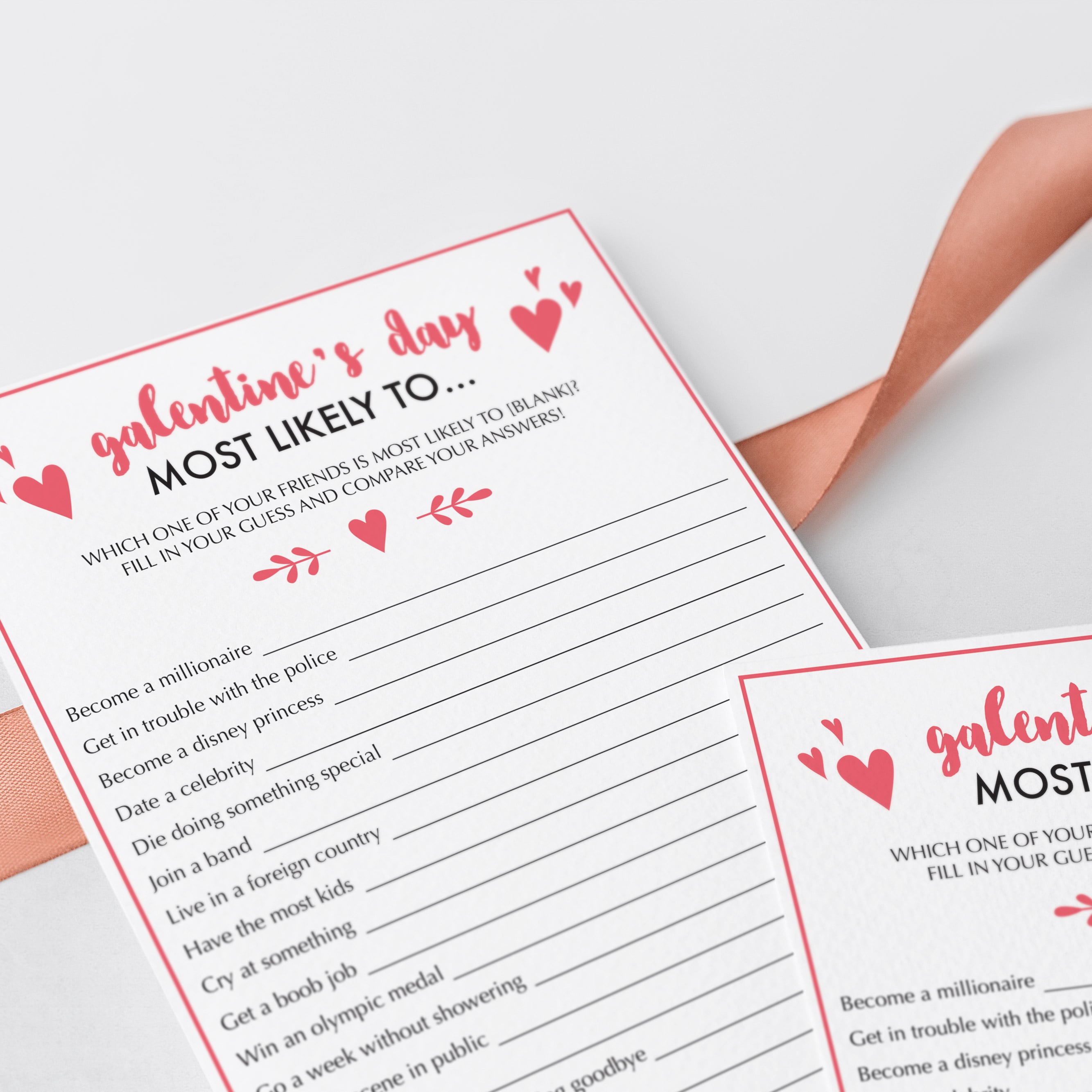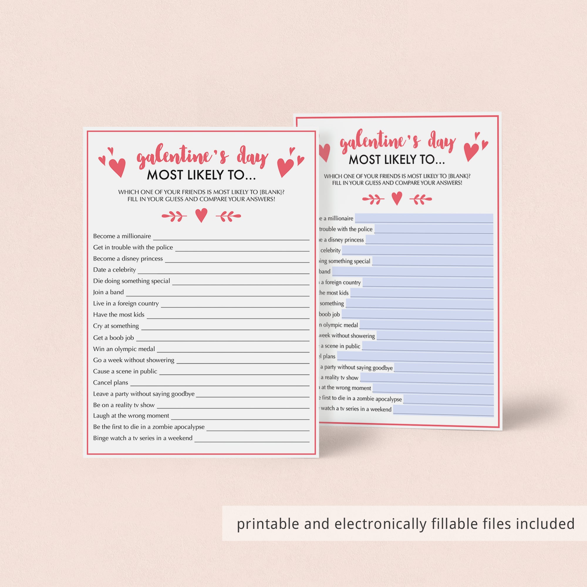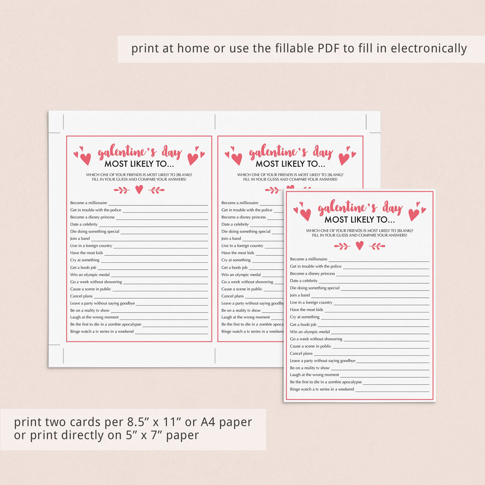 For an in-person party or gathering with your girlfriends, download and print the Most Likely To game as many times as you need. We recommend printing on a nice heavy card stock for highest quality feel. Print right from your computer in a matter of minutes or have the cards printed at your favorite print shop.