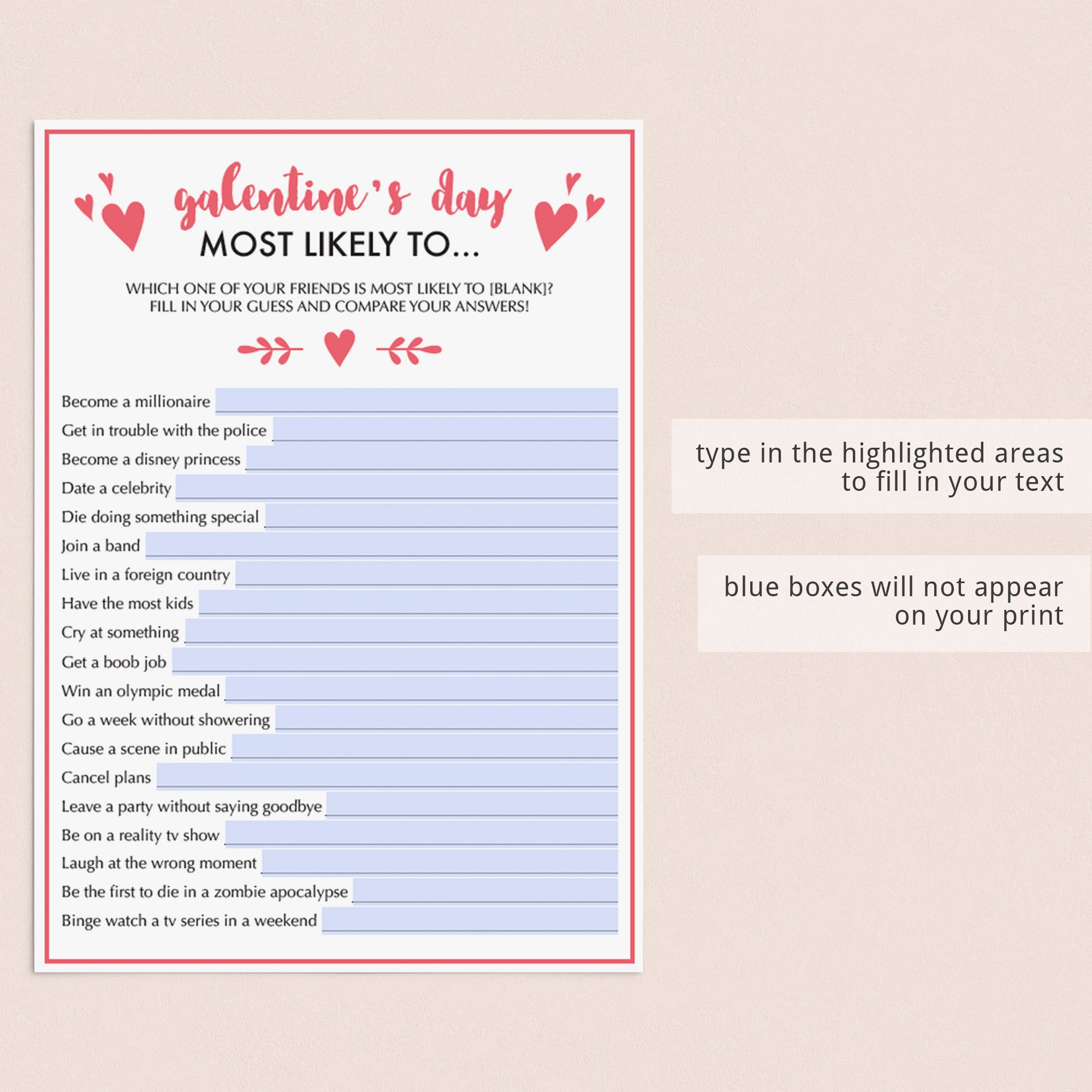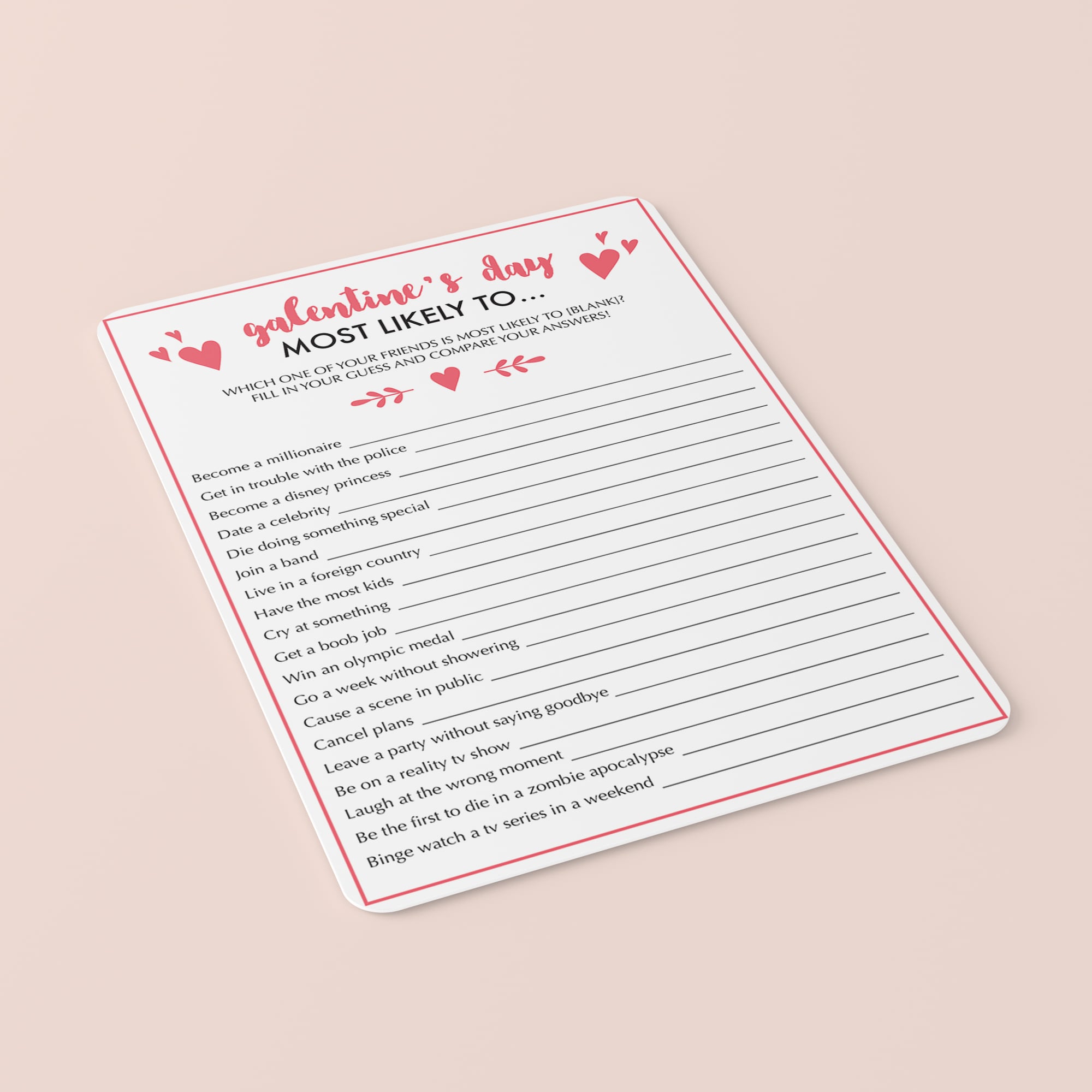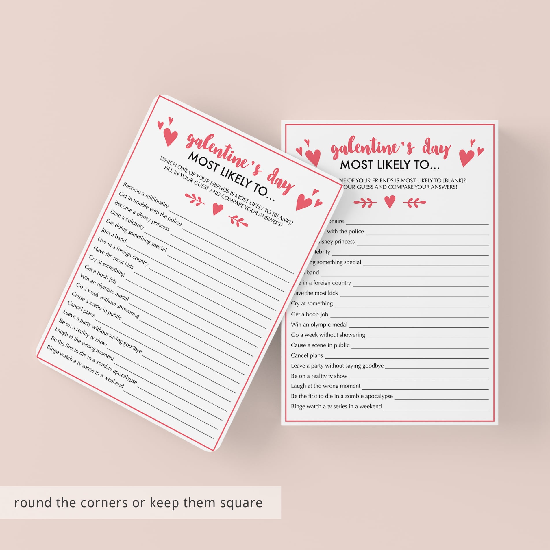For an in-person party or gathering with your girlfriends, download and print the Most Likely To game as many times as you need. We recommend printing on a nice heavy card stock for highest quality feel. Print right from your computer in a matter of minutes or have the cards printed at your favorite print shop.