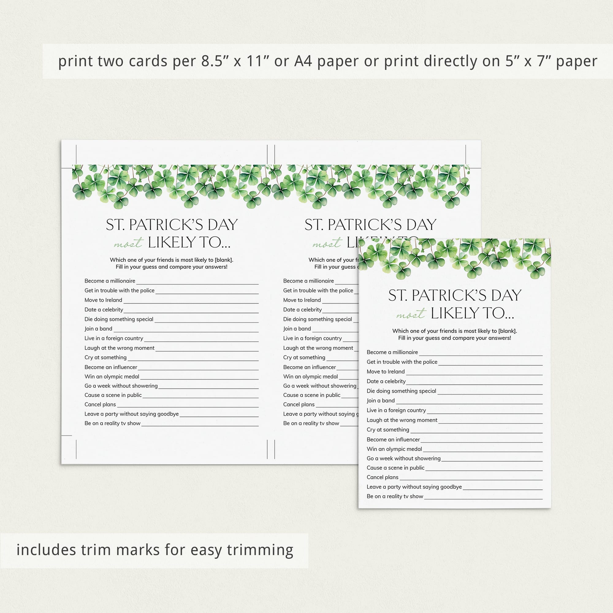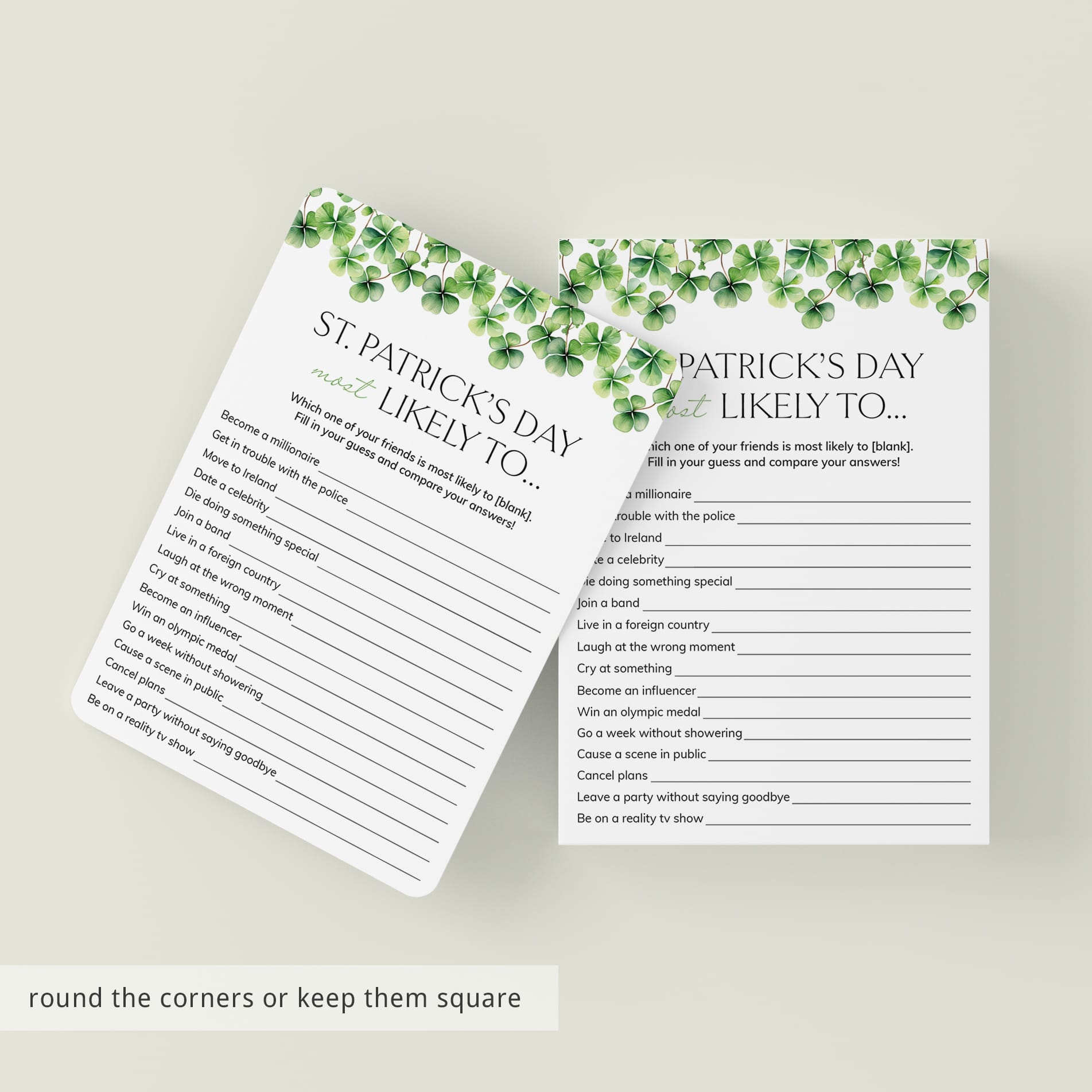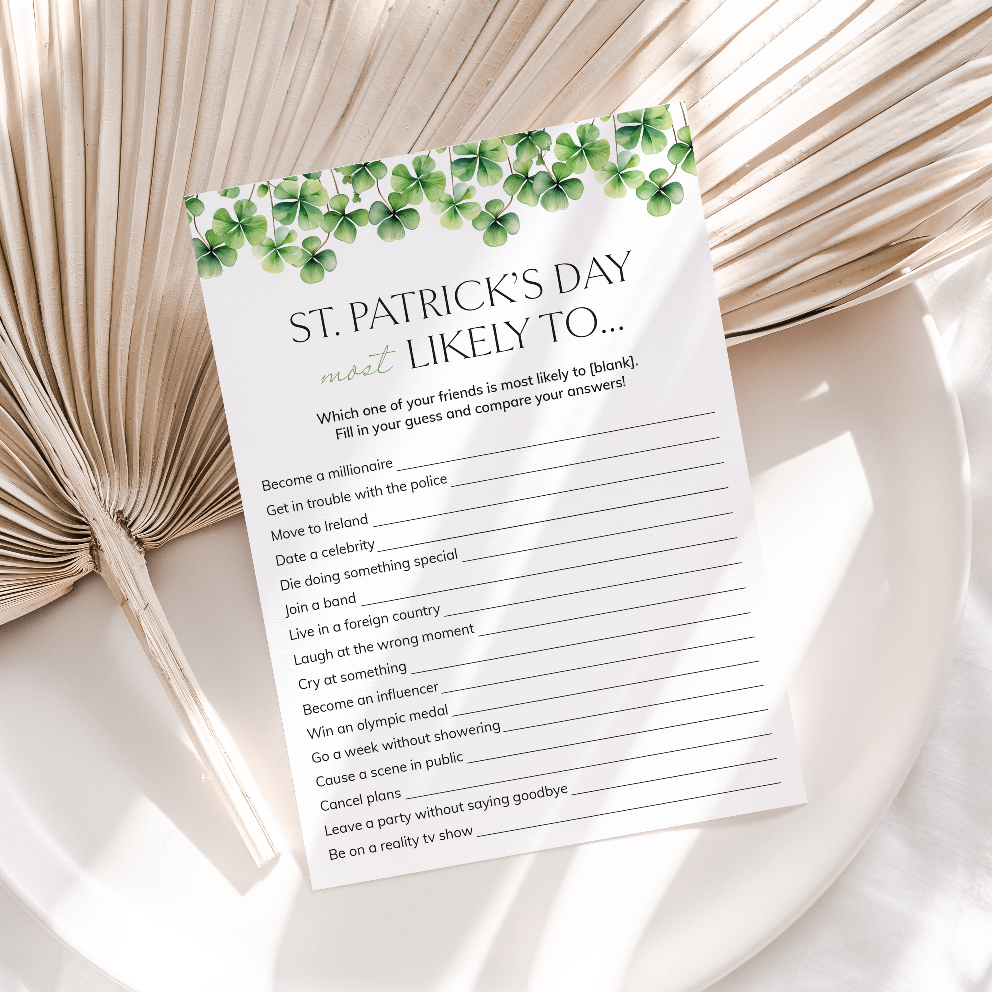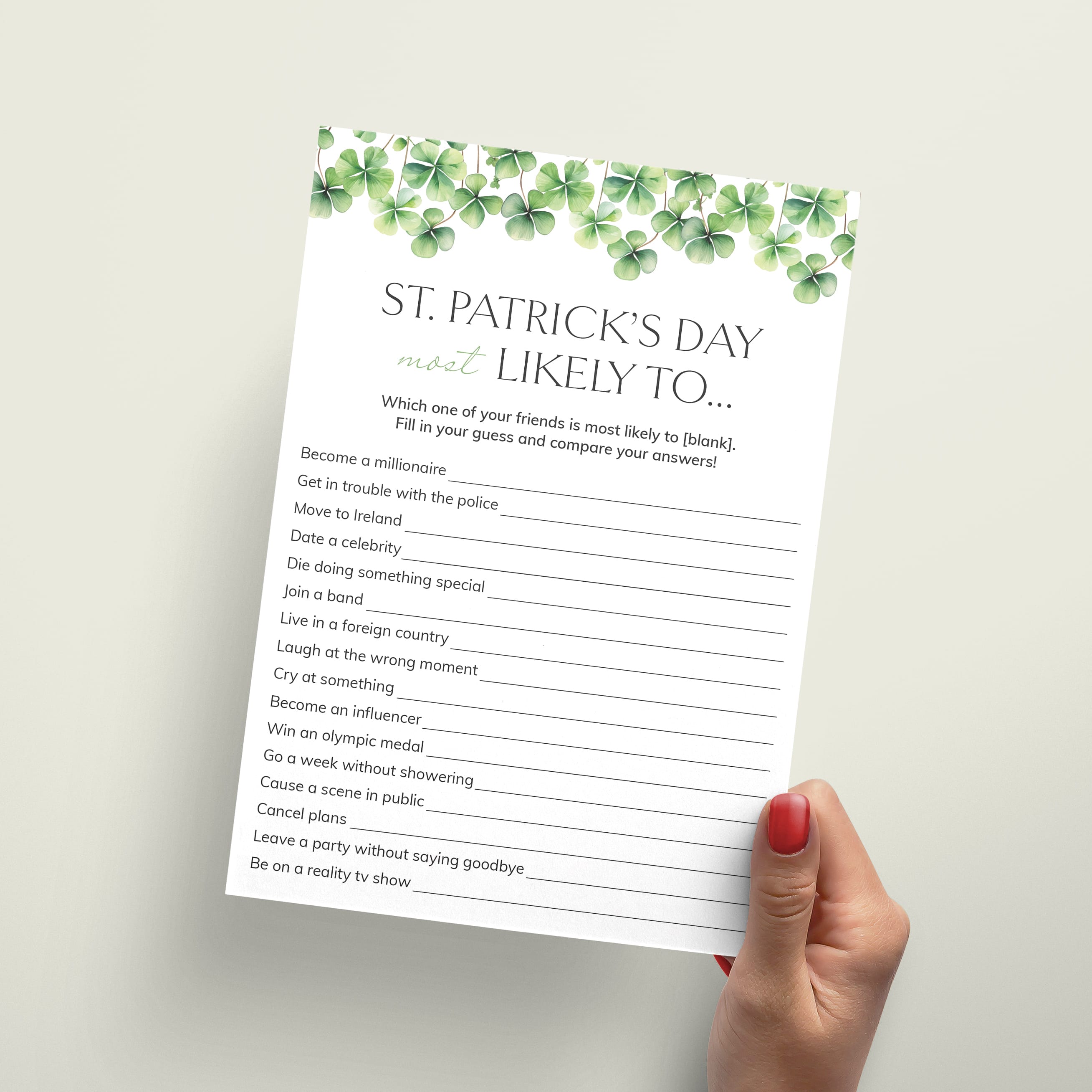 Are you looking for a fun St Patrick's Party game to play with your friends? Play Most Likely To. This funny game with watercolor clovers has 16 Most Likely To questions for Saint Patrick's Day that will get everyone talking and laughing. You will get to know your friends at some new level.