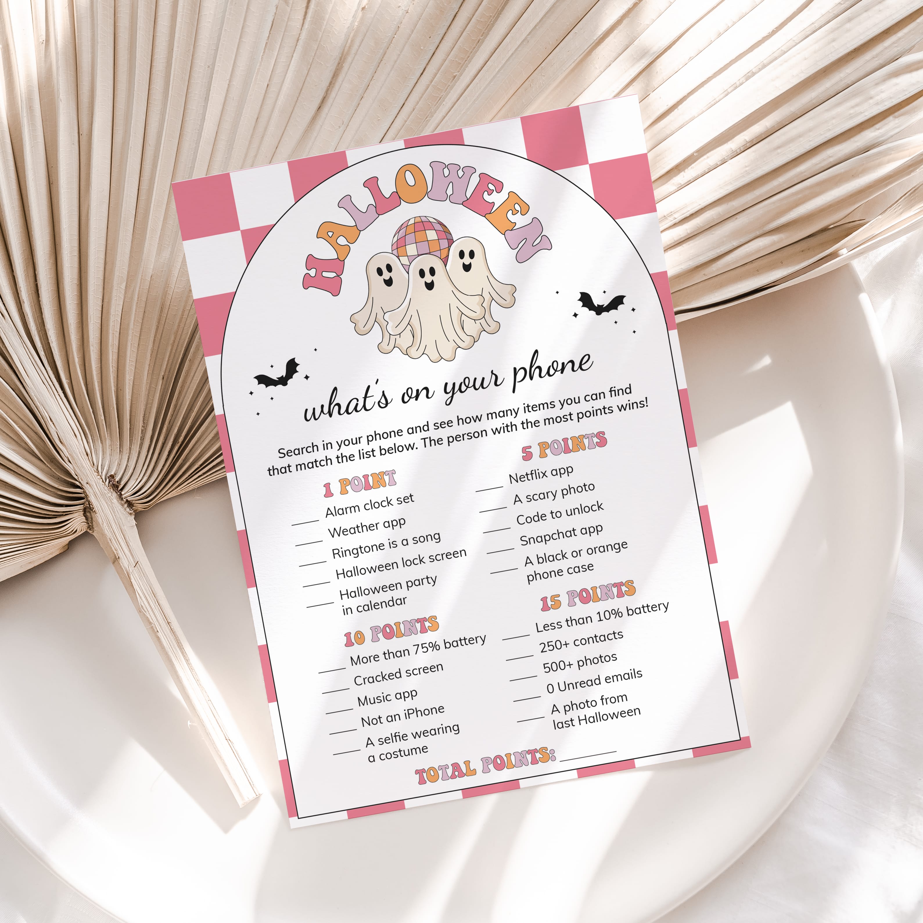 Most people come to a party with just a phone, credit card and keys. What else do you need, right? Does this sound familiar to you? Then this retro pink Halloween party game What's On Your Phone is the perfect icebreaker for your Ghouls Halloween party. It’s super easy to prepare for and simple to play.