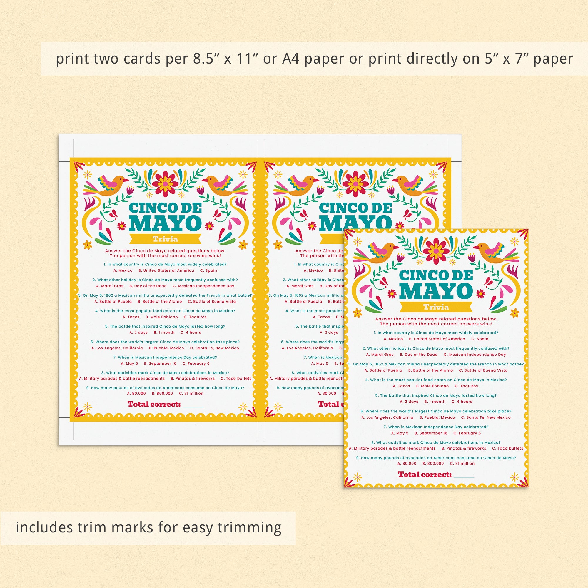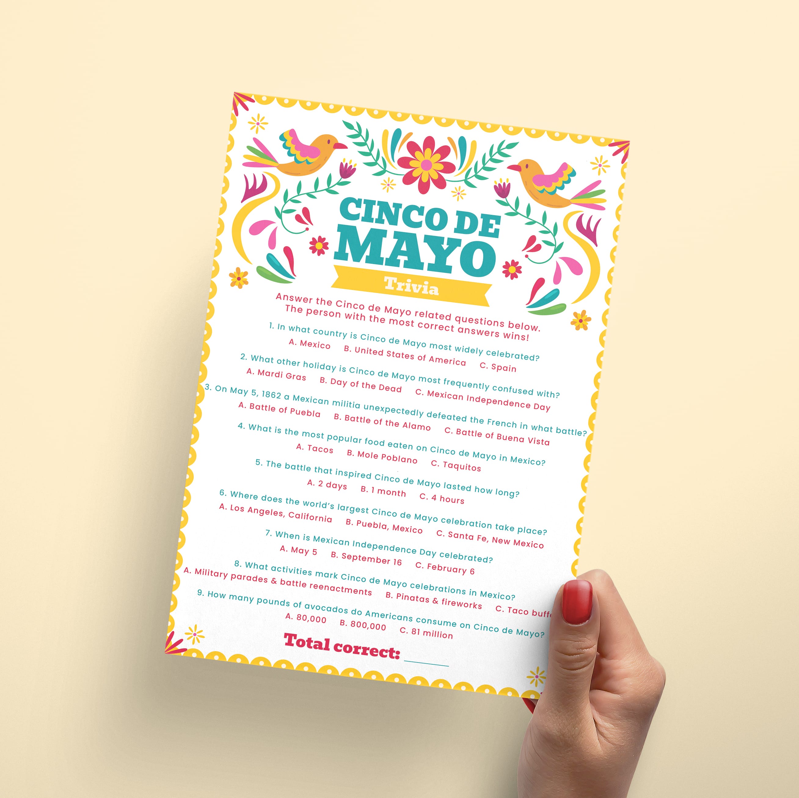 Are you hosting a Cinco de Mayo party? Test your guests knowledge of this Mexican holiday with this colorful Cinco de Mayo Trivia game. It is a great game to play with friends and family, at school or at the office. You will learn some fun Cinco de Mayo facts. Just in case you are having trouble figuring out the answers, an answer key is included.