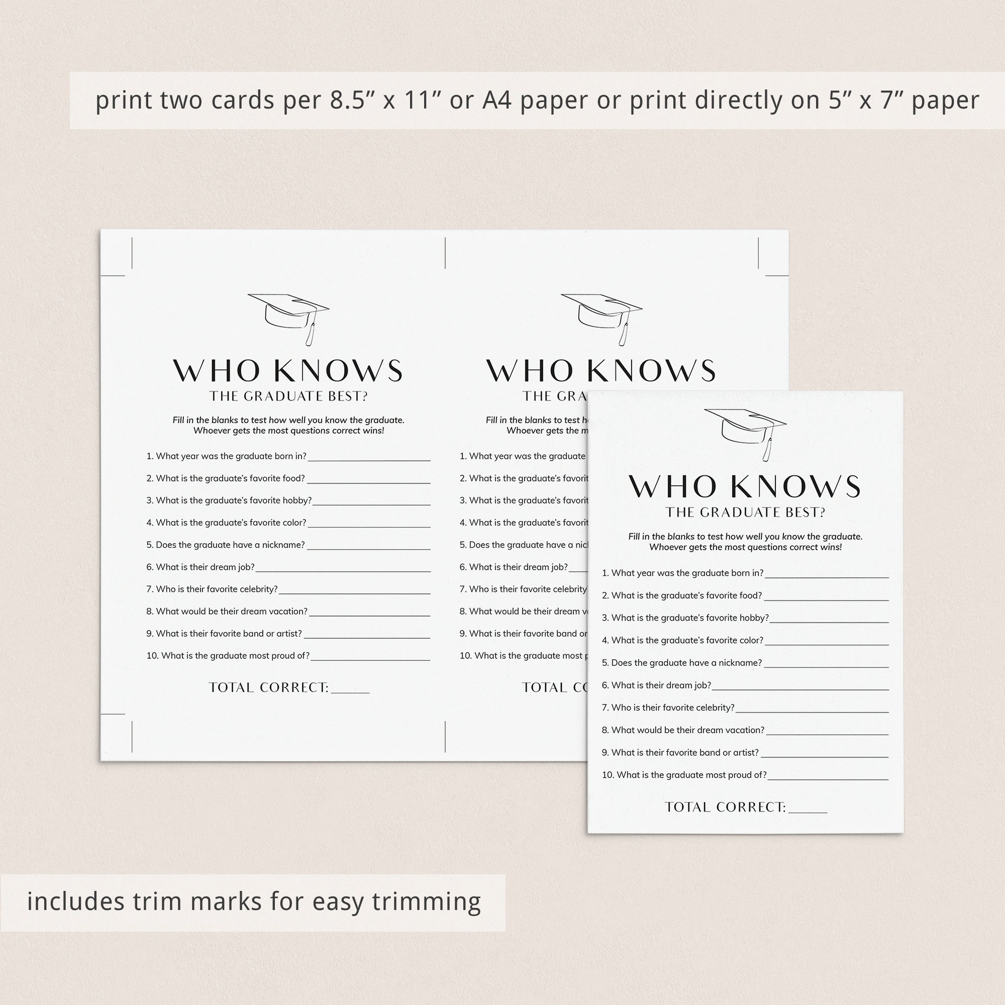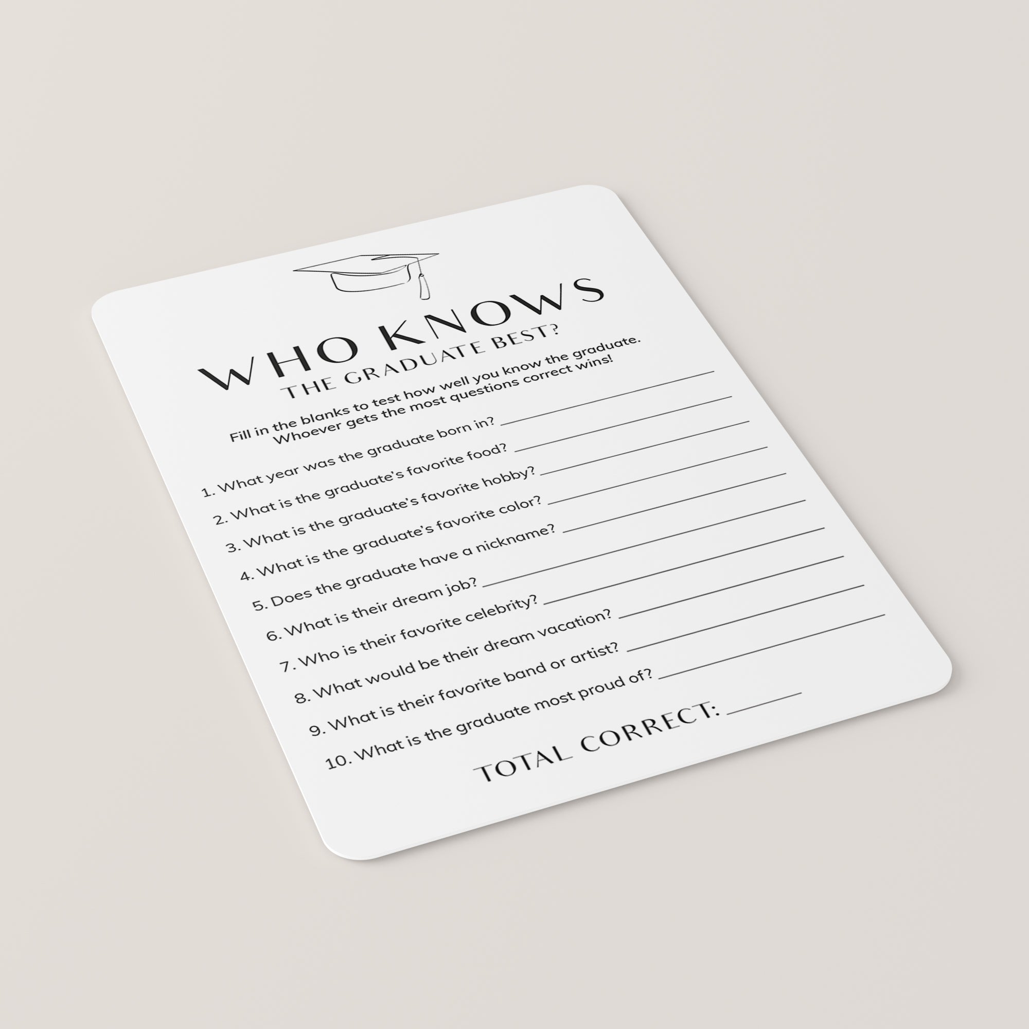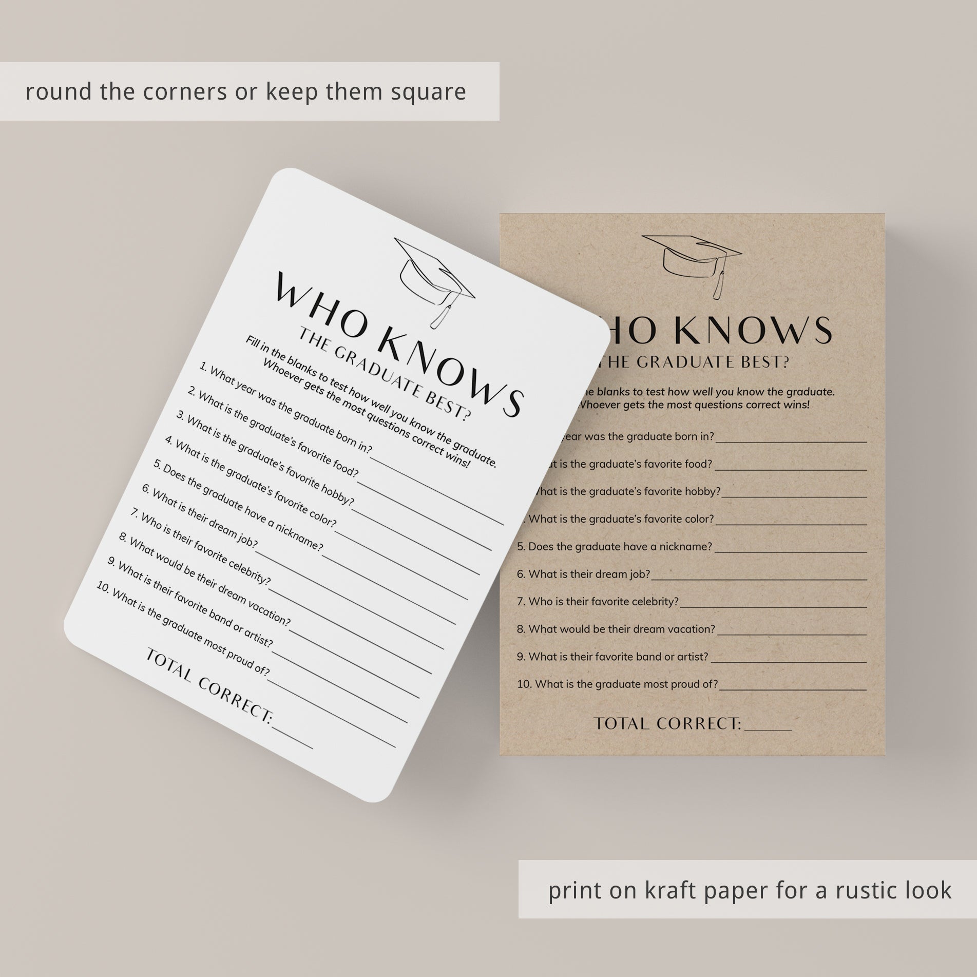 Test your graduation party guests how well they know the graduate and play 'Who Knows The Graduate Best’ with this modern minimalist graduation quiz. This graduation game is a great way to bring disparate people together and to put them all in a party mood. It's the perfect addition to your graduation party.