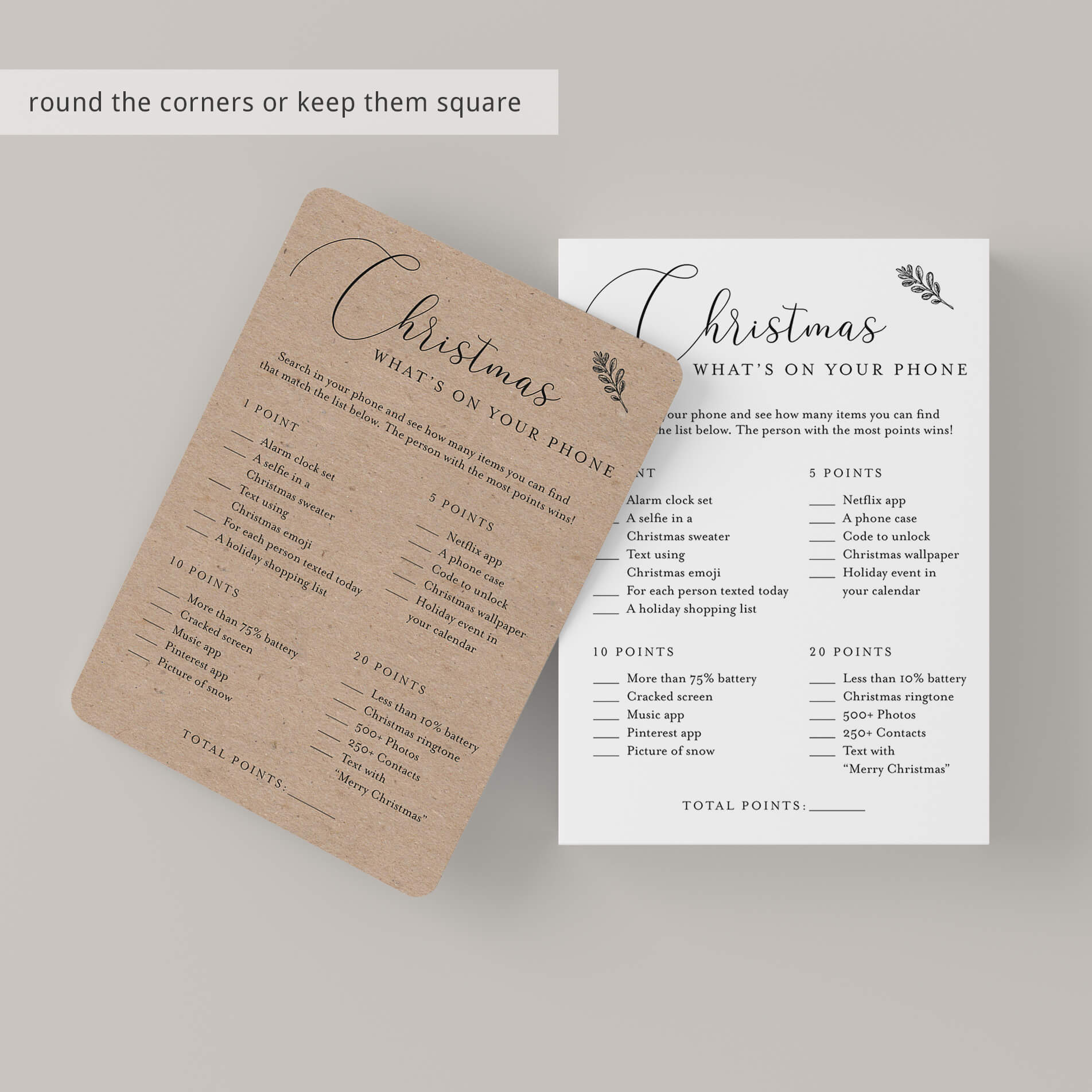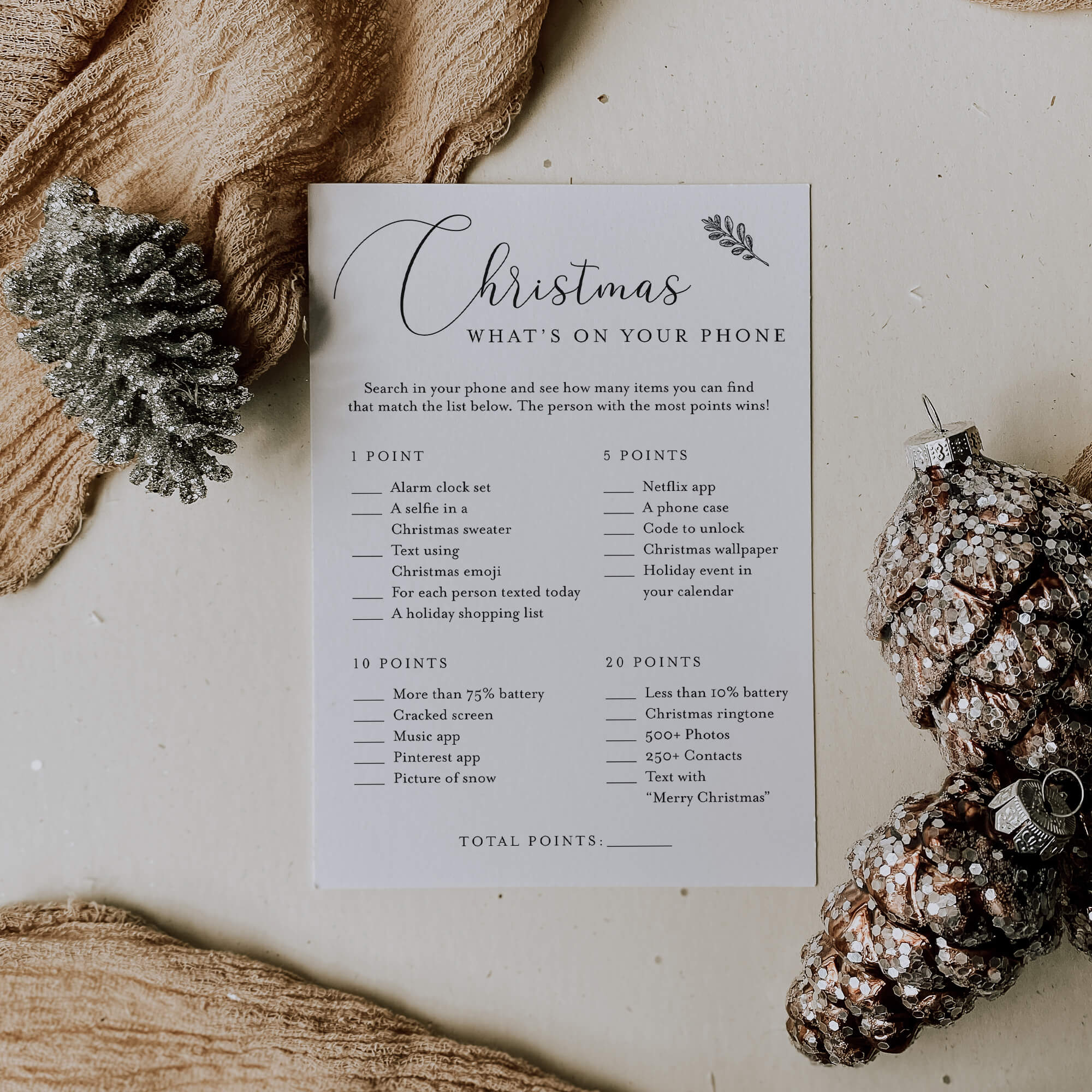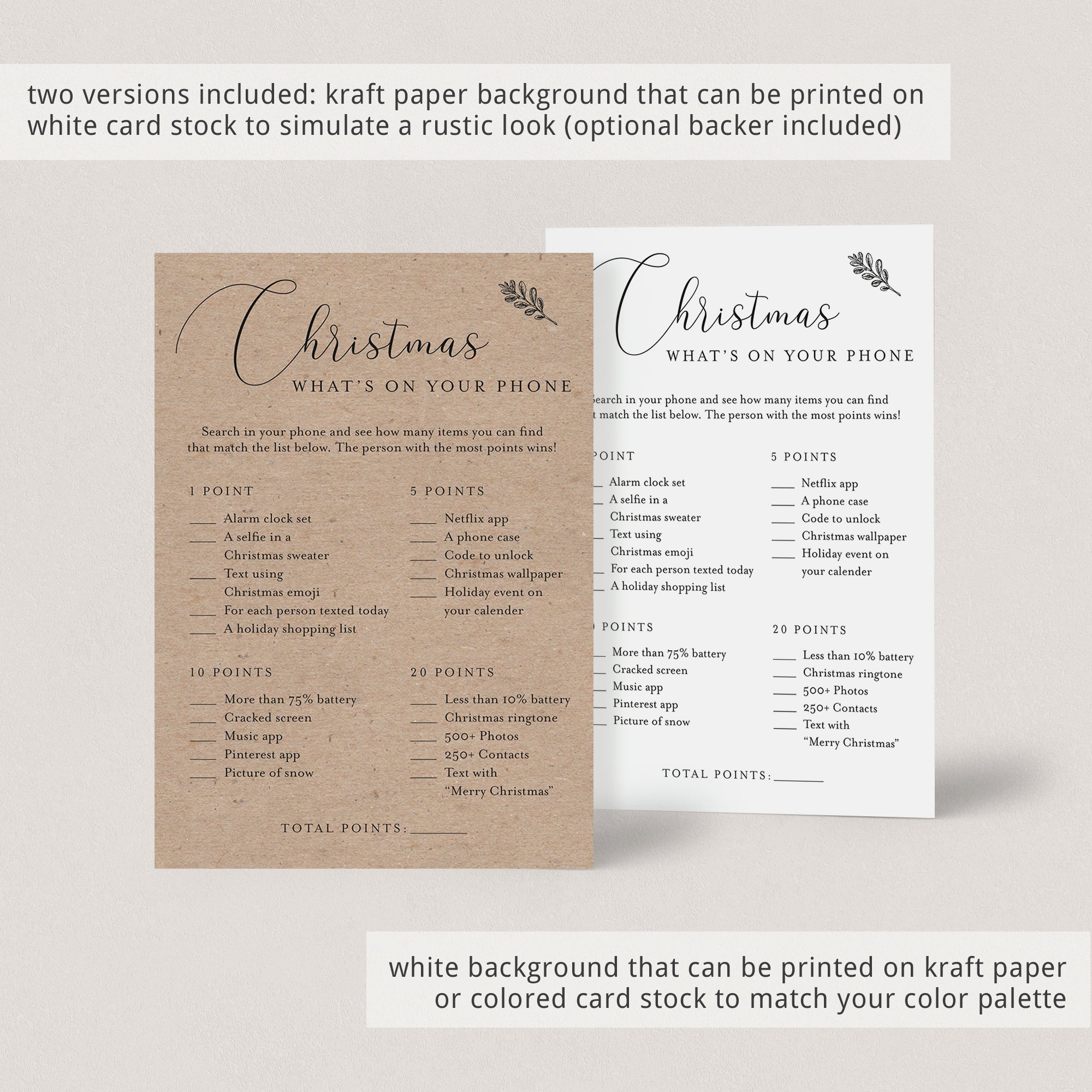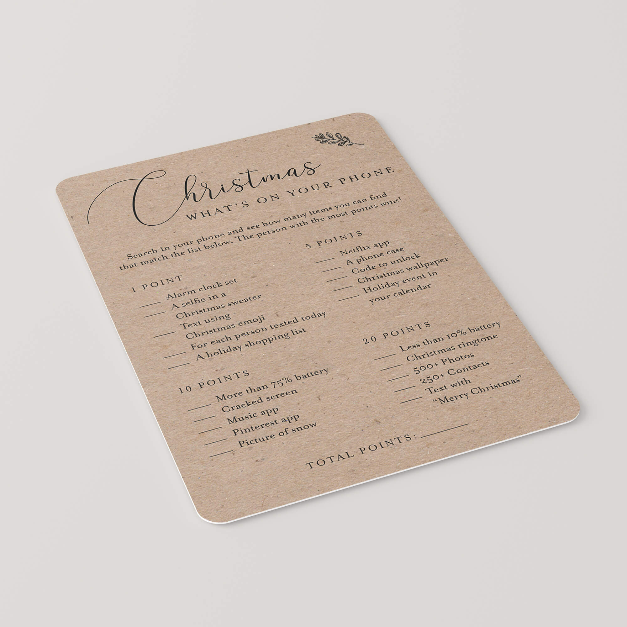 Are you looking for a fun ice breaker game for your Christmas party? Play What's On Your Phone with these rustic Christmas game cards with kraft paper background. The game is super easy to prepare for and simple to play.