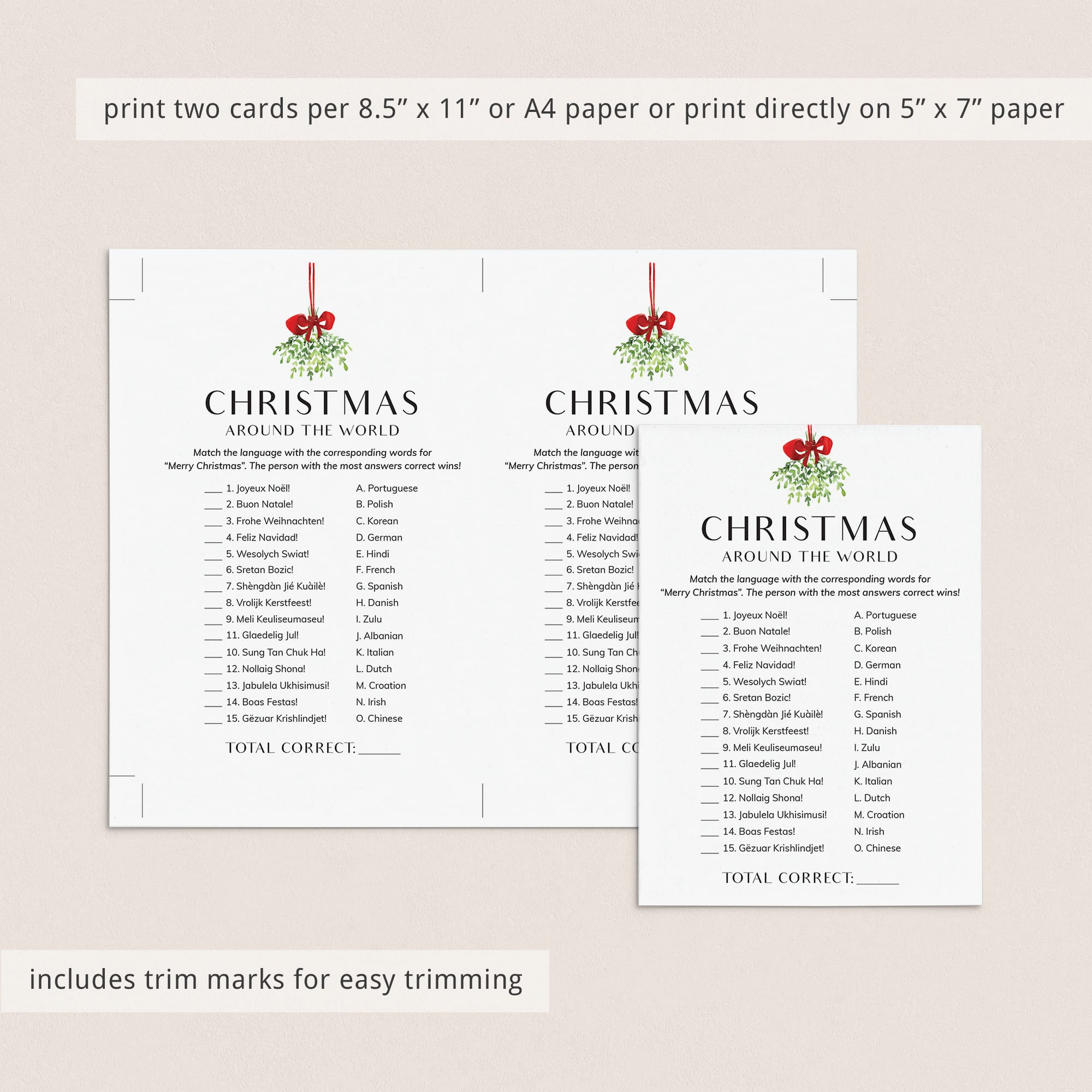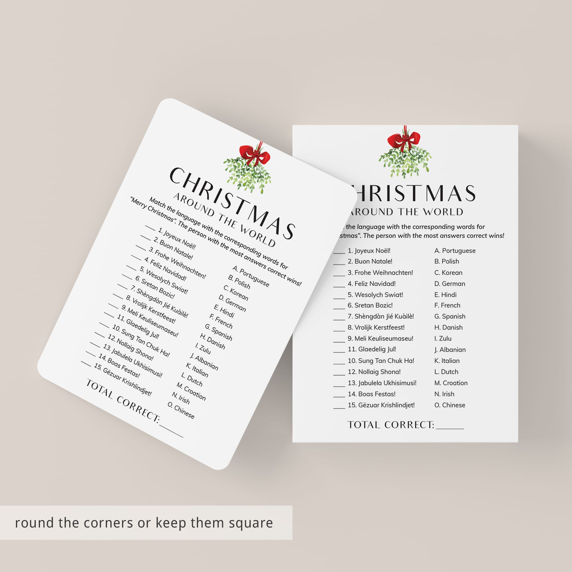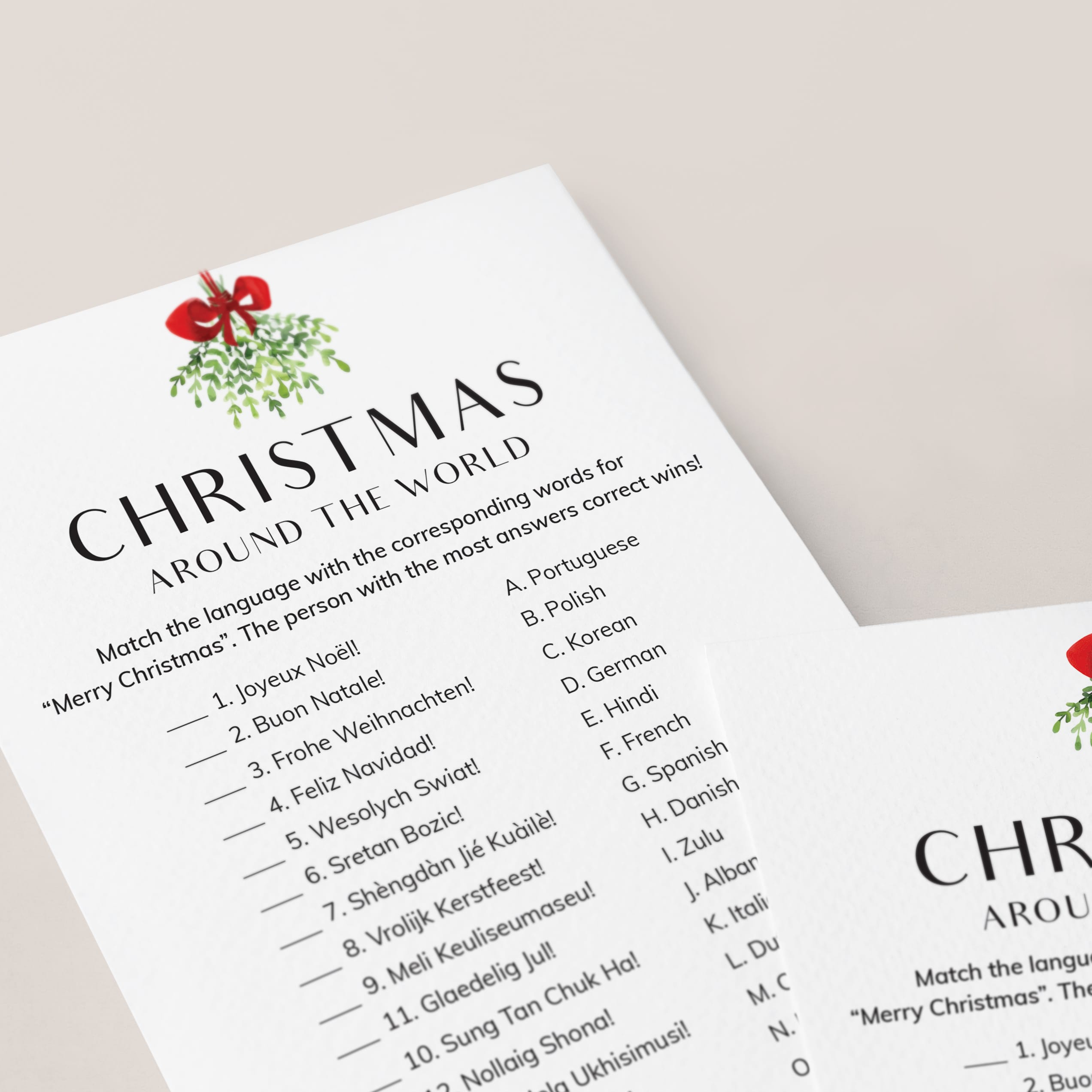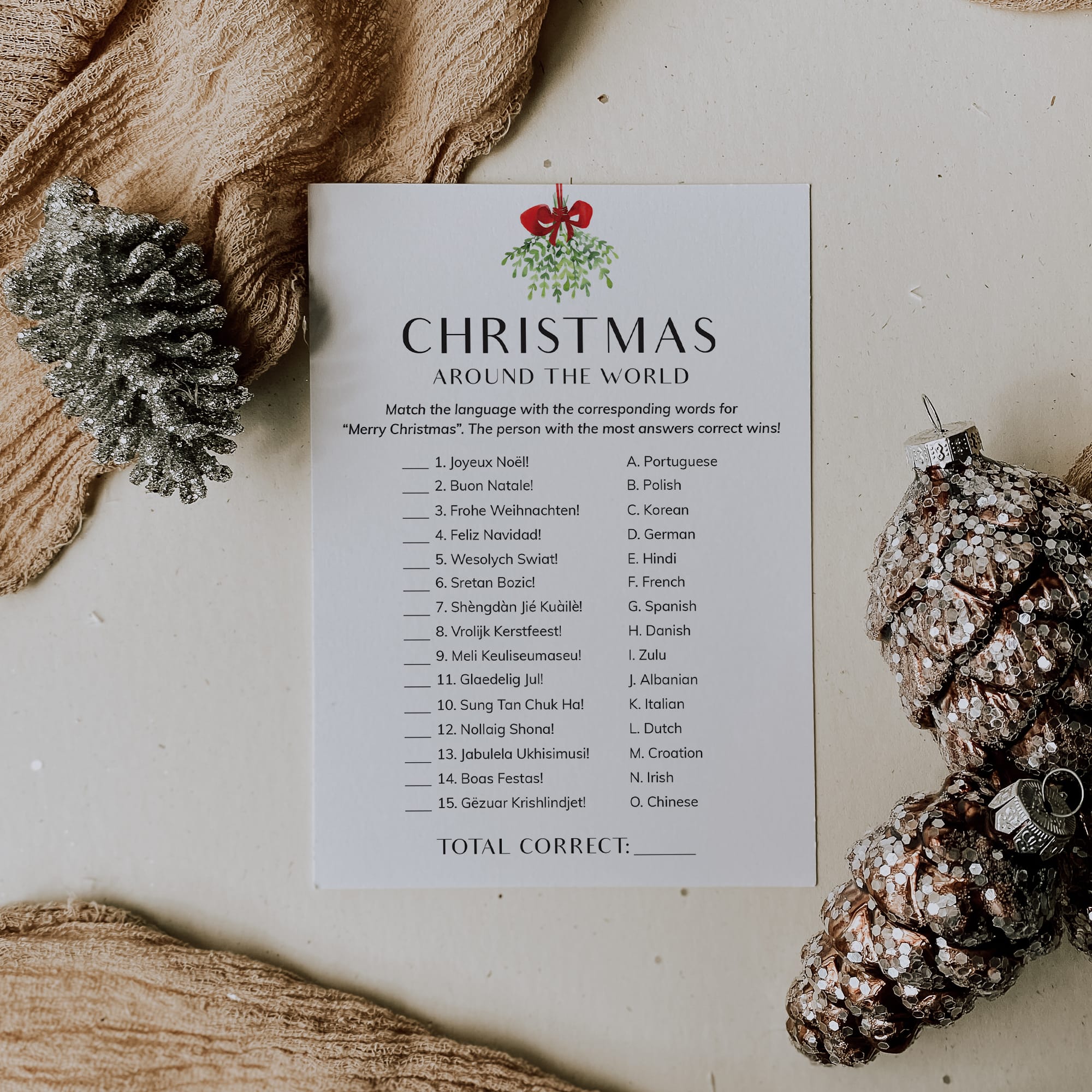 The game is very easy to play. Print and distribute these simple, yet elegant, Christmas Around The World work sheets and a pen to each of your guests. The have to match each version of the words “Merry Christmas” with its language of origin. The person with the most correct answers wins.