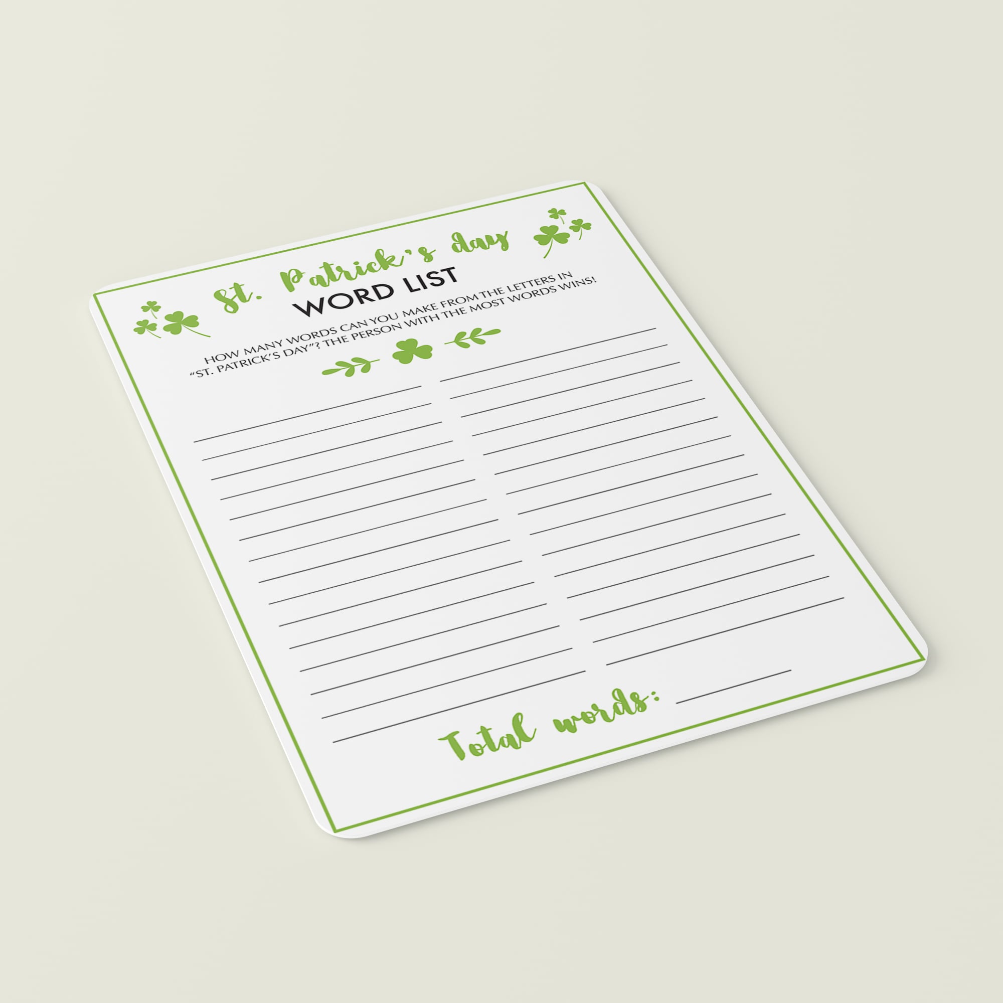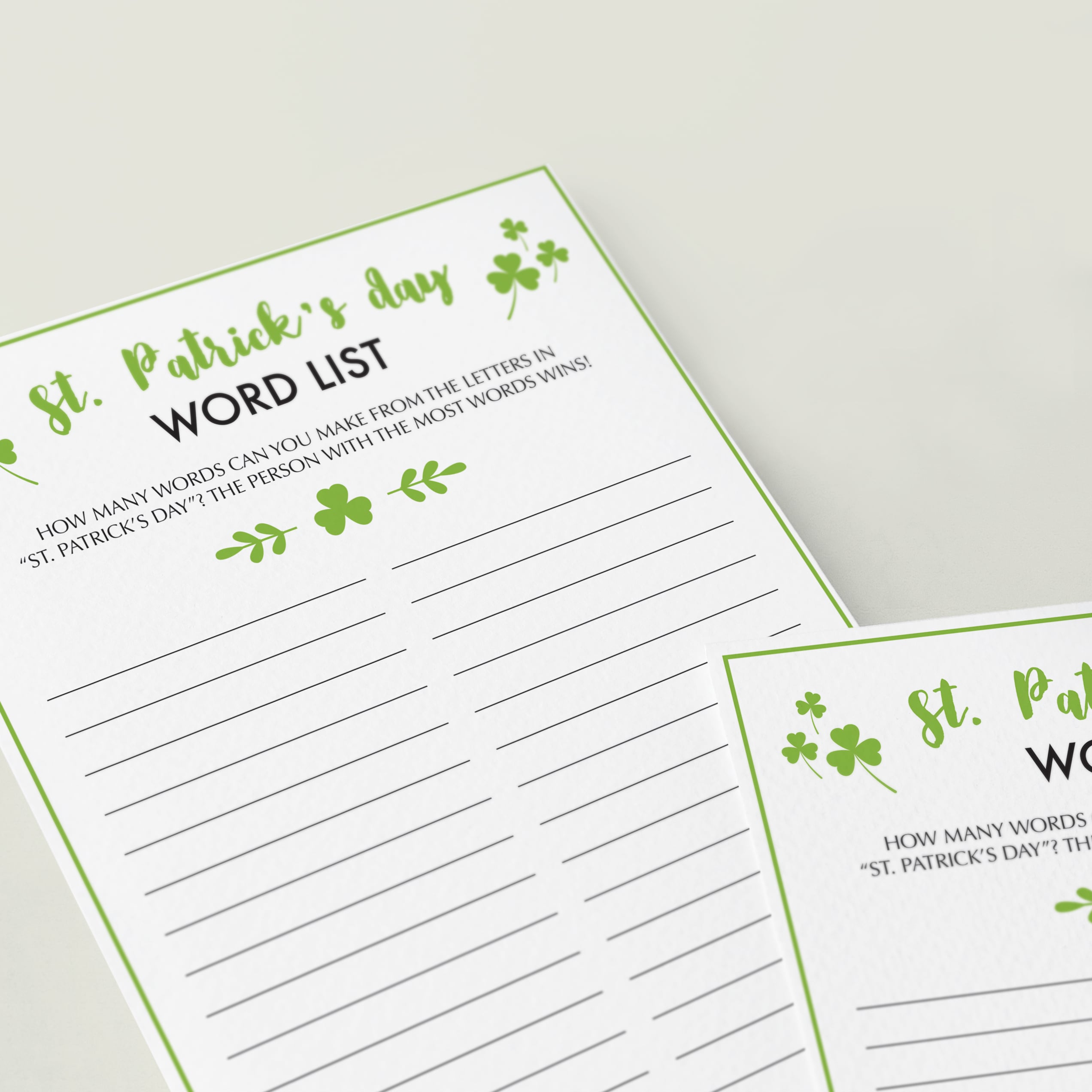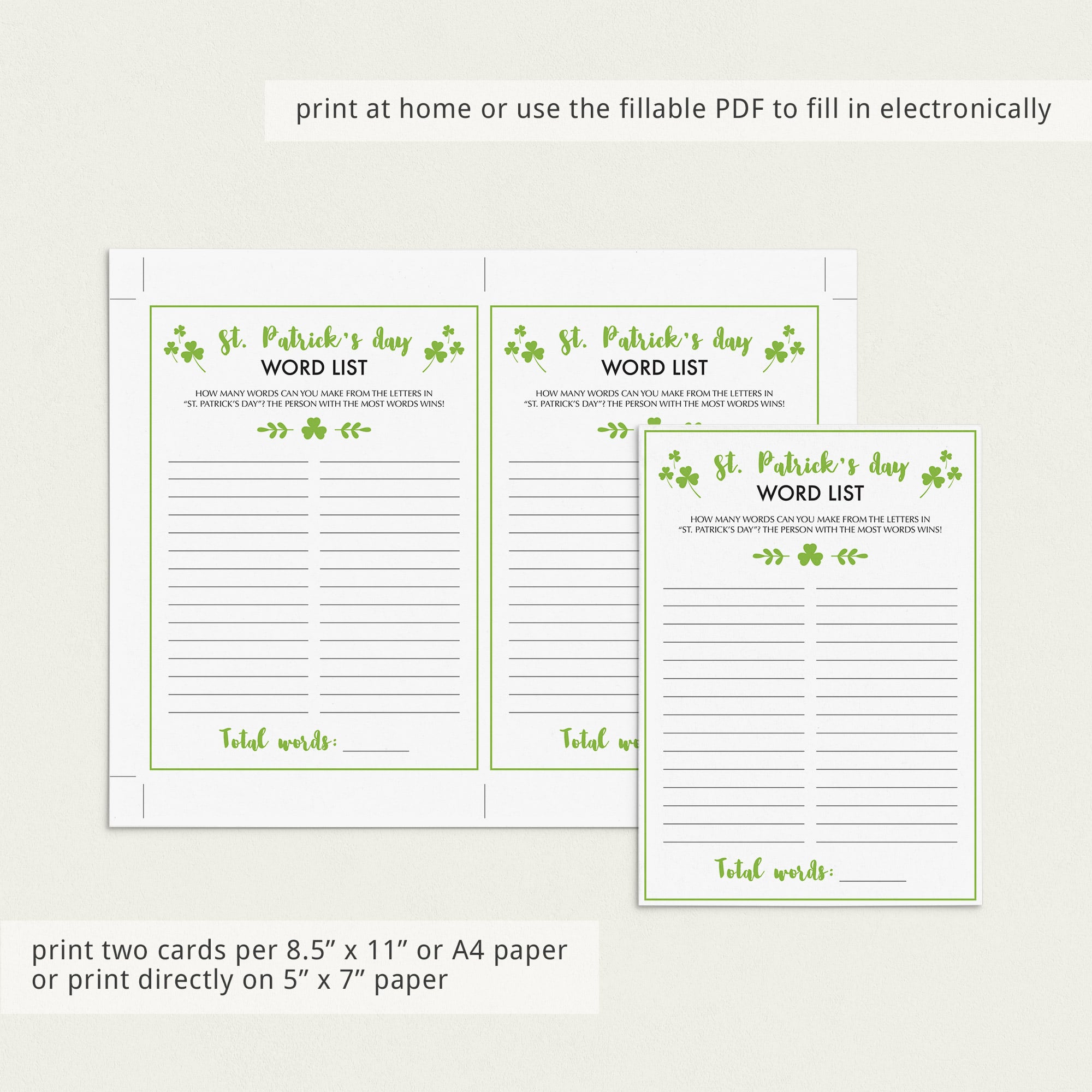 For an in-person St Patrick's Day party, download and print the Word List game cards as many times as you need. We recommend printing on a nice heavy card stock for highest quality feel. Print right from your computer in a matter of minutes or have the cards printed at your favorite print shop.