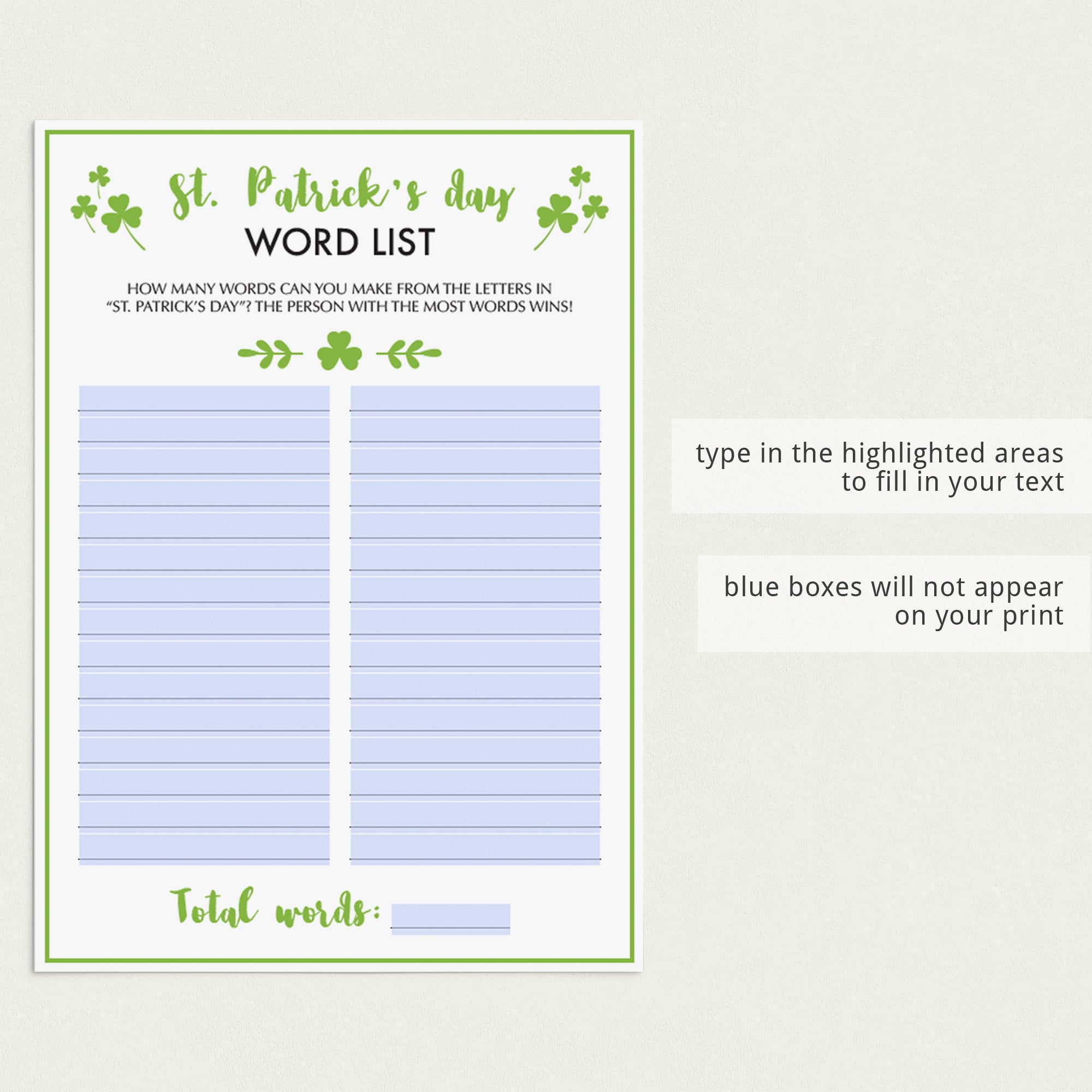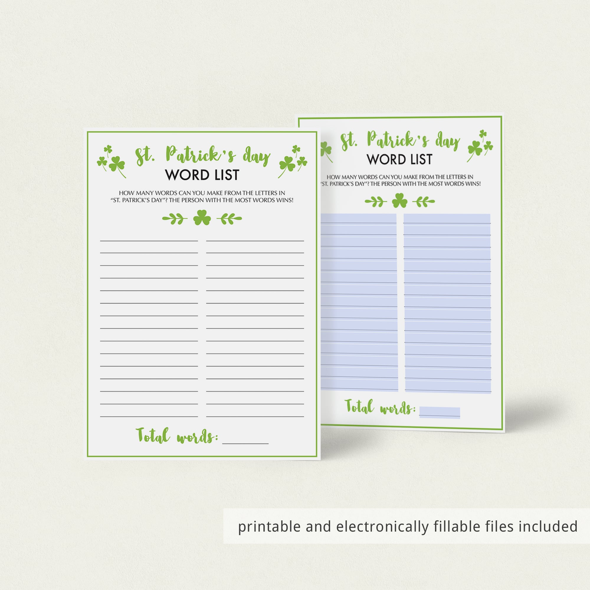 Word games are always a big hit at parties. A word game is fun and challenging for all ages. Add some fun to your St. Patrick's Day celebration and play this simple game: Word List. It's the perfect game to play with large groups. Electronically fillable and printable files are included.