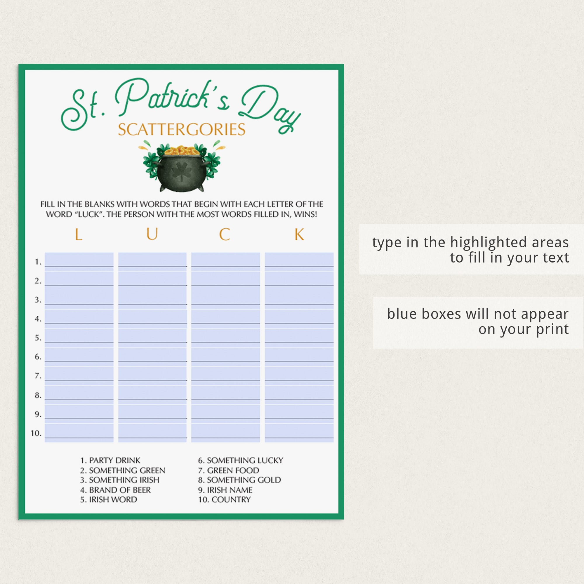 How many words can you fill in with the letters "L", "U", "C" and "K"? Play Scattergories at your (virtual) St. Patrick's Day party to ensure lots of fun and laughter. This game is great fun for all ages. You can play St. Patrick's Day Scattergories in your (virtual) classroom, at the office or at home with family and friends. Printable and electronically fillable PDF templates are included.