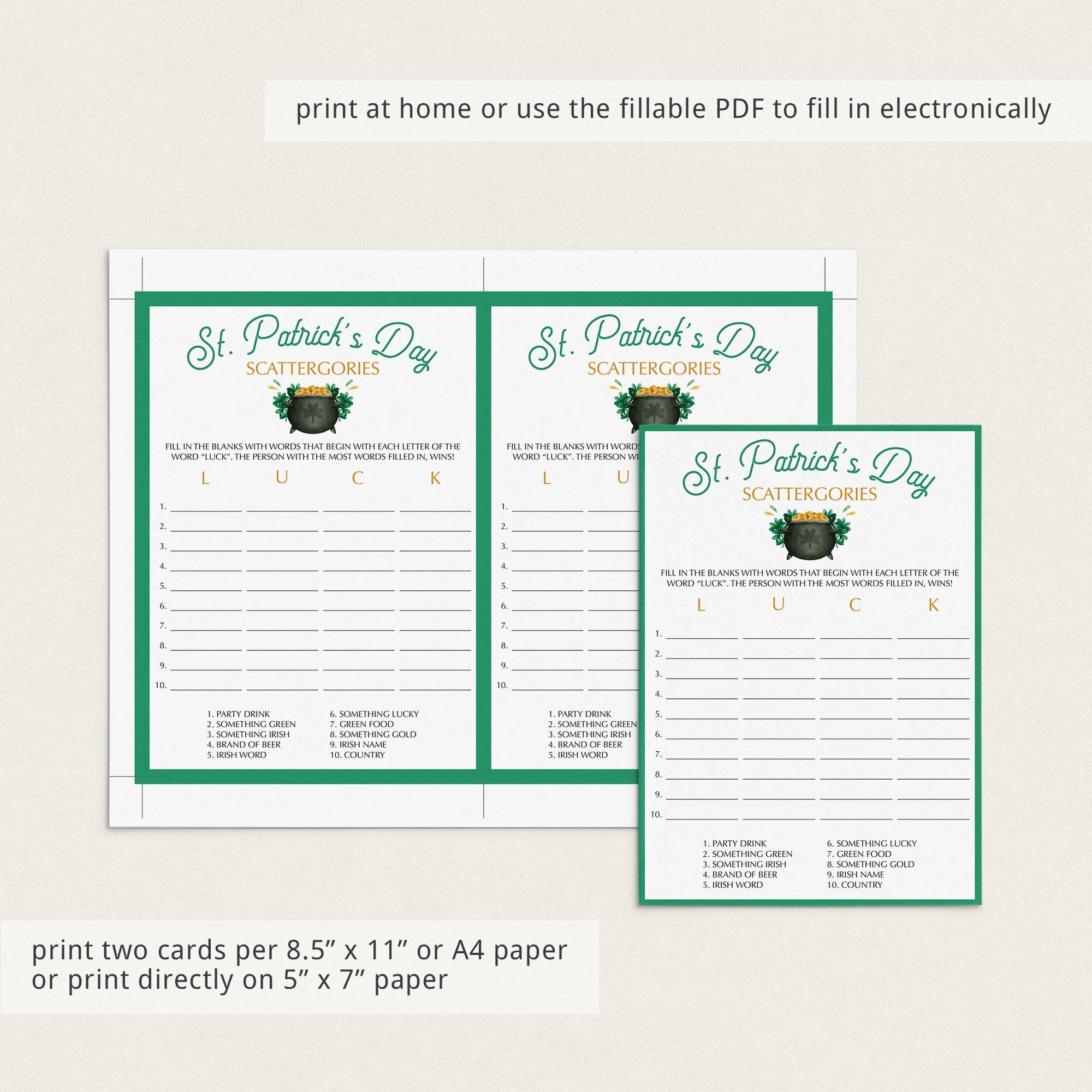 For an in-person St Patrick's Day get-together, download and print the game cards as many times as you need. We recommend printing on a nice heavy card stock for highest quality feel. Print right from your computer in a matter of minutes or have the cards printed at your favorite print shop.