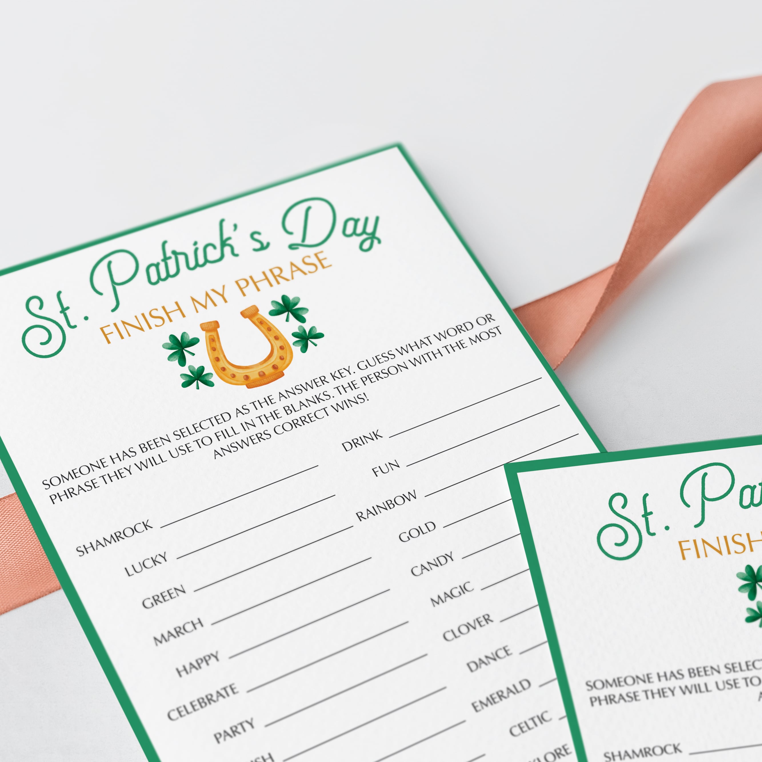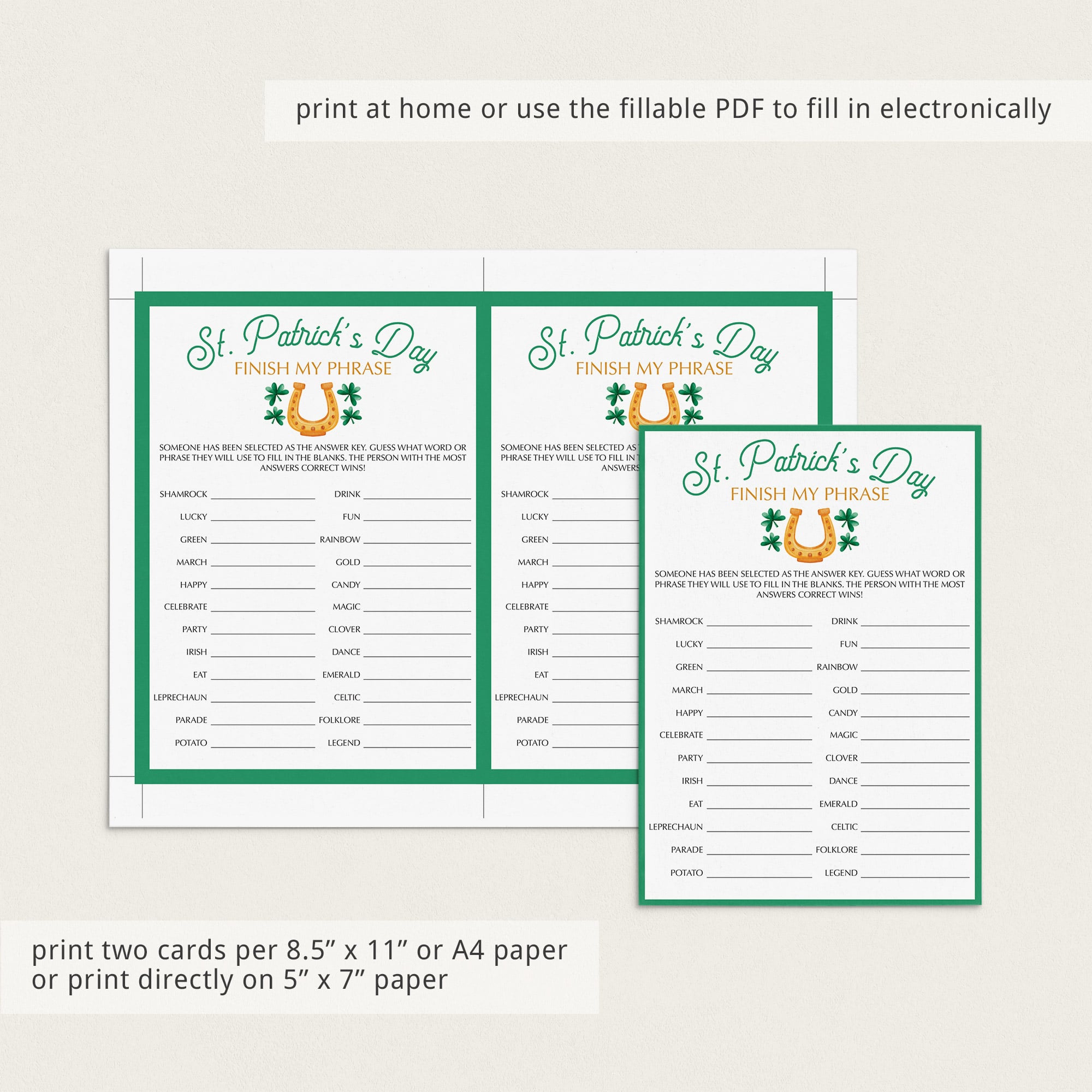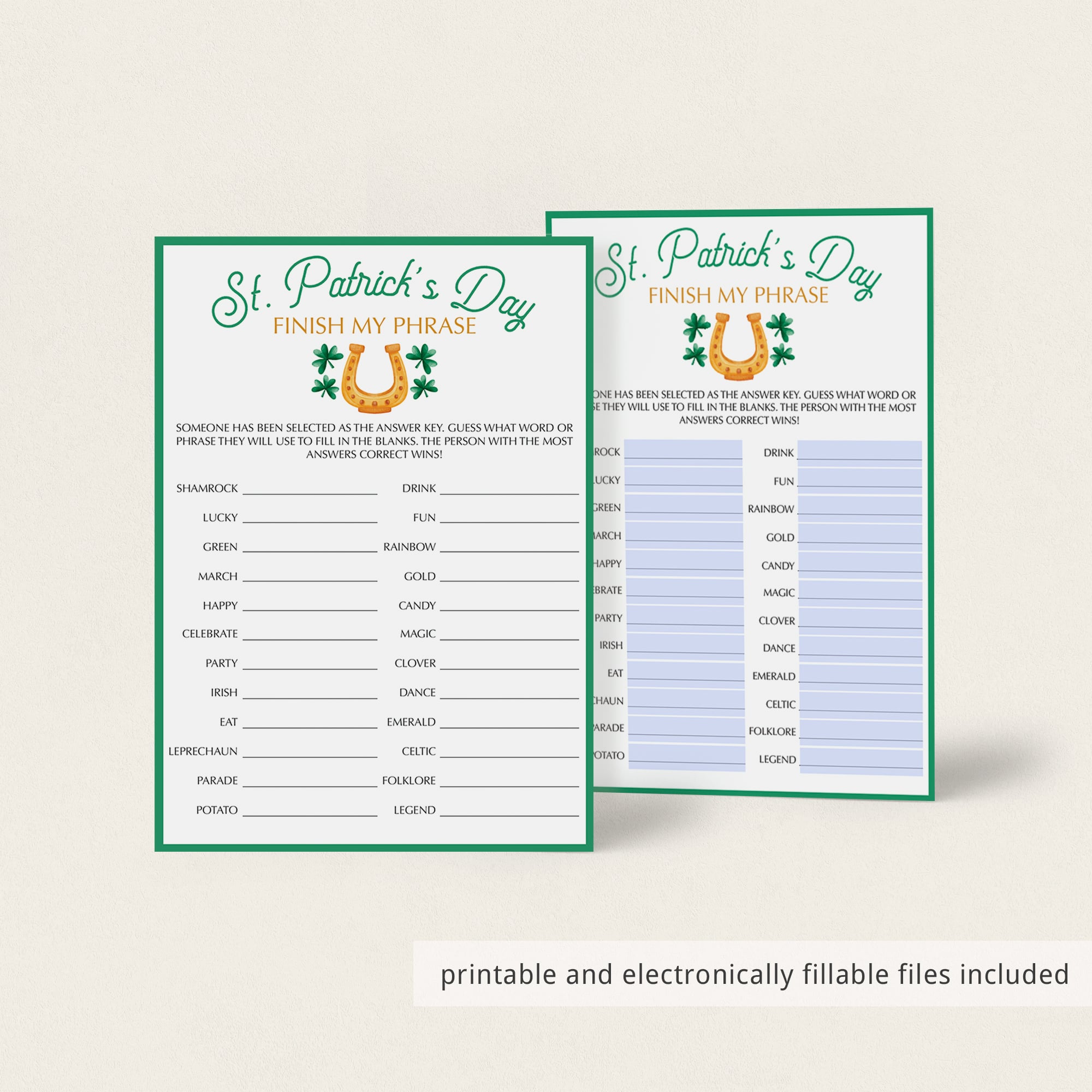 St. Patrick's Day Finish My Phrase is a great game to play with large groups. It is a fun activity for kids and adults and very easy to play. You can play this game in (virtual) classrooms, at the office or with friends and family. Printable and electronically fillable PDF templates are included.