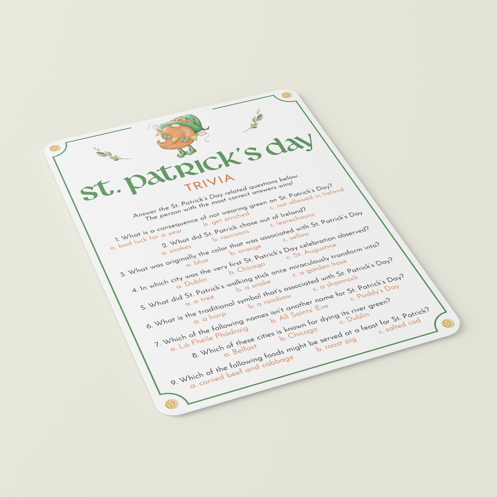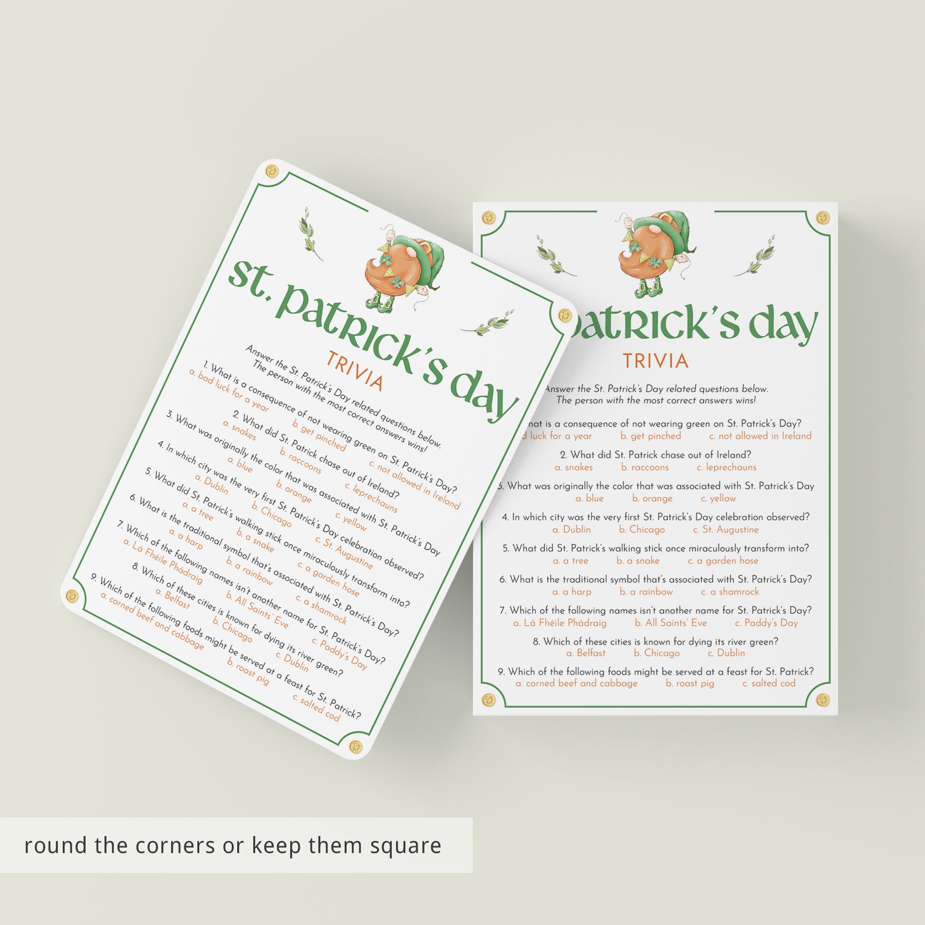 Are you hosting a St. Patrick's party? Test your guests knowledge of this Irish holiday with this fun St. Patrick's Day Trivia game. It is a great game to play at home with friends and family or with co-workers at the office and you will learn some fun St. Patrick's Day facts. Just in case you are having trouble figuring out the answers, an answer key is included.