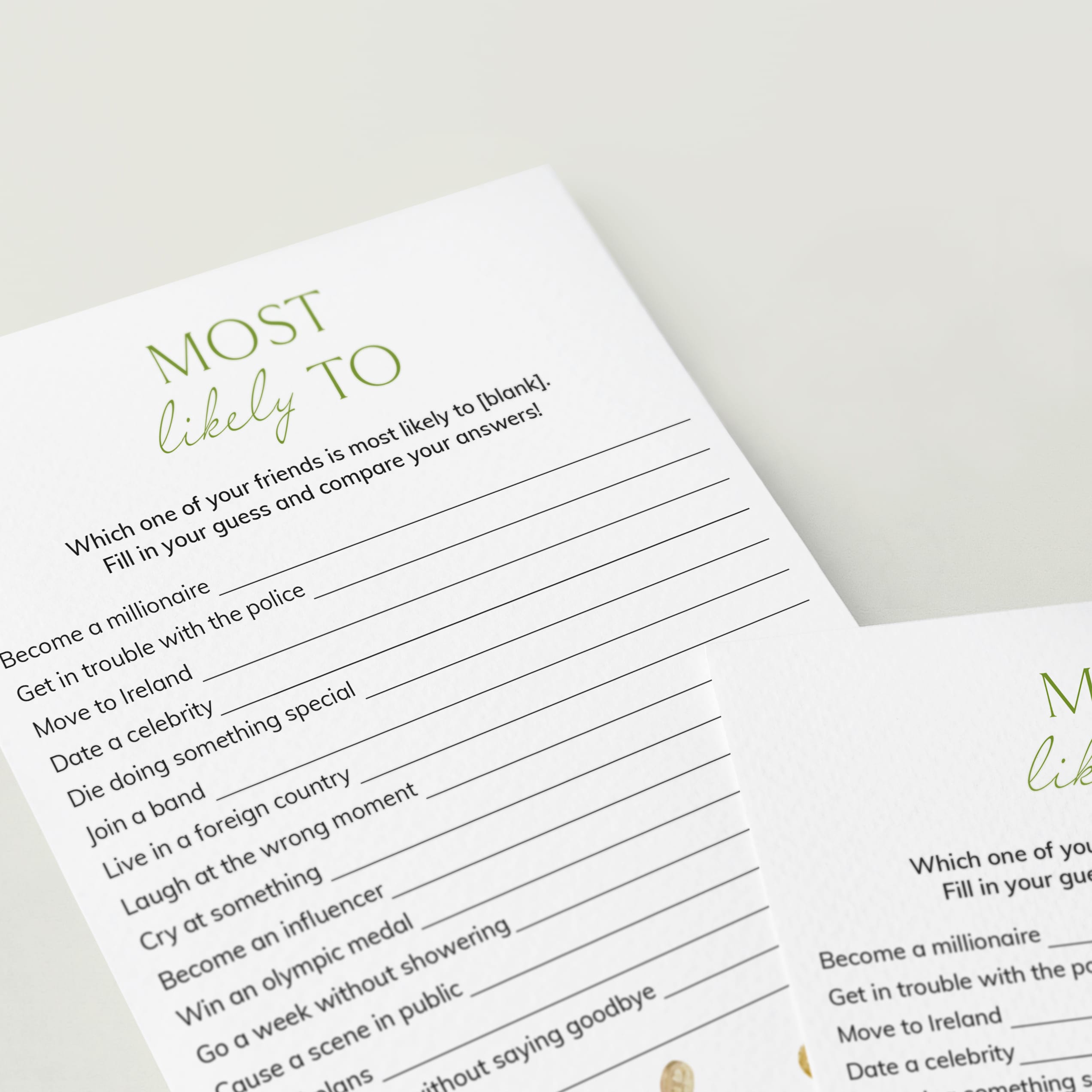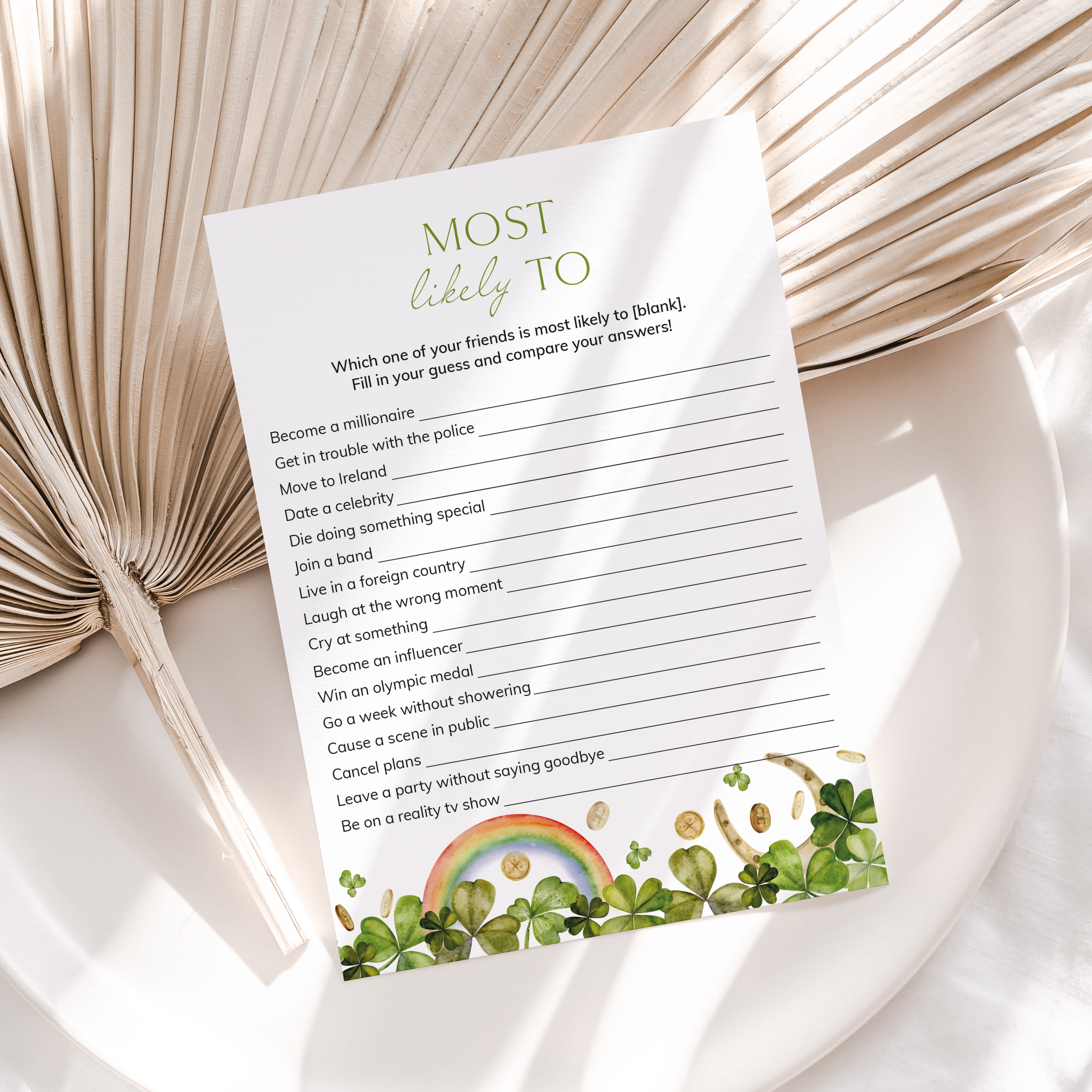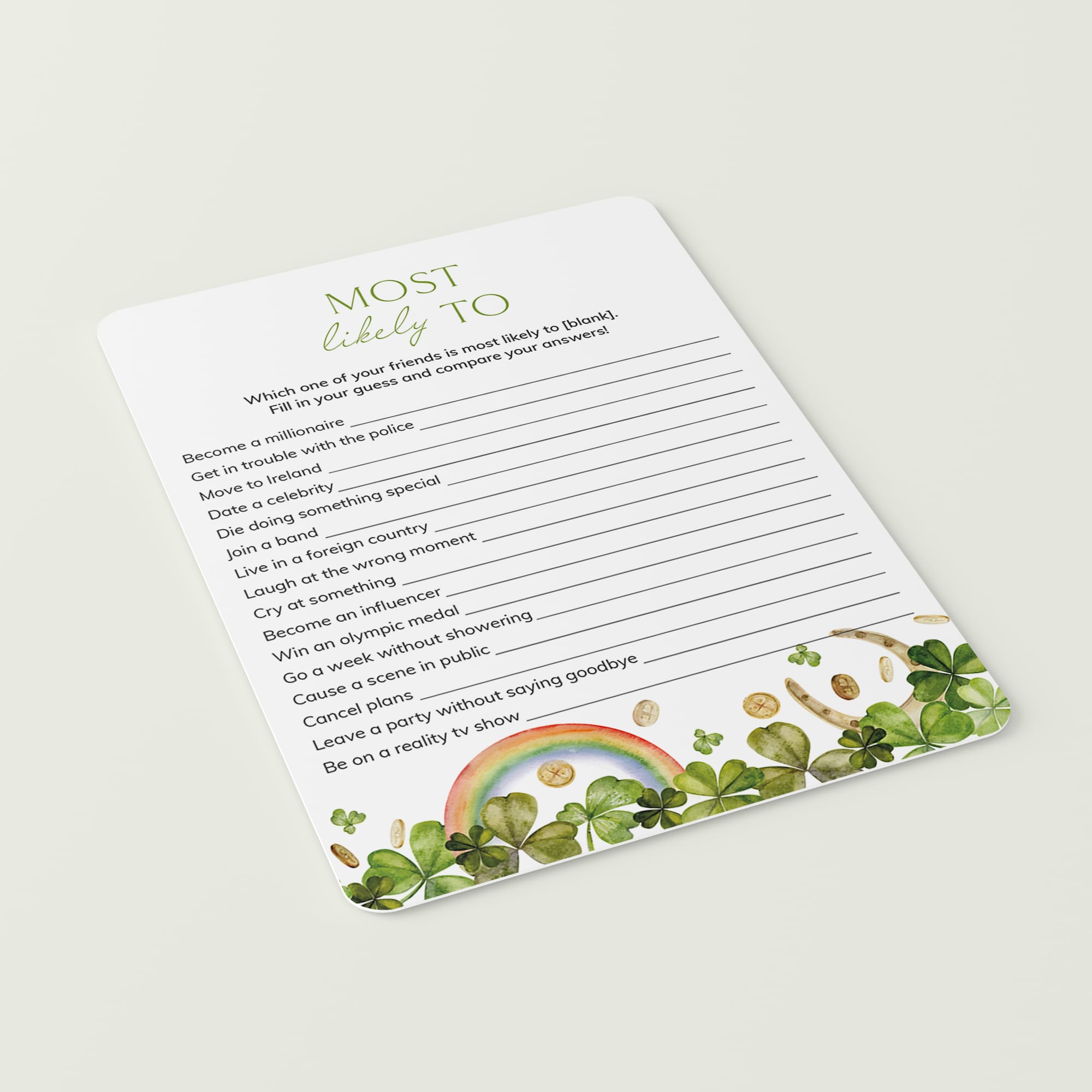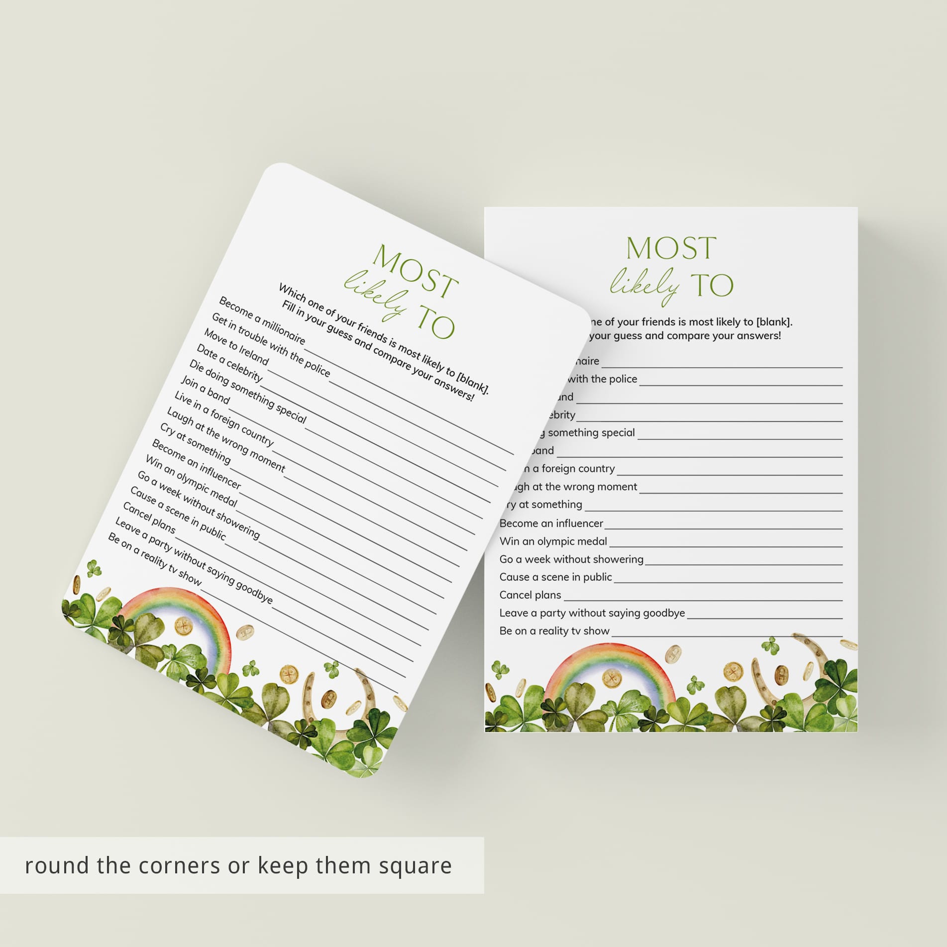 Are you looking for a fun St Patrick's Party game to play with your friends? Play Most Likely To. This funny game with watercolor rainbow and shamrocks has 16 Most Likely To questions for Saint Patrick's Day that will get everyone talking and laughing. You will get to know your friends at some new level.