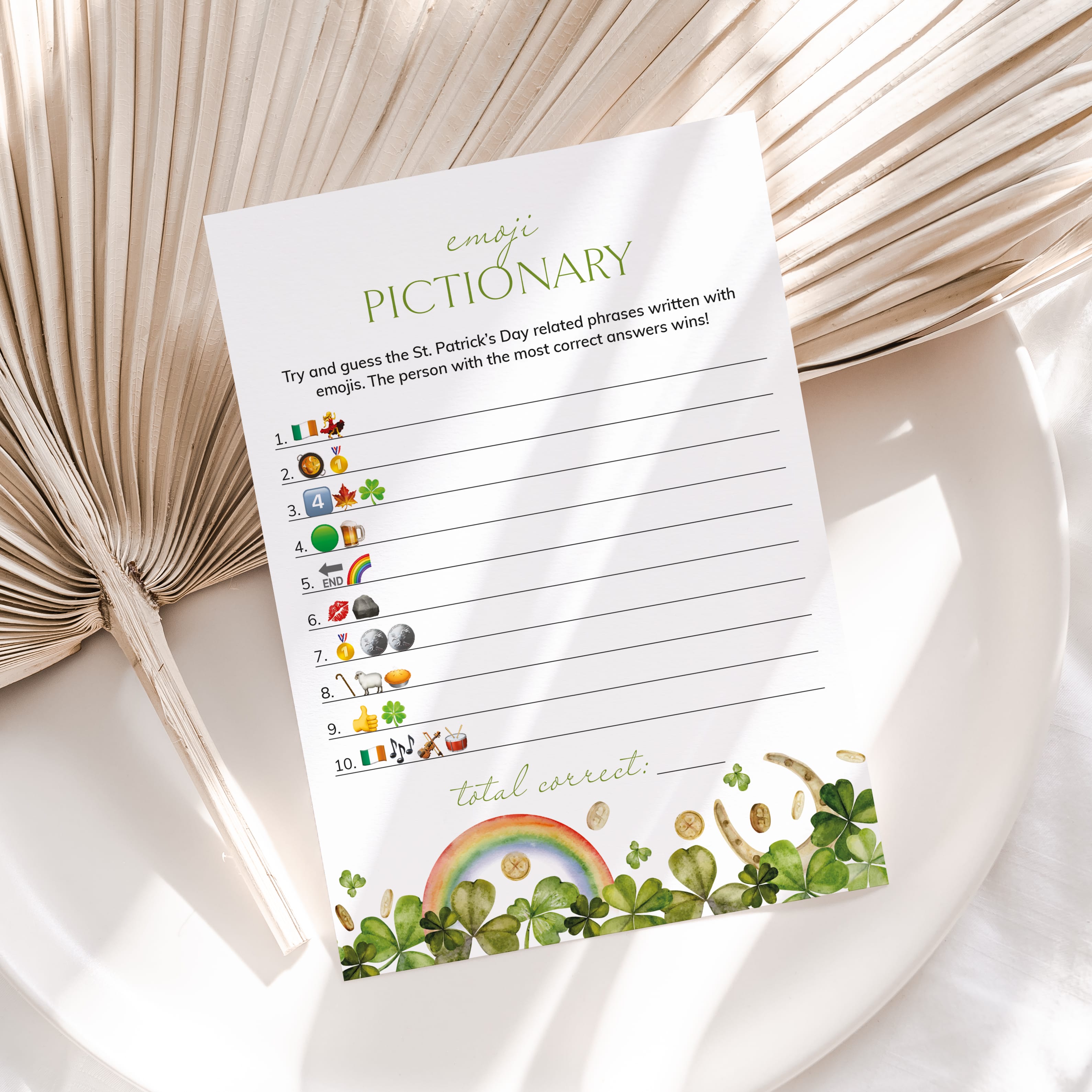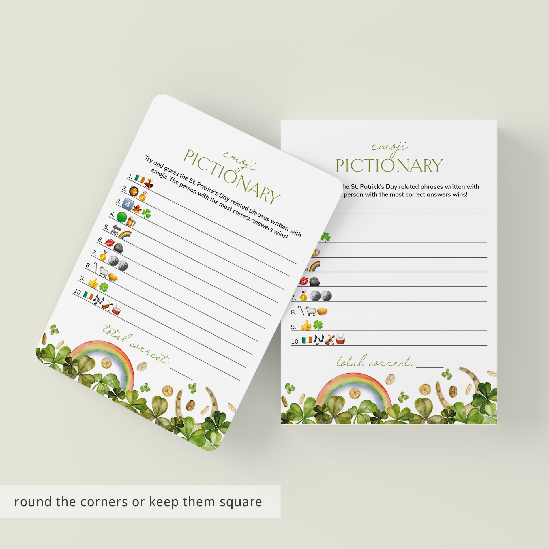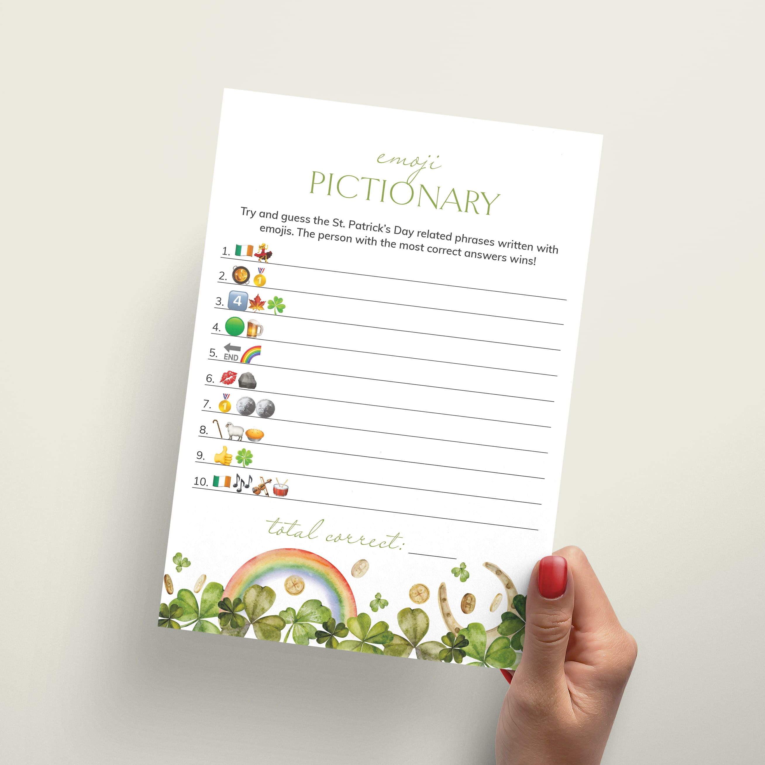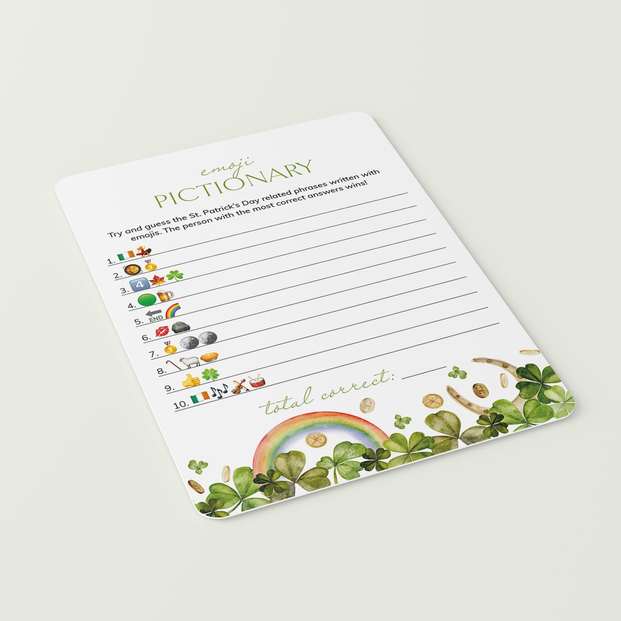 Guess the names of the St. Patrick's Day-related phrases described using emojis we all know. The person with the most correct answers wins. An answer key is included.